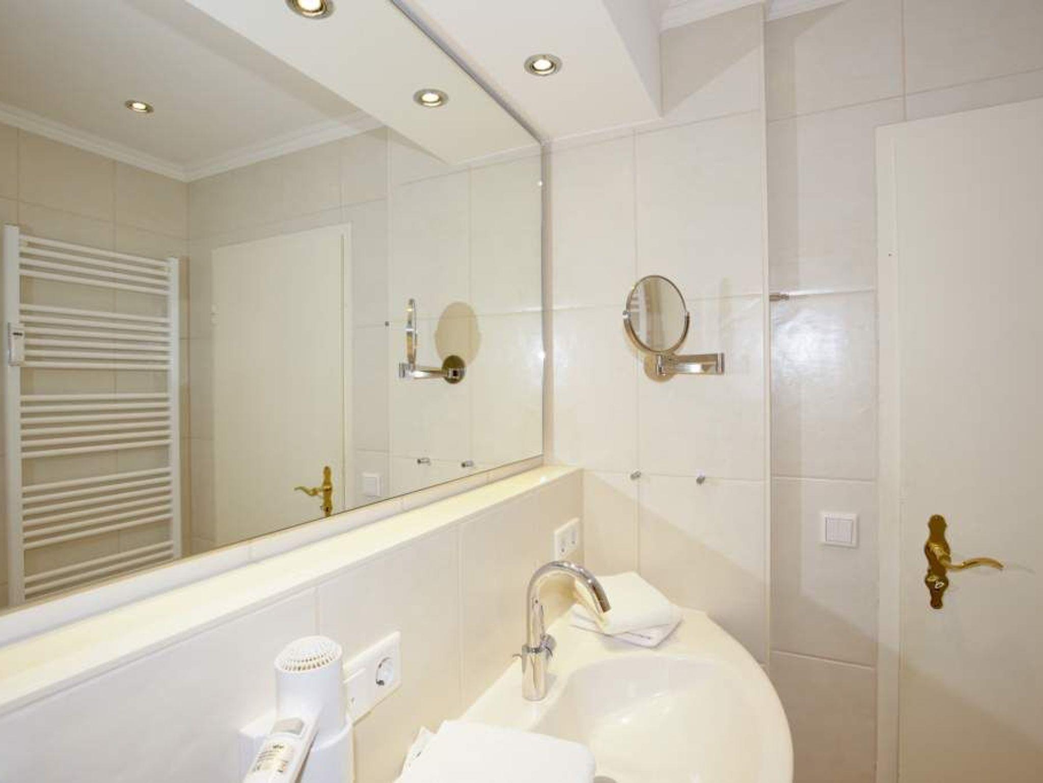Das Bad ist mit hellen Fliesen modern ausgestattet und verfügt über ein Duschbad, WC, Fön und Kosmetikspiegel.