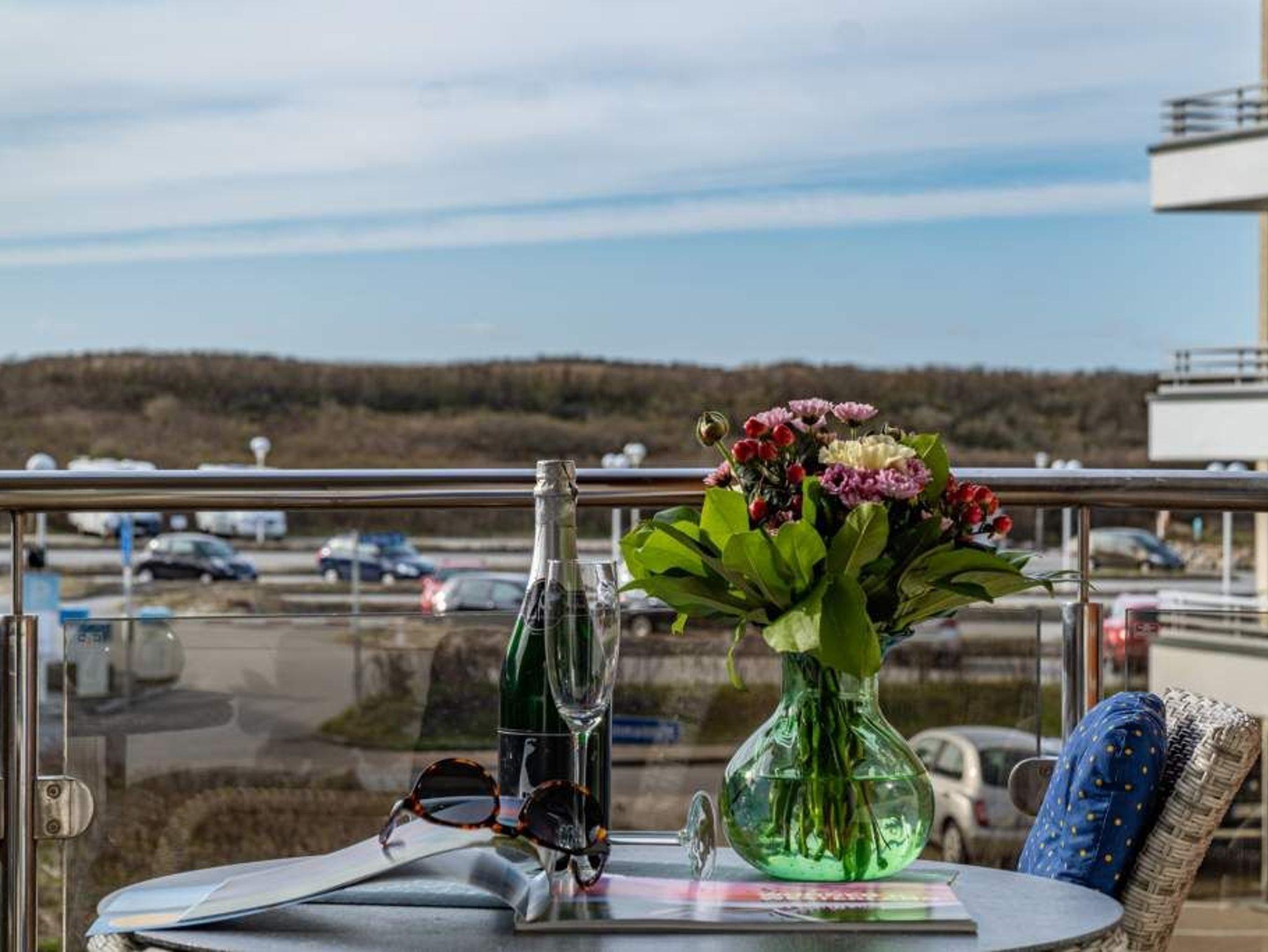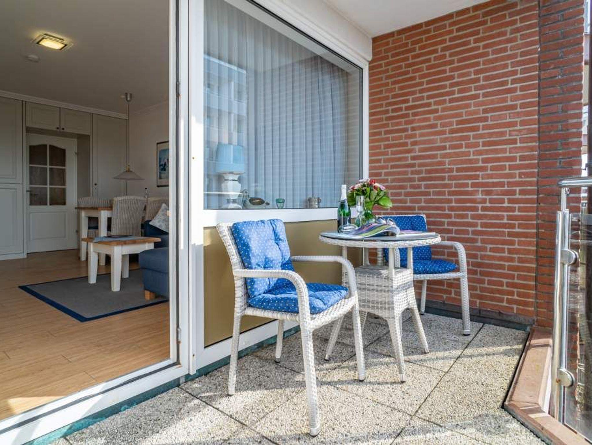 Neu gestaltete Zweiraum-Wohnung (53 qm) mit Inselflair in der 1. Etage für 3 Personen. Auf dem Balkon zur Westseite befinden sich Sitzmöbel und ein kleiner Tisch.