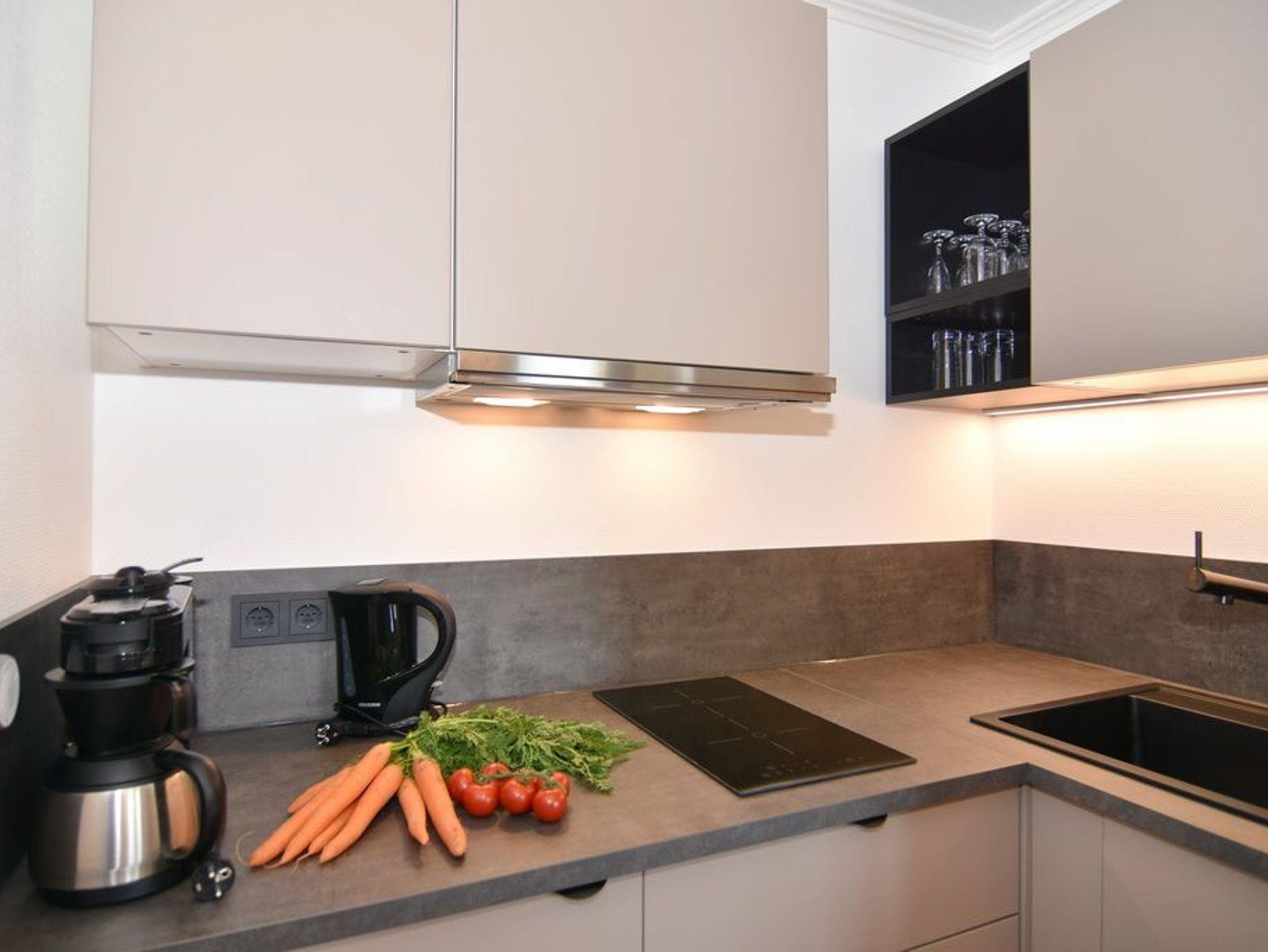 Moderne 1-Zimmer-Ferienwohnung im Erdgeschoß mit Südterrasse und Gartenmöbeln. Ca. 30m². Nichtraucher! Wohn- / Schlafzimmer mit weißer Einbauküche, Essplatz für 2 Personen, 2-Sitzer-Couch, Doppelbett (160x200), Kleiderschrank, Flat-TV, Radio. Duschbad/WC, Diele, Küchenblock. Südterrasse mit Terrassenmöbeln. Unter Haus 4 befindet sich das Schwimmbad mit Finnischer Sauna. Unter Haus 2 befindet sich ein separater Wellnessbereich mit Dampfsauna, Finnischer Sauna und Ruhebereich. Eine Waschküche mit Gemeinschaftswaschmaschine/Trockner ist vorhanden. Offenes W-LAN-Netzwerk steht zur Verfügung (ohne Gewähr). Bettwäsche und Handtücher sind zur Anreise aufgezogen. Ein Garagenstellplatz kann kostenpflichtig gebucht werden!