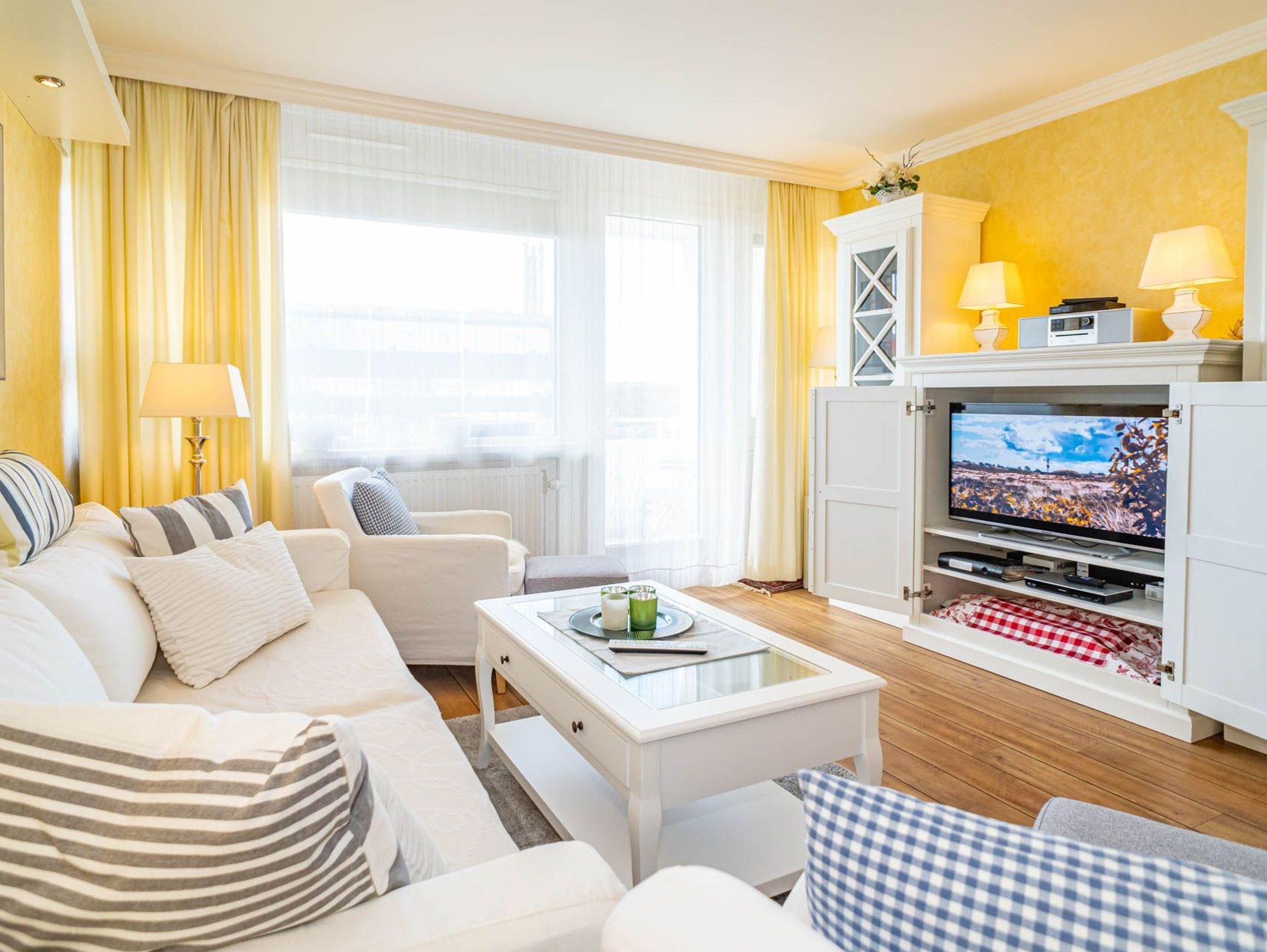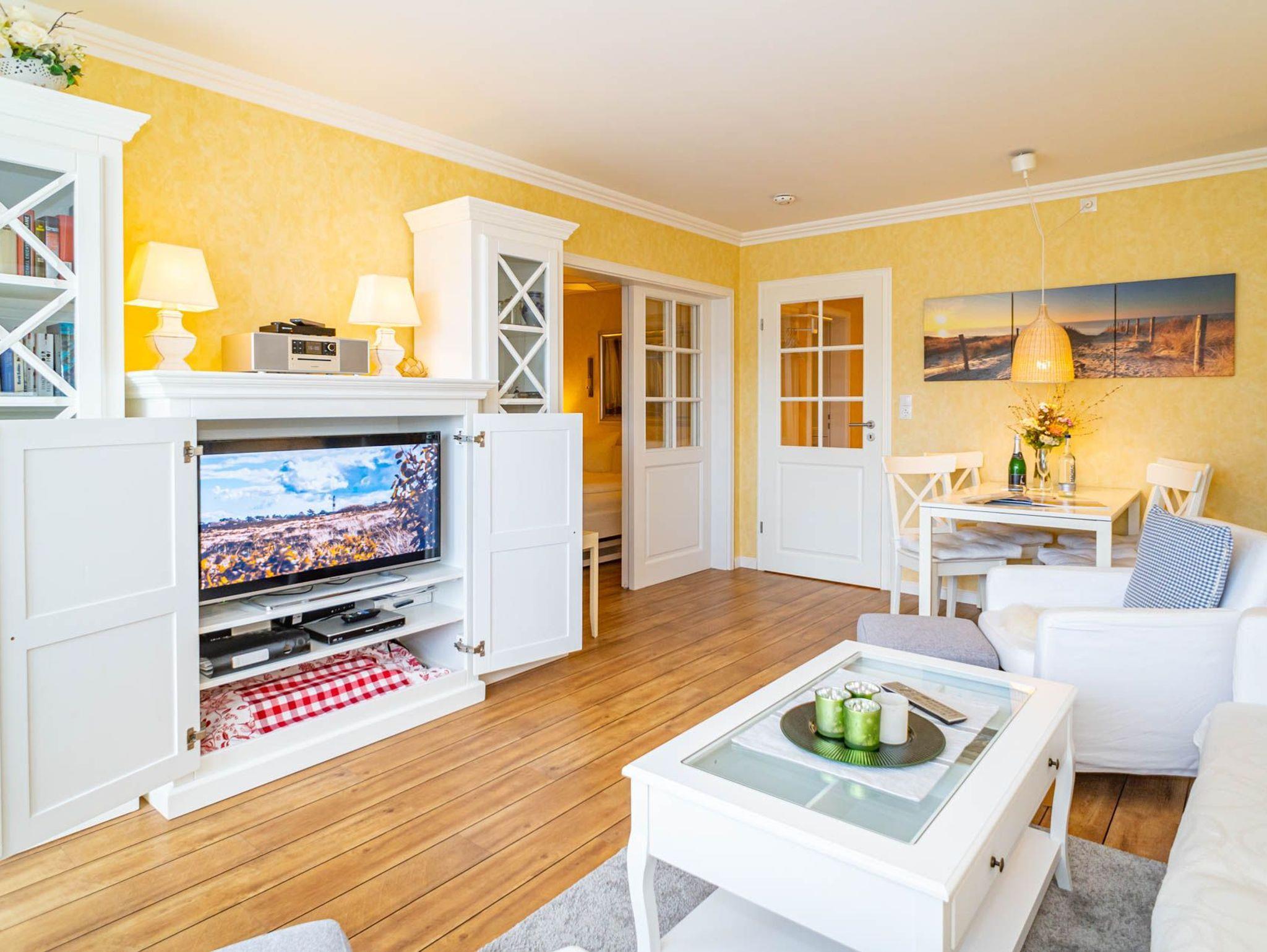 Der Wohnraum besteht aus einer gemütlichen Sitzgarnitur, einem Essplatz, Flachbild-HDTV und Blue-Ray-Player, Radio und einem Telefon inklusive Flatrate für Gespräche ins deutsche Festnetz (Handynummern gesperrt), Verdunklungsrollos.
