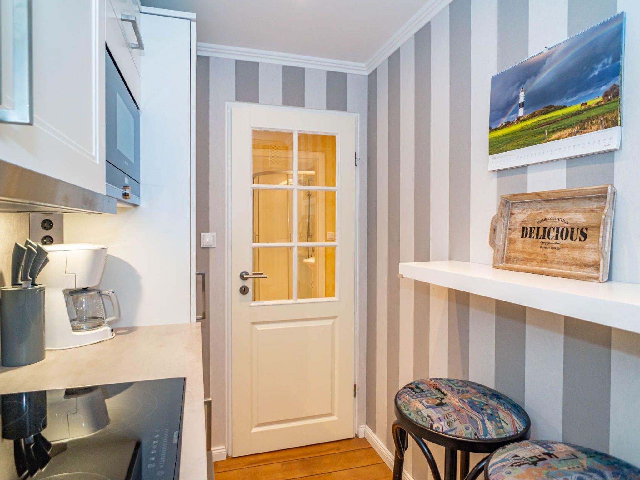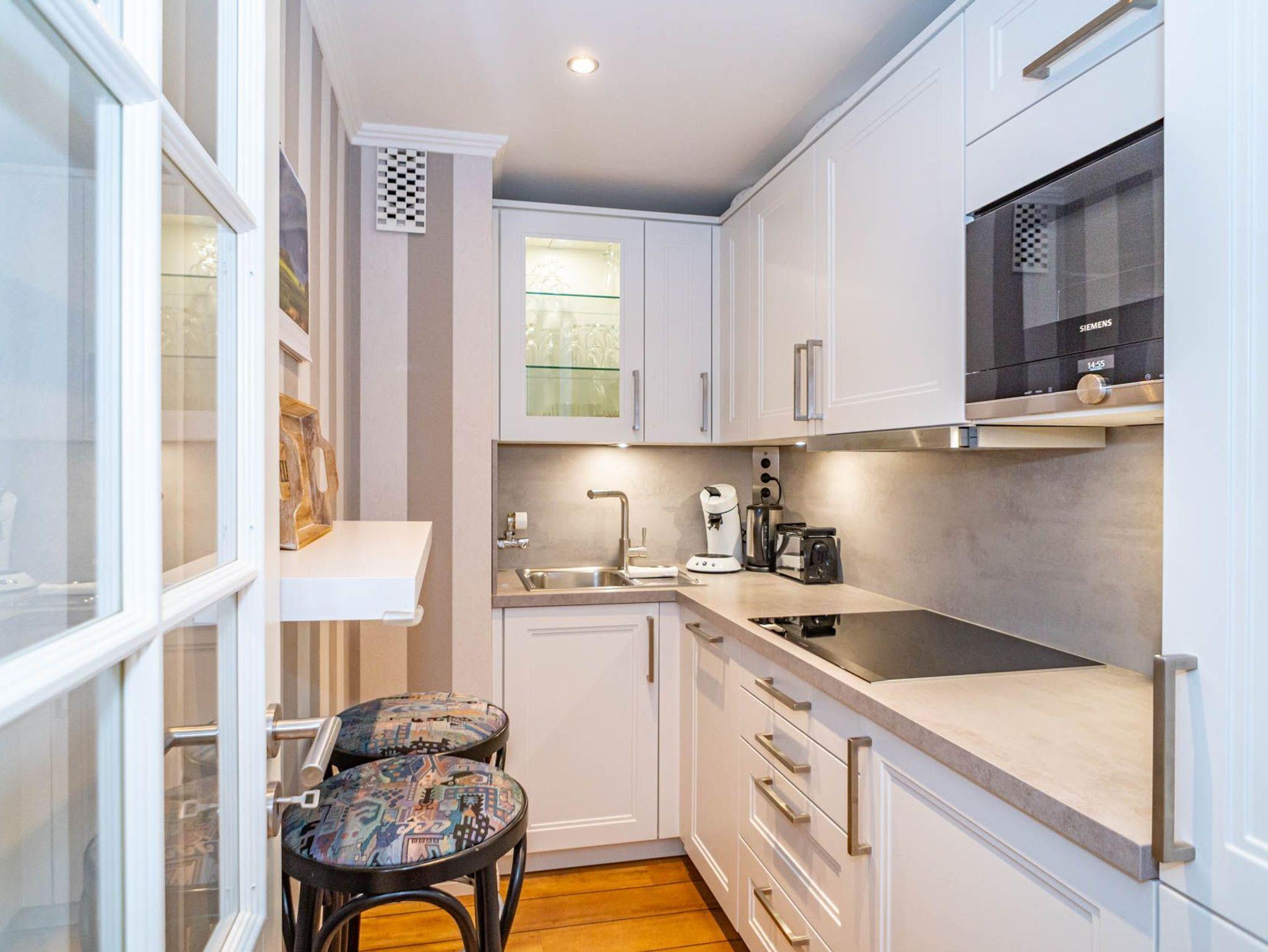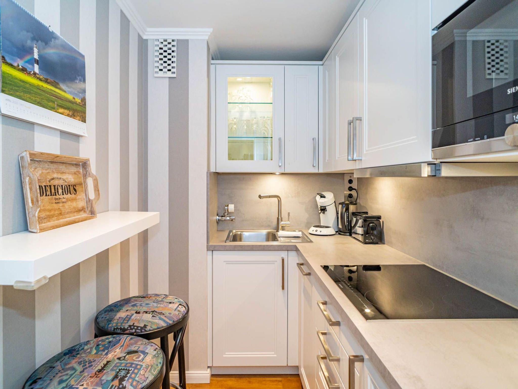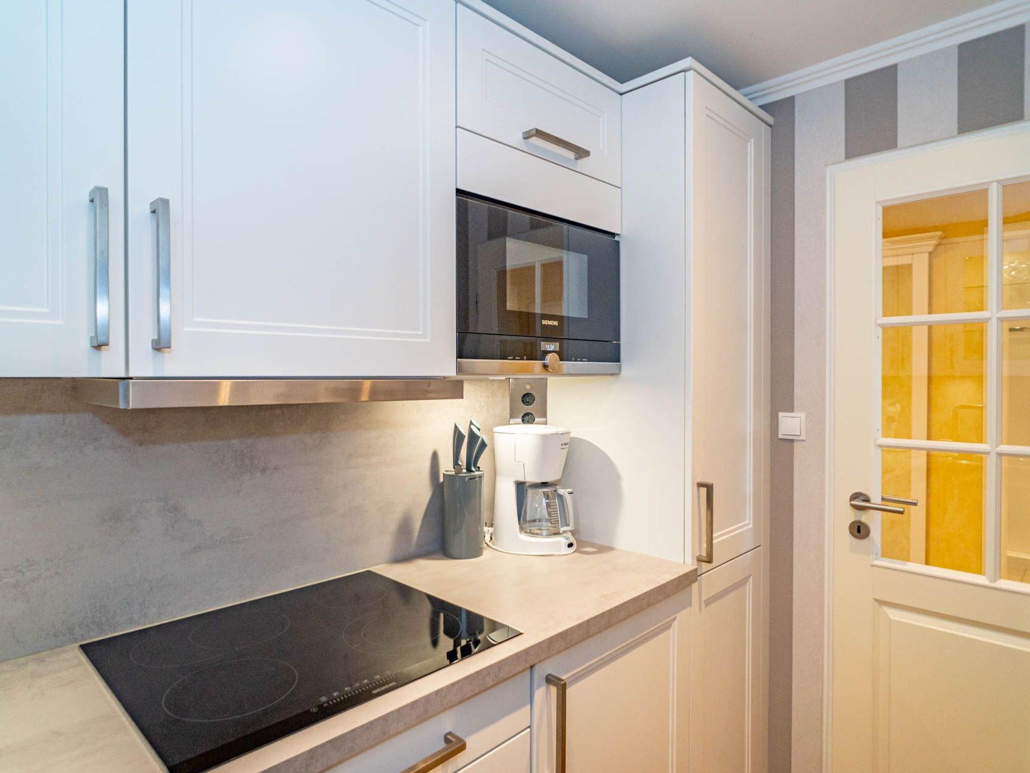 Die Küche hat einen Geschirrspüler, eine Mikrowelle, ein Ceranfeld mit 4 Kochfeldern und einen Kühlschrank. Kaffeemaschine, Senseo-Maschine, Wasserkocher und Toaster gehören zur Grundausstattung.