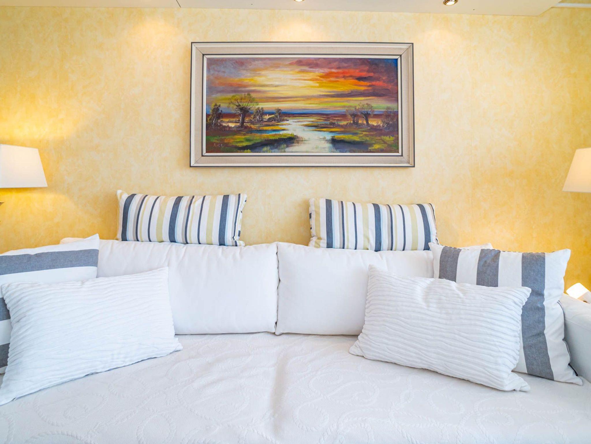Die Schlafnische (durch eine Schiebetür mit Glasfenster vom Wohnzimmer abgetrennt) hat ein Doppelbett mit zwei Einzelmatratzen.