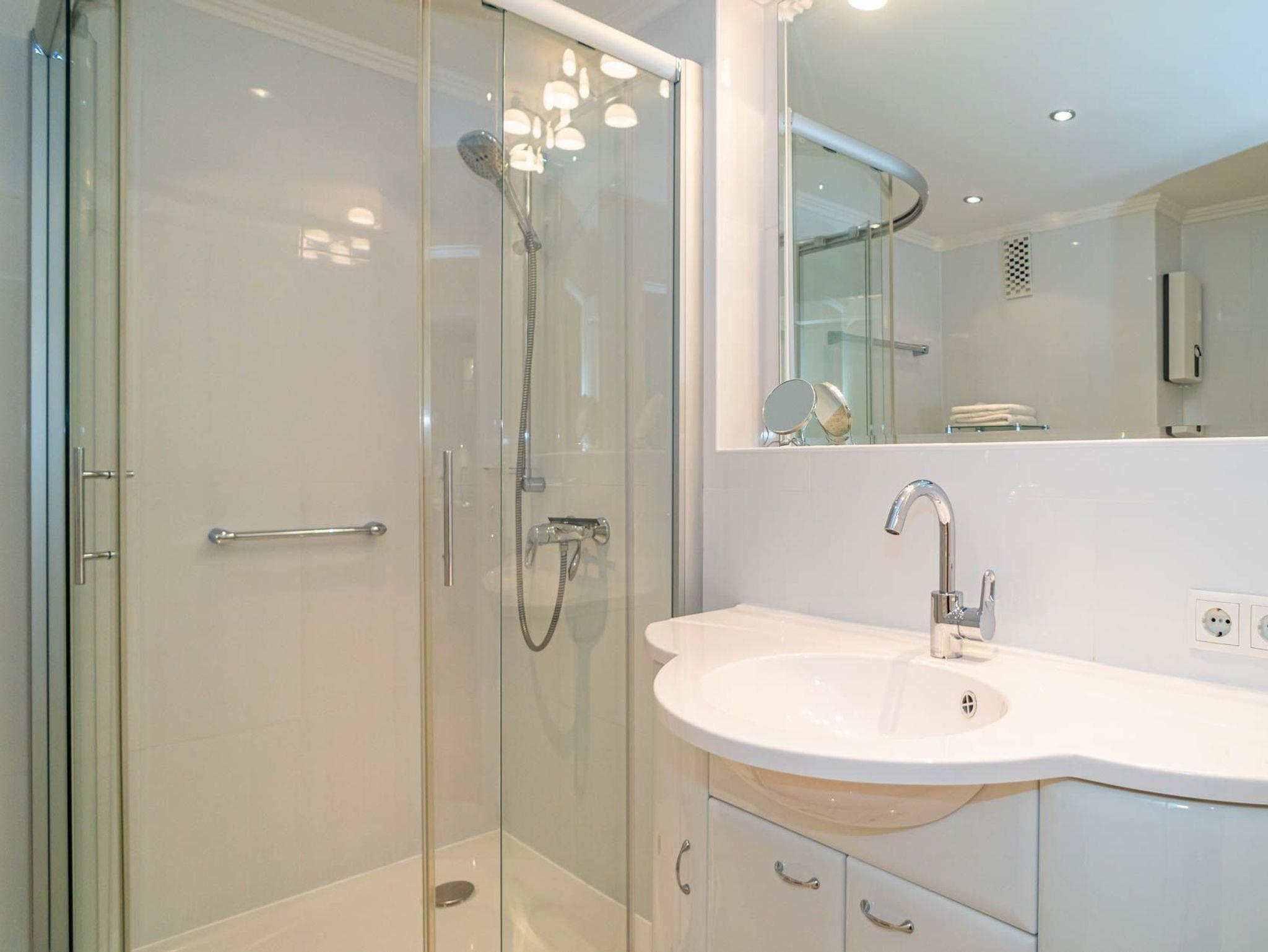 Im Bad befinden sich eine Dusche, ein WC, ein Waschtisch, Radio und ein Fön.