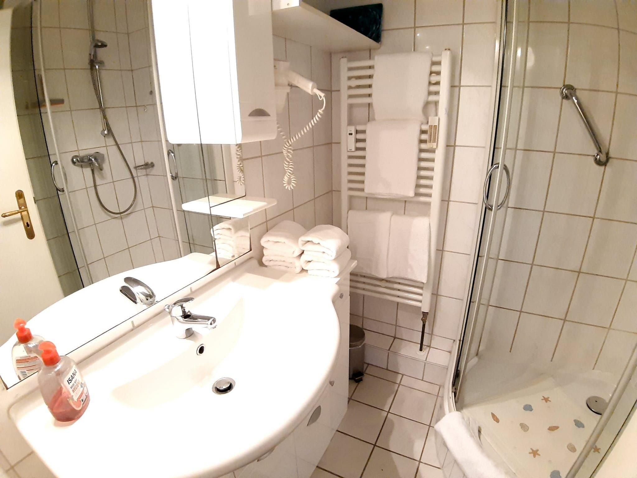 Ein Bad mit Dusche, Waschtisch, Handtuchtrockner, WC und Haartrockner.
