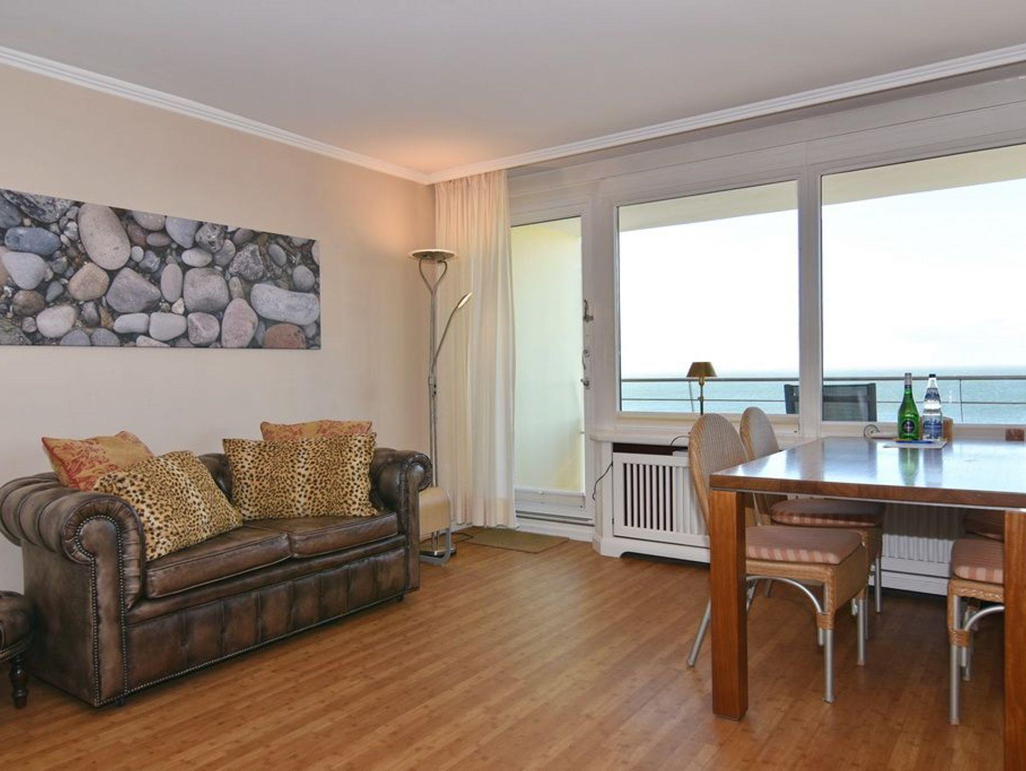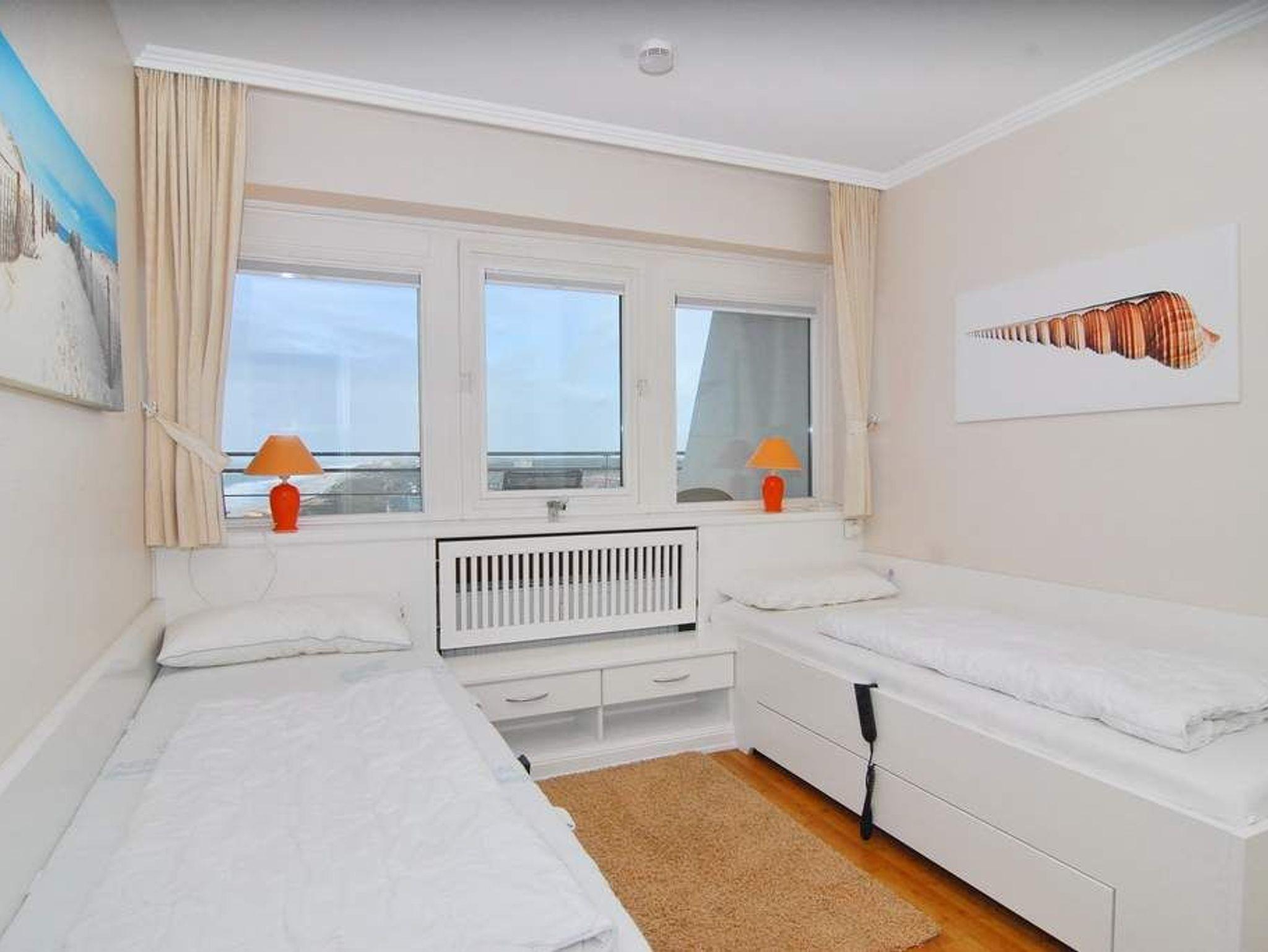 3-Zimmer-Apartment im Haus Metropol zur Seeseite im 9. OG, ca. 88 m², Nord-/ Westecke, Nichtraucher. Wohnraum mit Couch und 2 Sessel, Essplatz, TV, Radio, WLAN (ohne Gewähr), offene Küche mit Esstresen, Geschirrspüler, Mikrowelle und Backofen, Westbalkon mit Meeresblick und Nordbalkon, Schlafzimmer mit Doppelbett und Westbalkon mit Meeresblick, kleines Schlafzimmer mit 2 Einzelbetten (80 x 200), 1 Duschbad/WC und 1 Vollbad/WC, Tierhaltung ist nicht gestattet. Garage/Stellplatz kann zu € 15,--/Nacht gebucht werden. Waschküche und Fahrradkeller befinden sich im Haus. Bettwäsche und Handtücher sind zur Anreise aufgezogen.