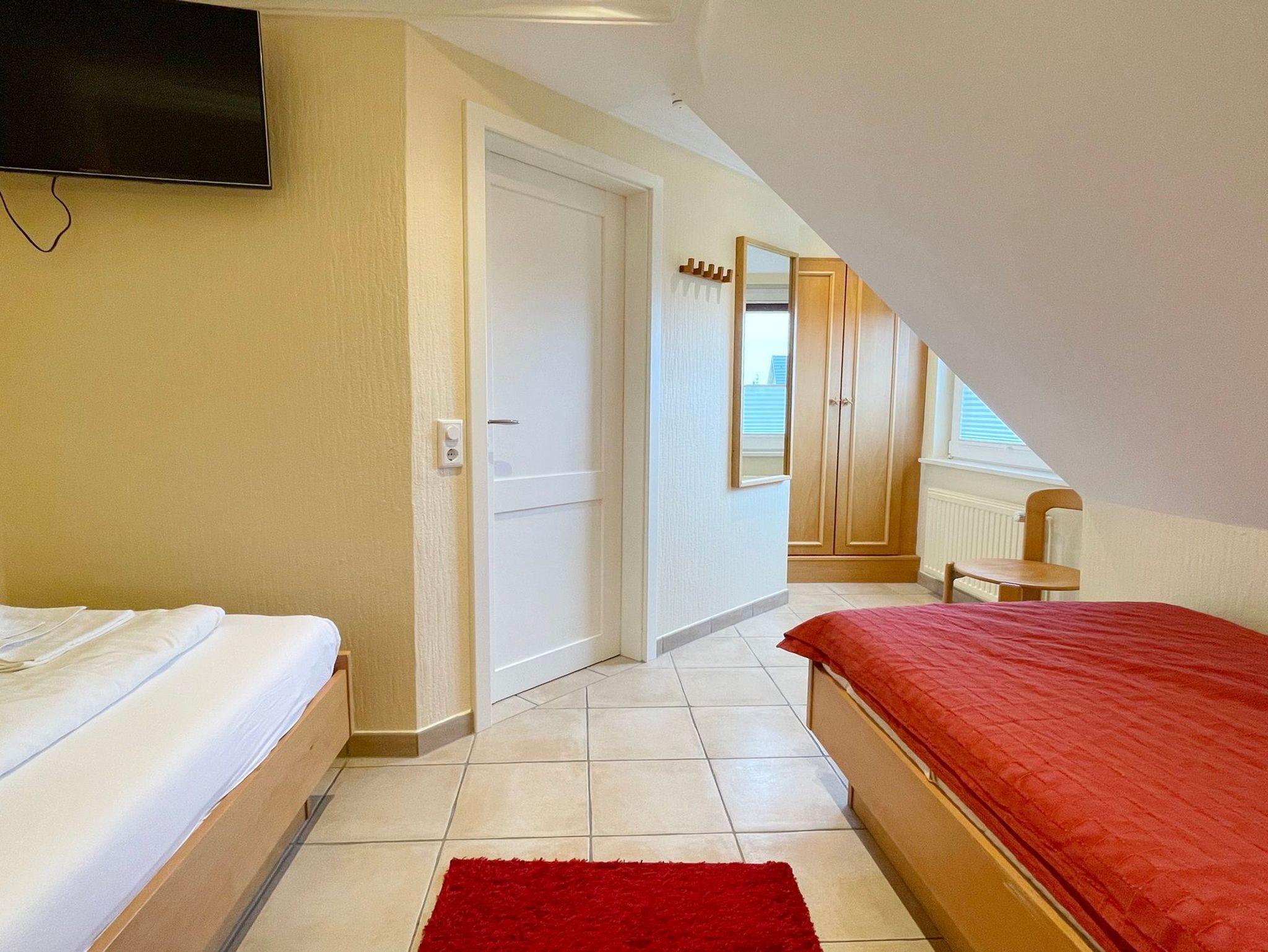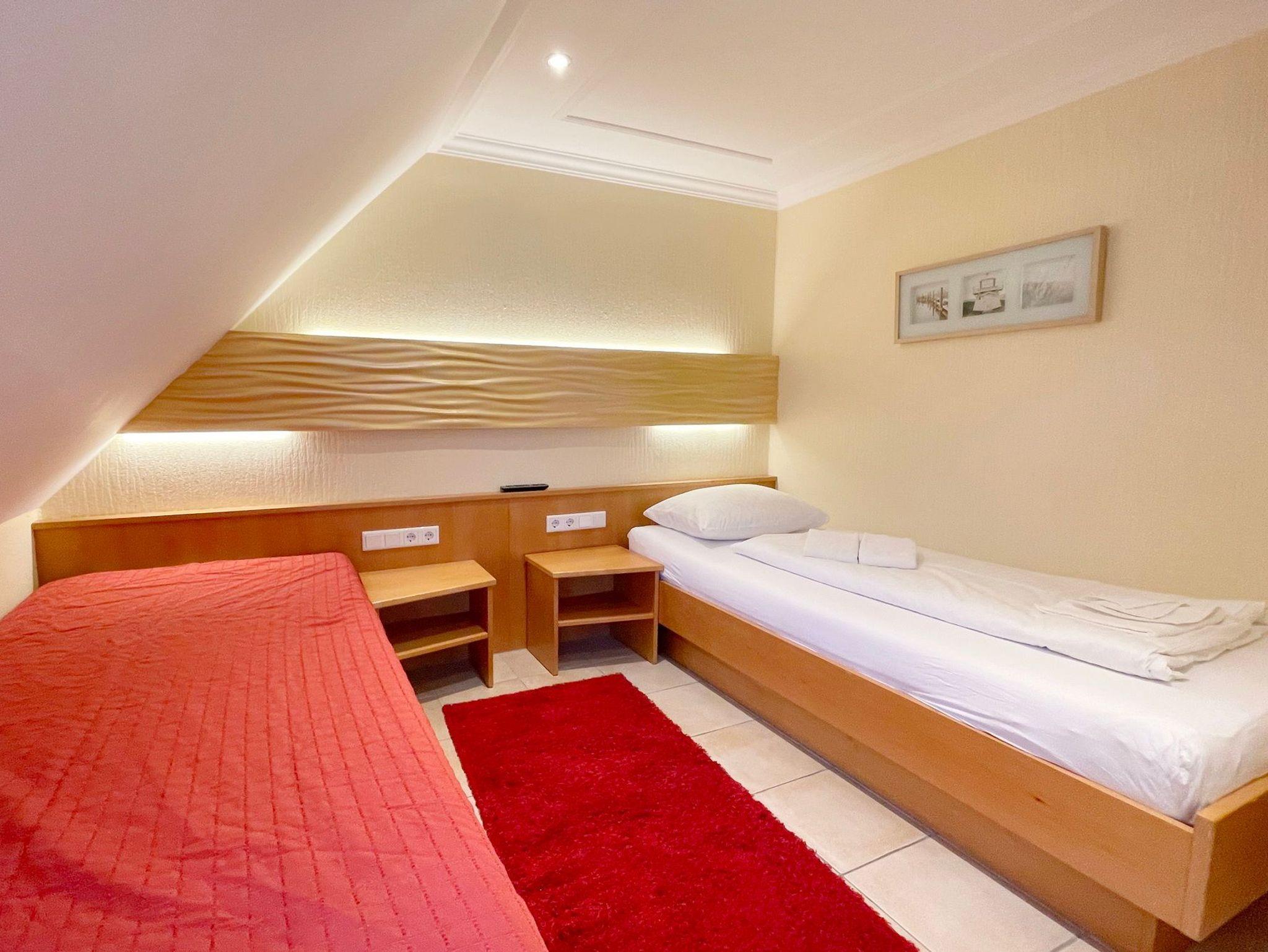 3 Zimmerwohnung mit Balkon (OG und DG), Wohnzimmer mit gemütlicher Sitzgruppe und Eßecke, offene Küche mit Cerankochfeld, und Geschirrspüler, Flatscreen-TV, 2 Schlafzimmer für je 2 Personen mit jeweils eigenem Badezimmer mit Dusche WC und Waschbecken, im UG befinden sich für die Gäste des Hauses Waschmaschine und Trockner gegen Gebühr. 1 PKW-Stellplatz. Gerne dürfen Sie hier ein gut erzogenes Haustier mitbringen. Dafür wird dann eine einmalige Haustiergebühr berechnet.