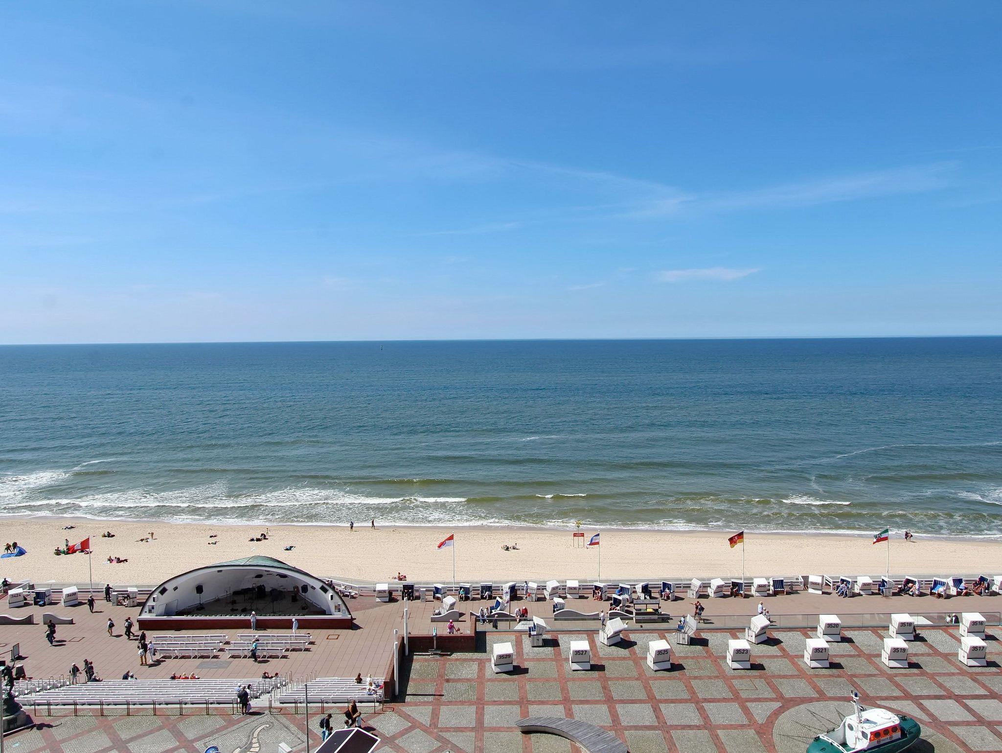 Wunderschöne Einzimmerwohnung in der 6. Etage im Haus Metropol mit herrlichem Blick über Strand und Nordsee. Der Wohn-/Schlafraum mit vorgelagertem, großen Westbalkon ist hell und freundlich eingerichtet. Ein Doppelschrankbett, Essplatz mit 2 Rattanstühlen am Fenster sowie eine komfortable, ansprechende Sitzgruppe und Fernsehsessel mit Fußhocker sind vorhanden. Das Badezimmer hat eine Dusche. Im Flur befindet sich eine Einbauküche mit Ceranfeld, Mikrowelle und Geschirrspüler. Zur technischen Ausstattung gehört: ein Flachbildfernseher und ein Radio mit CD Spieler. Ein freies WLAN Netzwerk (WEG Haus Metropol - Passwortfrei - ohne Gewähr) steht ihnen kostenfrei zur Verfügung. Wohnungsgröße: ca. 42 m².