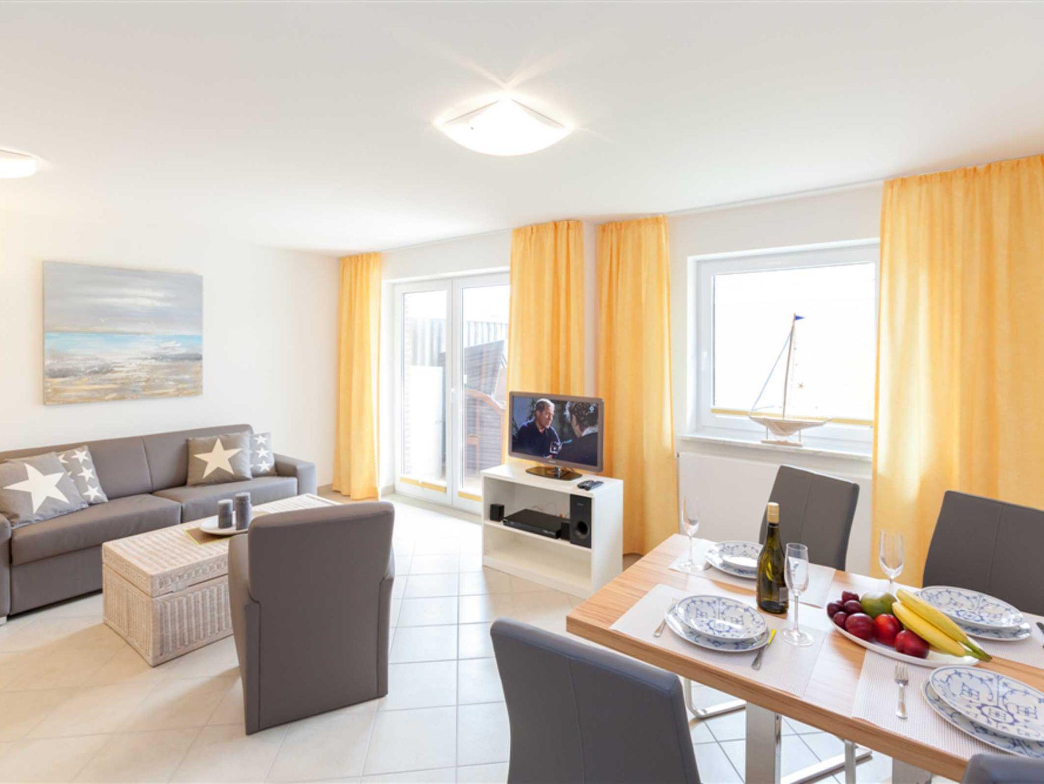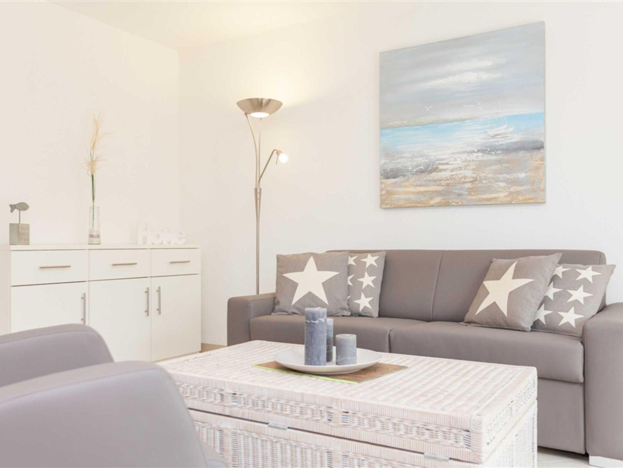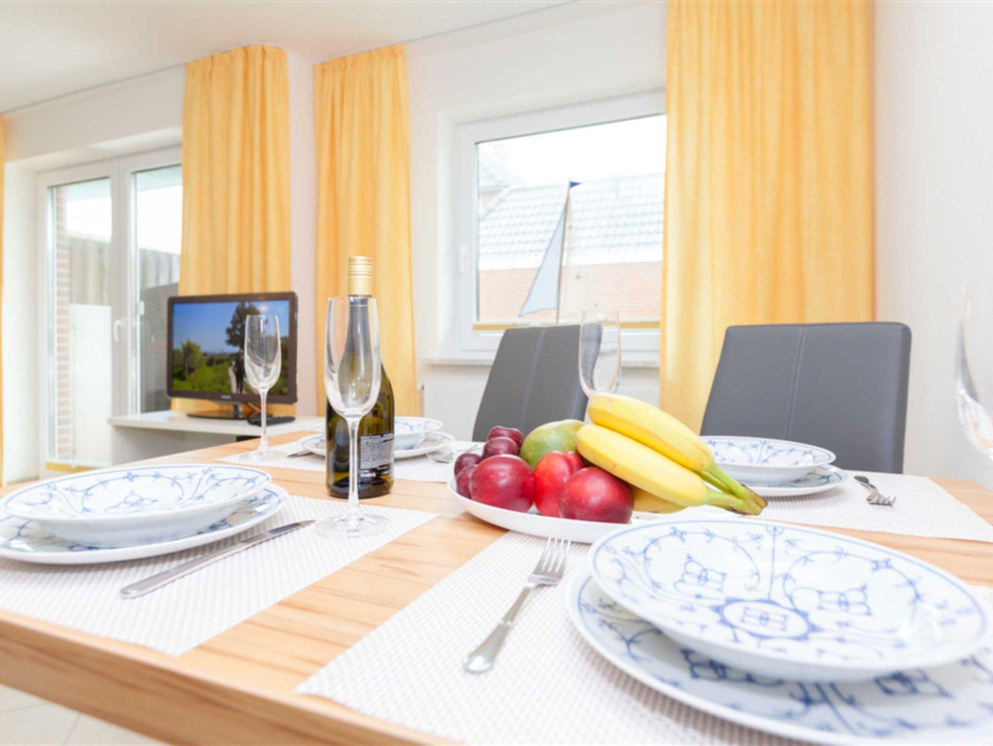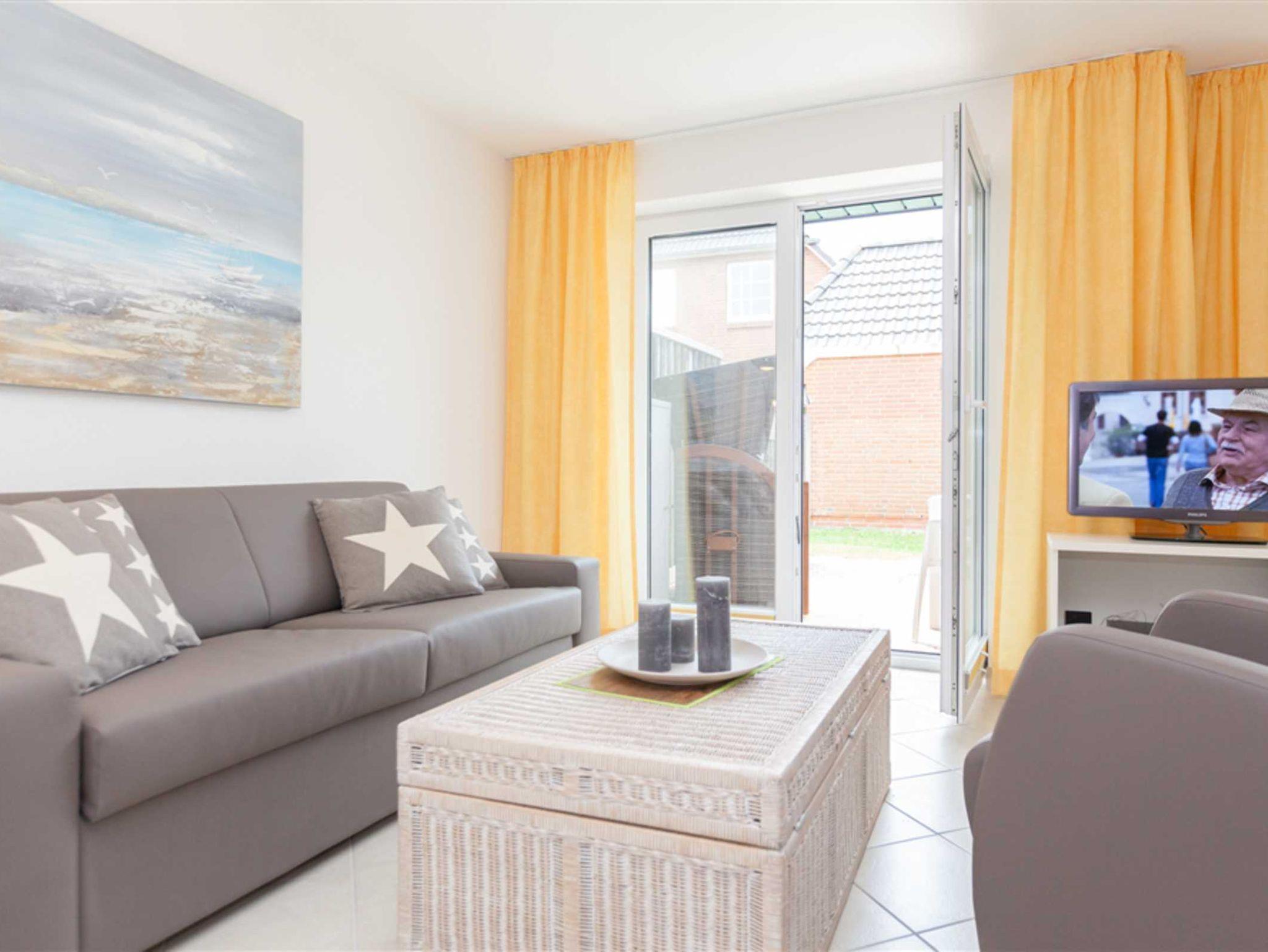 Ihre Unterkunft verfügt über einen kleinen Flur mit Garderobe, ein Duschbad/WC, einen großzügig gefliesten Wohnraum, eine neue Küchenzeile, eine Essecke und eine gemütliche Sofaecke mit großem Flat-TV. Vom Wohnzimmer aus gelangen Sie auch zur Süd-Terrasse, die mit Gartenmöbeln und Strandkorb eingerichtet ist. Das Schlafzimmer verfügt über ein Doppelbett und Außenjalousien.