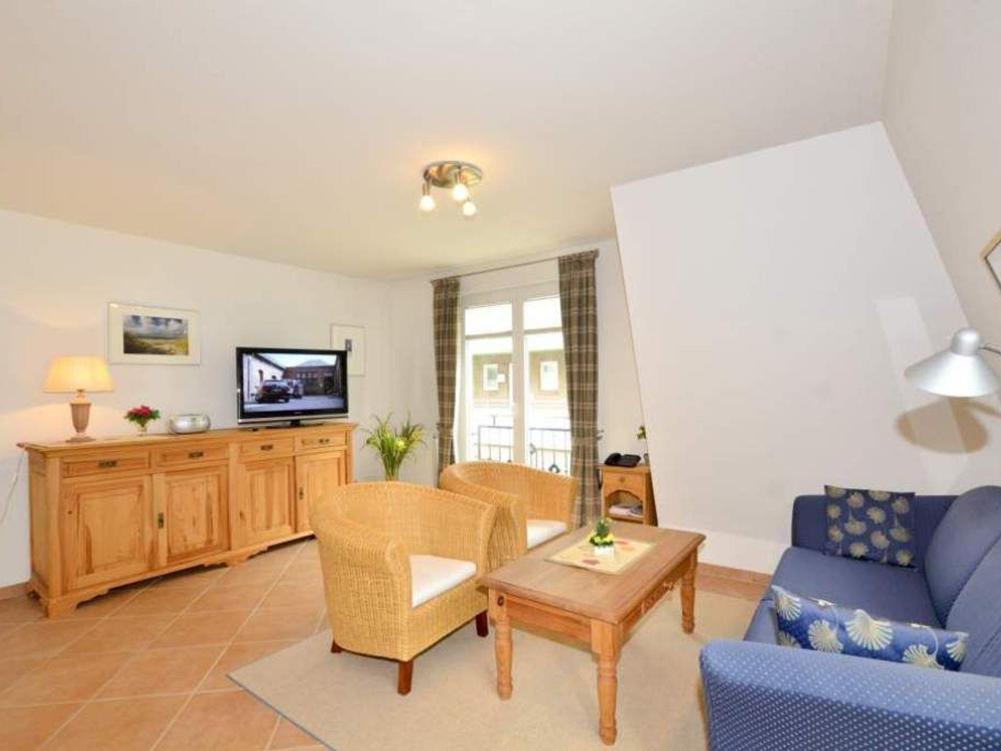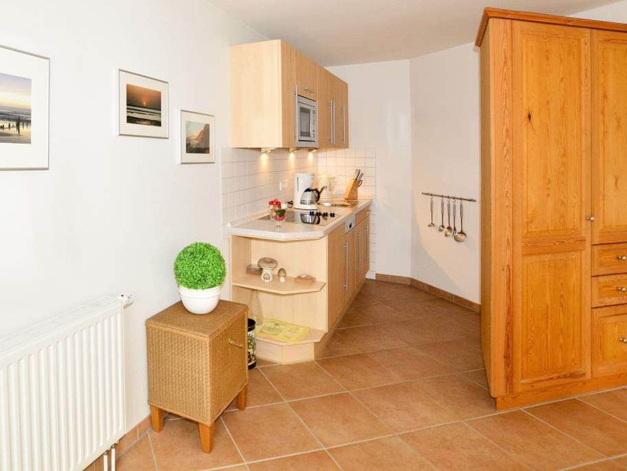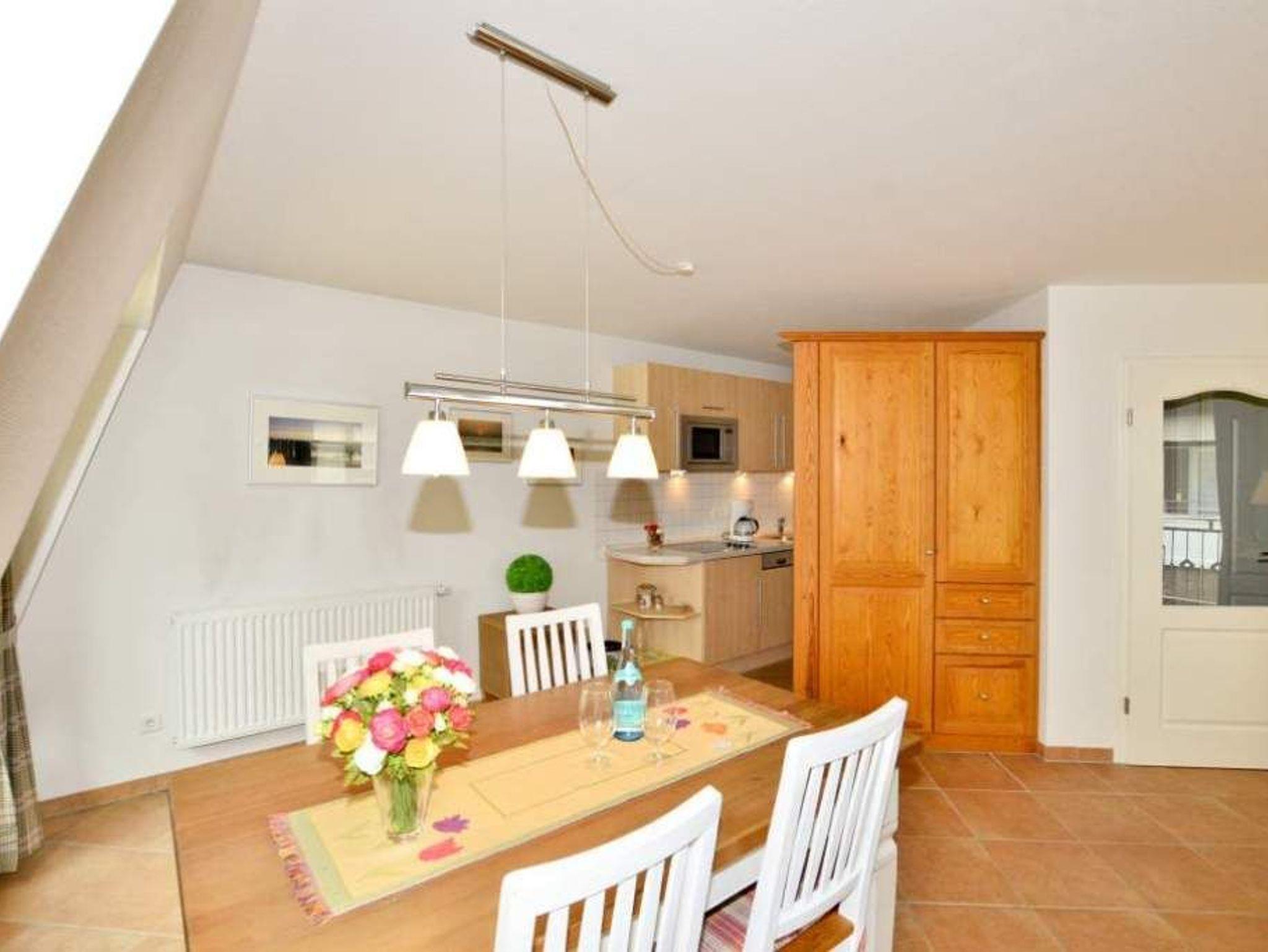 Der Wohnraum ist mit einer hochwertigen Couchgarnitur, einem separaten Essplatz, großem Flatscreen-TV, Internetradio, Telefon mit Internet- und Telefonflatrate sowie offener Einbauküche ausgestattet. Die moderne Einbauküche besitzt neben Geschirrspüler, Mikrowelle mit Grillfunktion, Nespressomaschine und Ceranfeld mit 4 Kochfeldern einen Kühlschrank mit 3-Sterne-Gefrierfach. Kaffeemaschine, Wasserkocher und Toaster gehören zum Grundstandard.