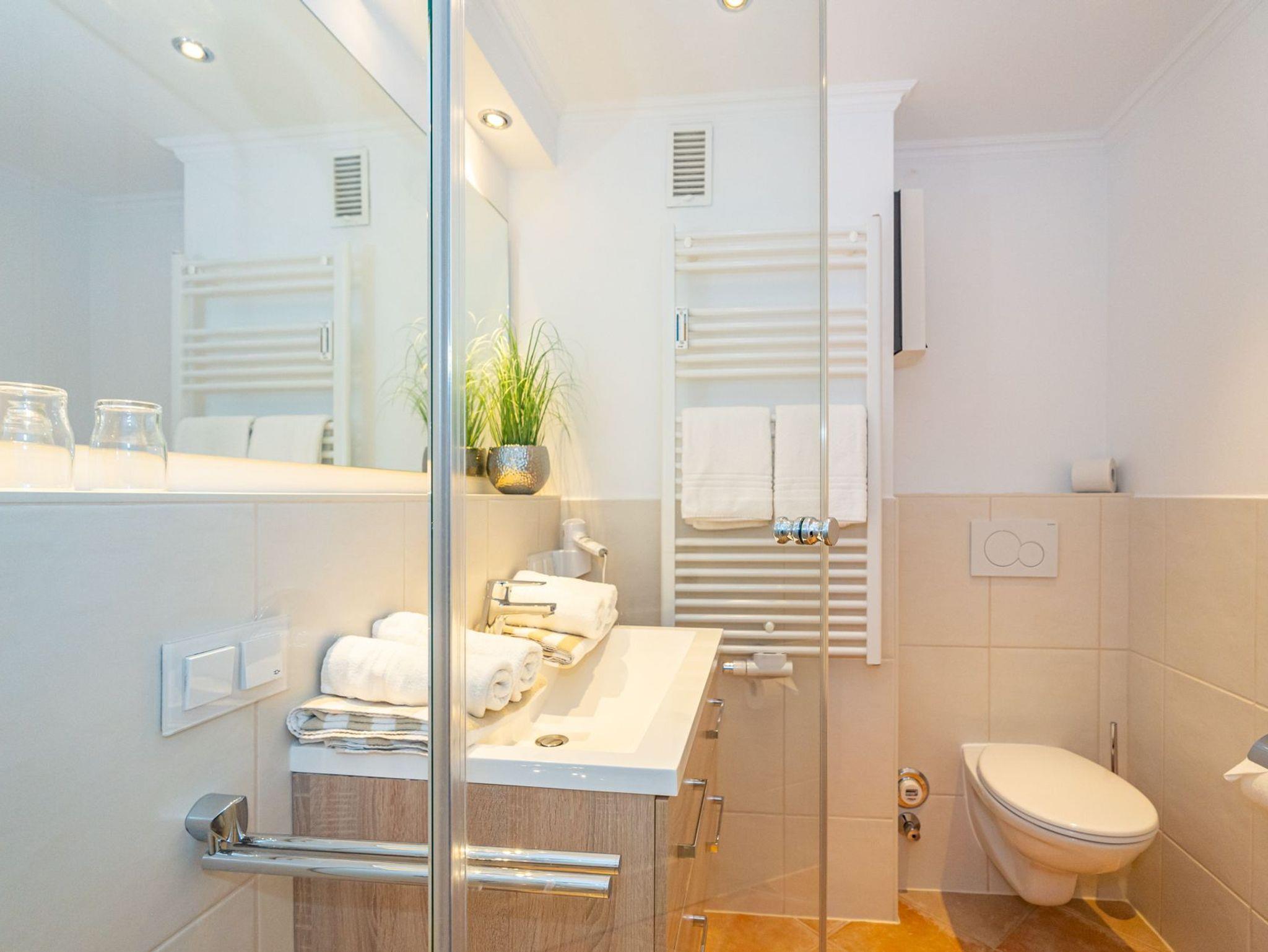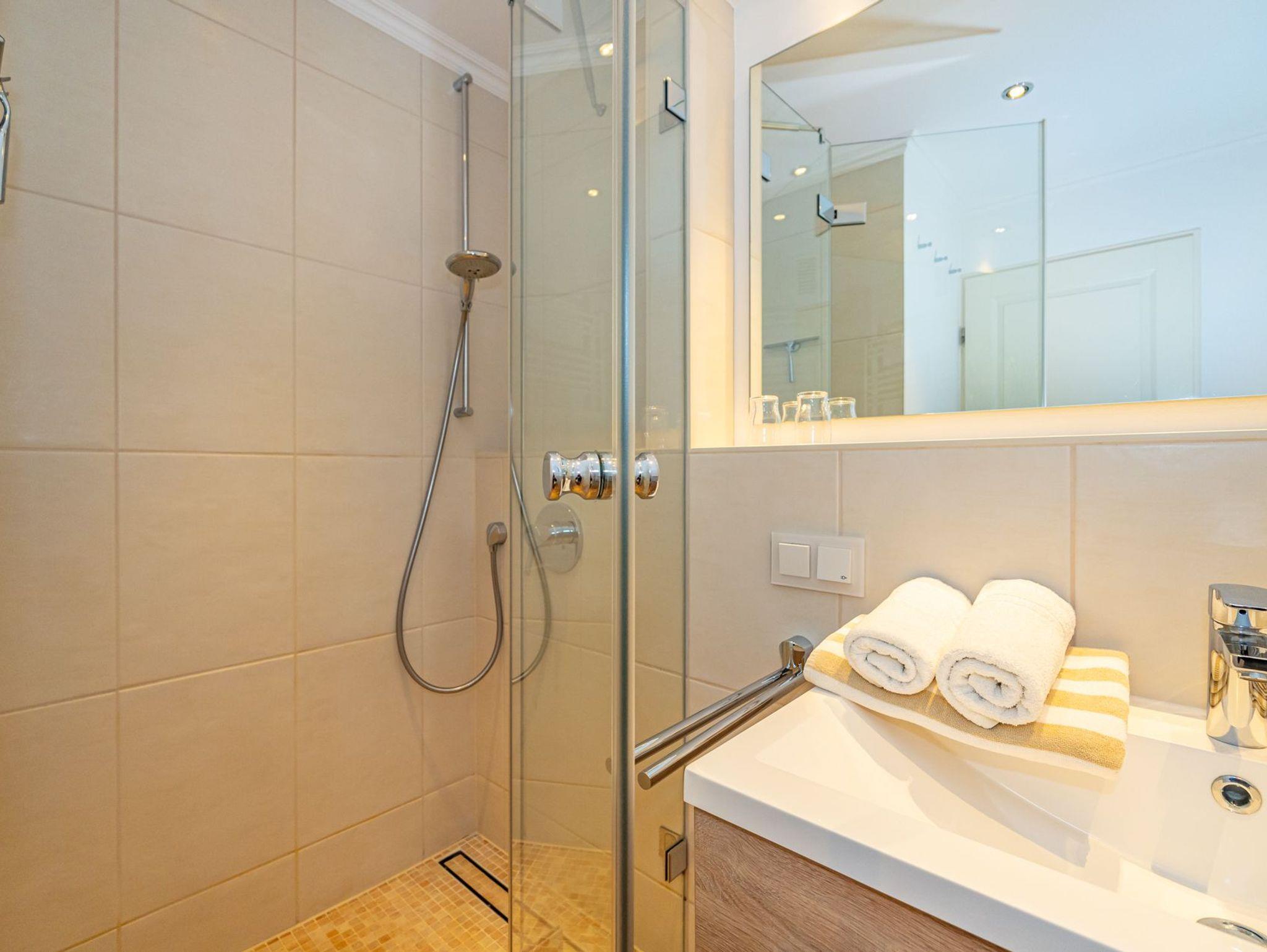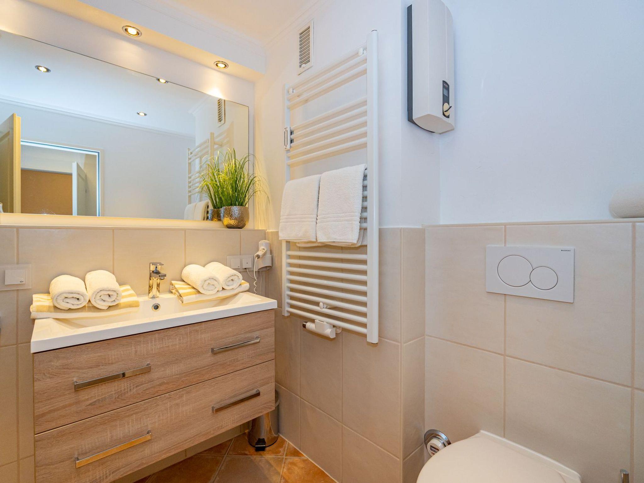 Das neue, helle Badezimmer ist mit einer Dusche mit extraflachem Einstieg, einem Waschtisch, ein WC und einem festinstallierten Fön ausgestattet.