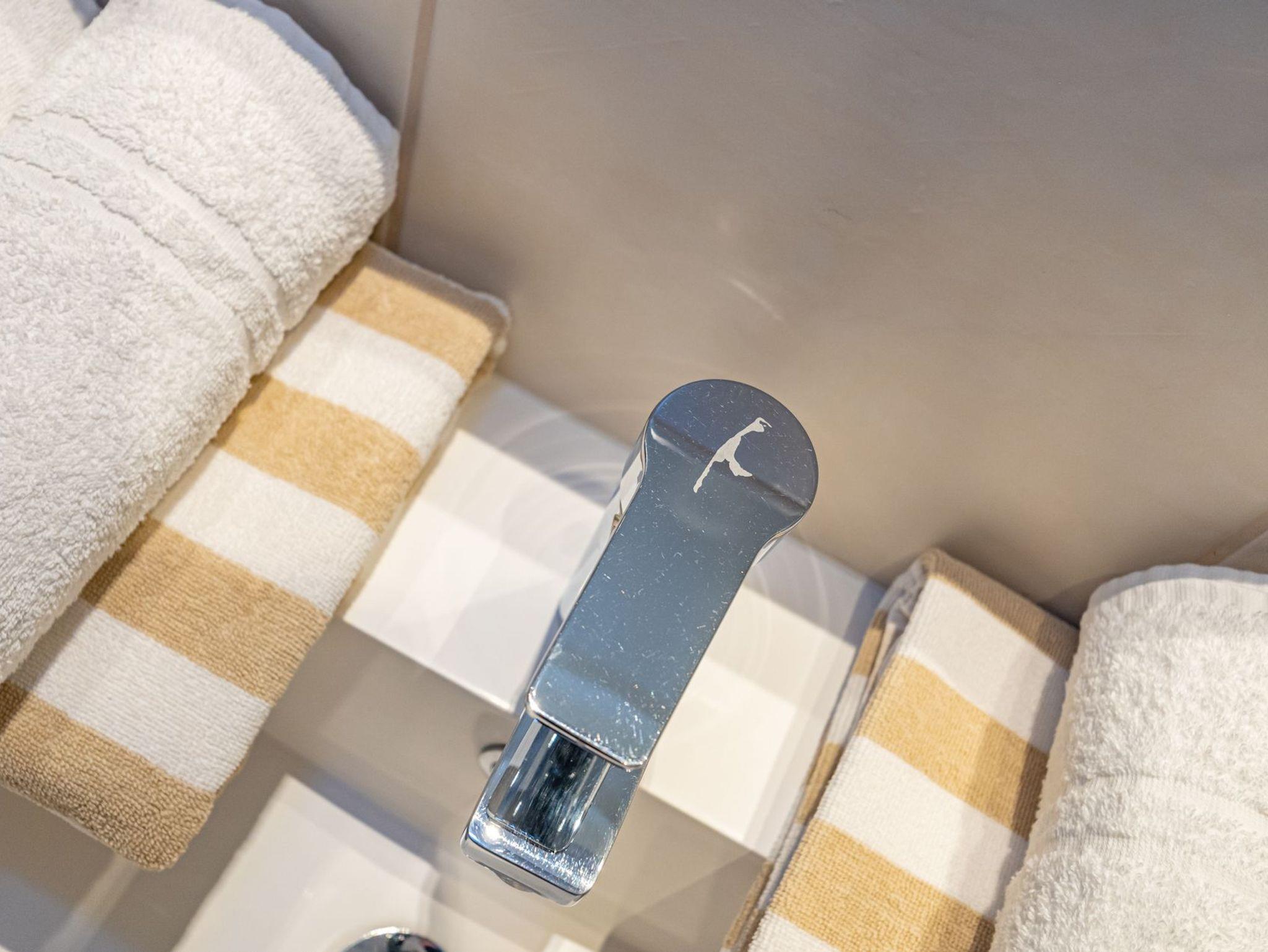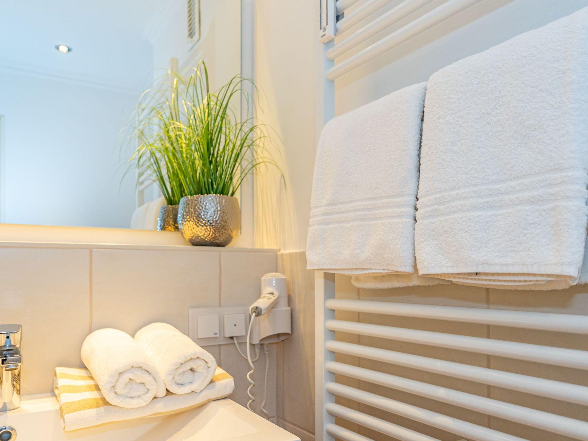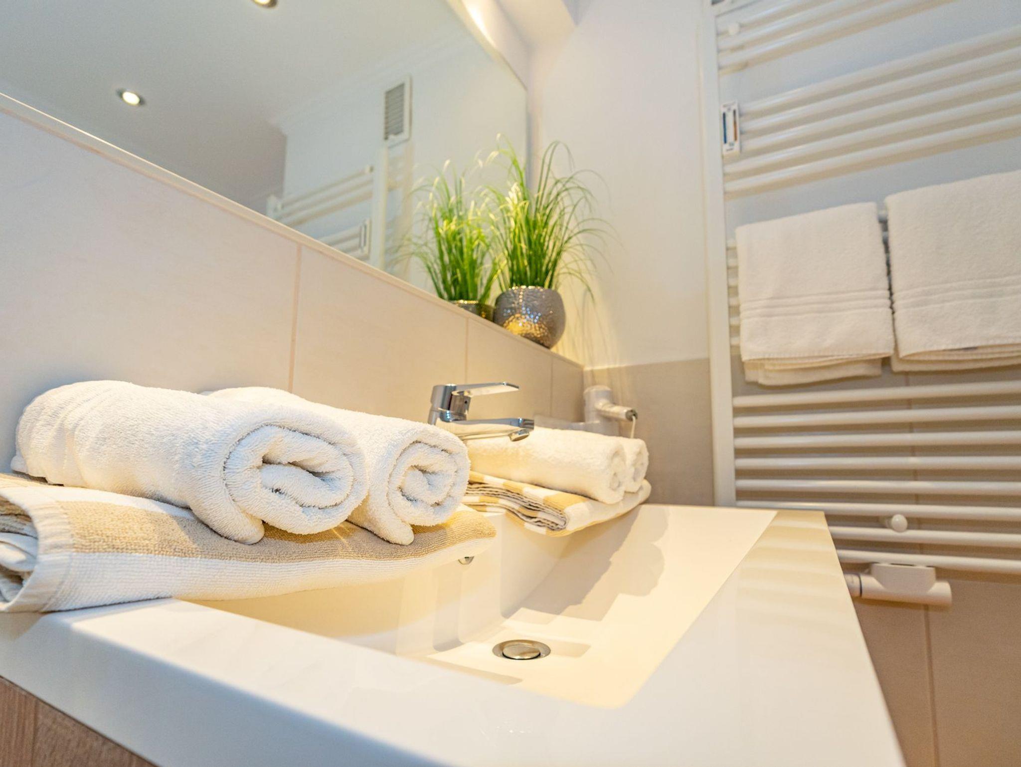 Das neue, helle Badezimmer ist mit einer Dusche mit extraflachem Einstieg, einem Waschtisch, ein WC und einem festinstallierten Fön ausgestattet.