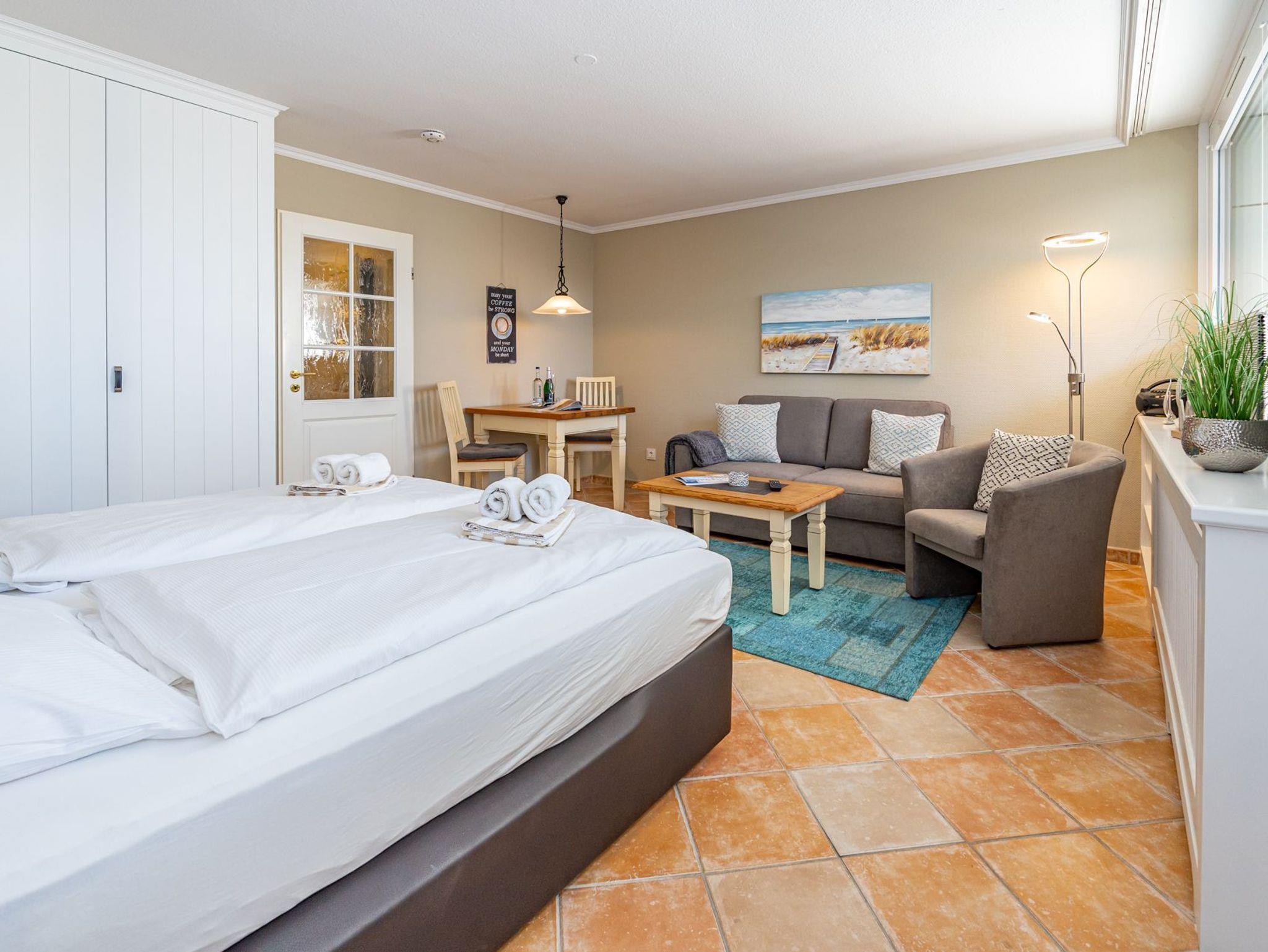 Der Wohn-/Schlafraum besteht aus einer gemütlichen Sitzgarnitur (Zweisitzer und einem Sessel mit Fußhocker), einem neues Boxspringbett (zwei Einzelmatratzen), einem Essplatz, Kabel-Flachbild-TV, Radio.