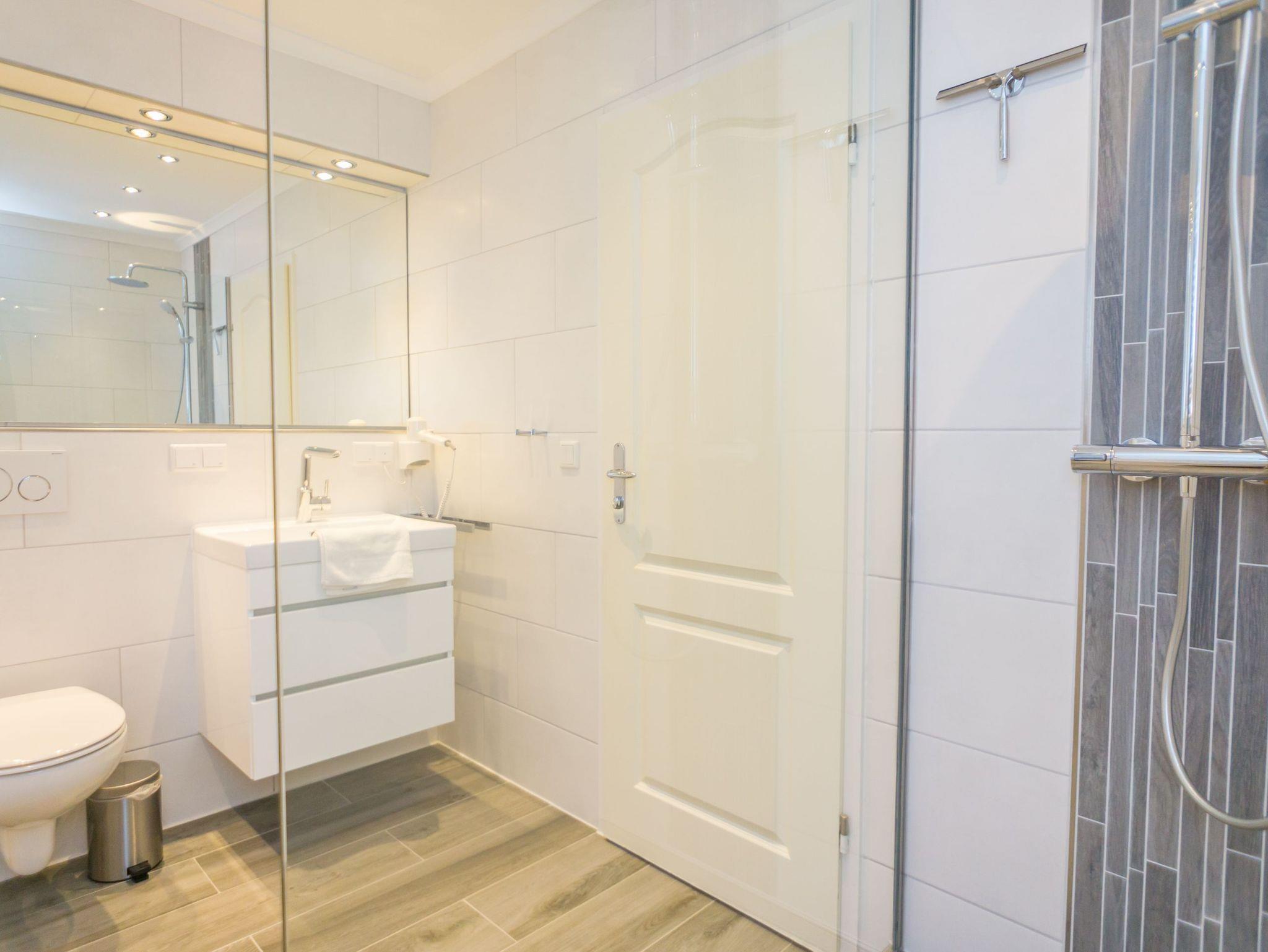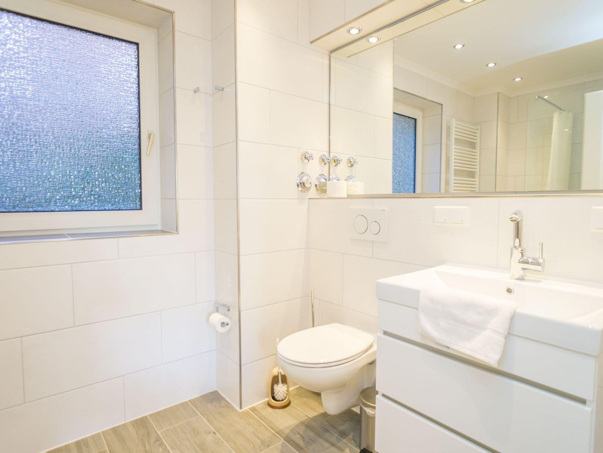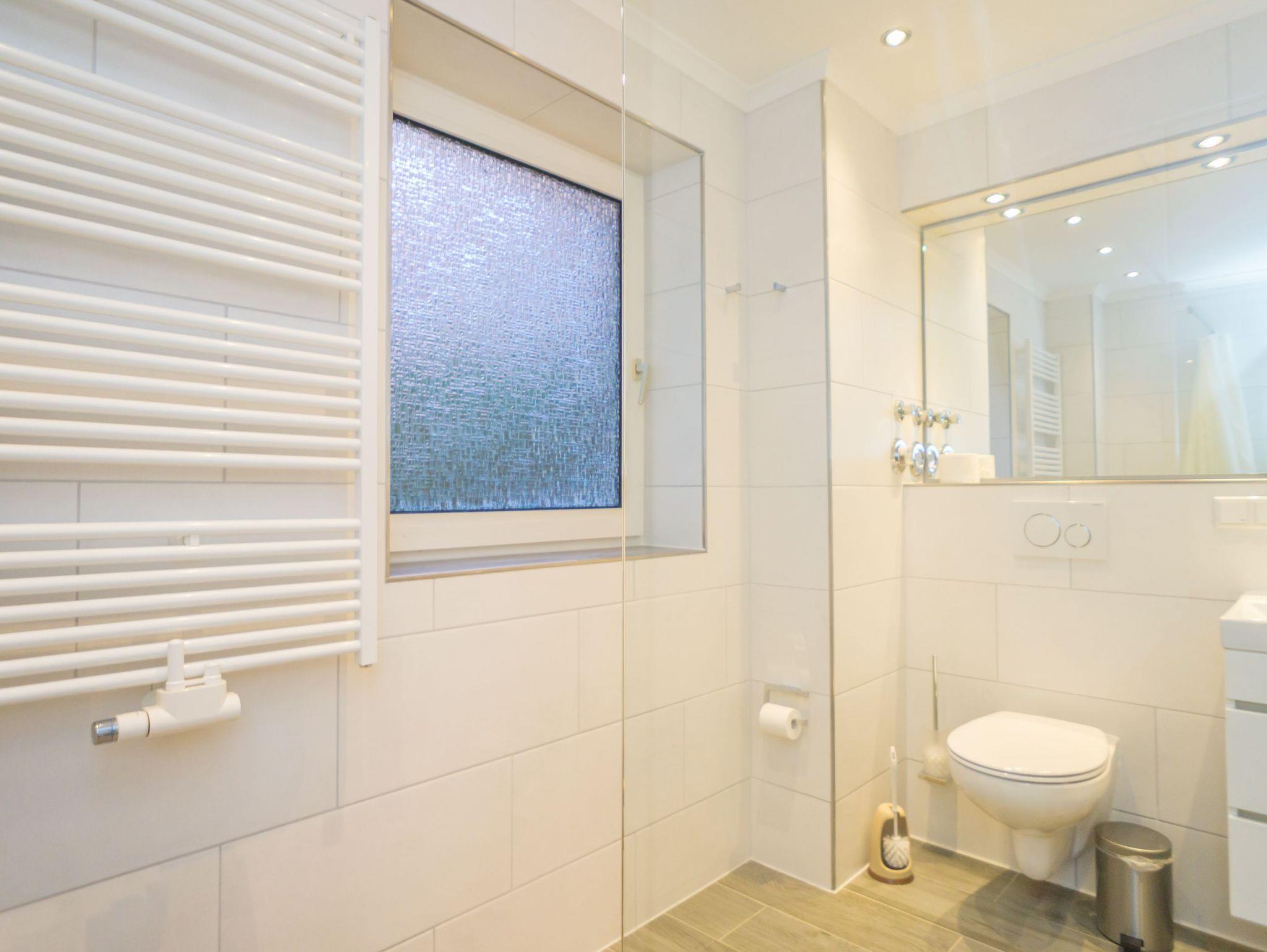 Das neue Badezimmer hat ein Dusche mit extraflachem Einstieg, einen Waschtisch, einen Handtuchtrockner und ein Fenster.