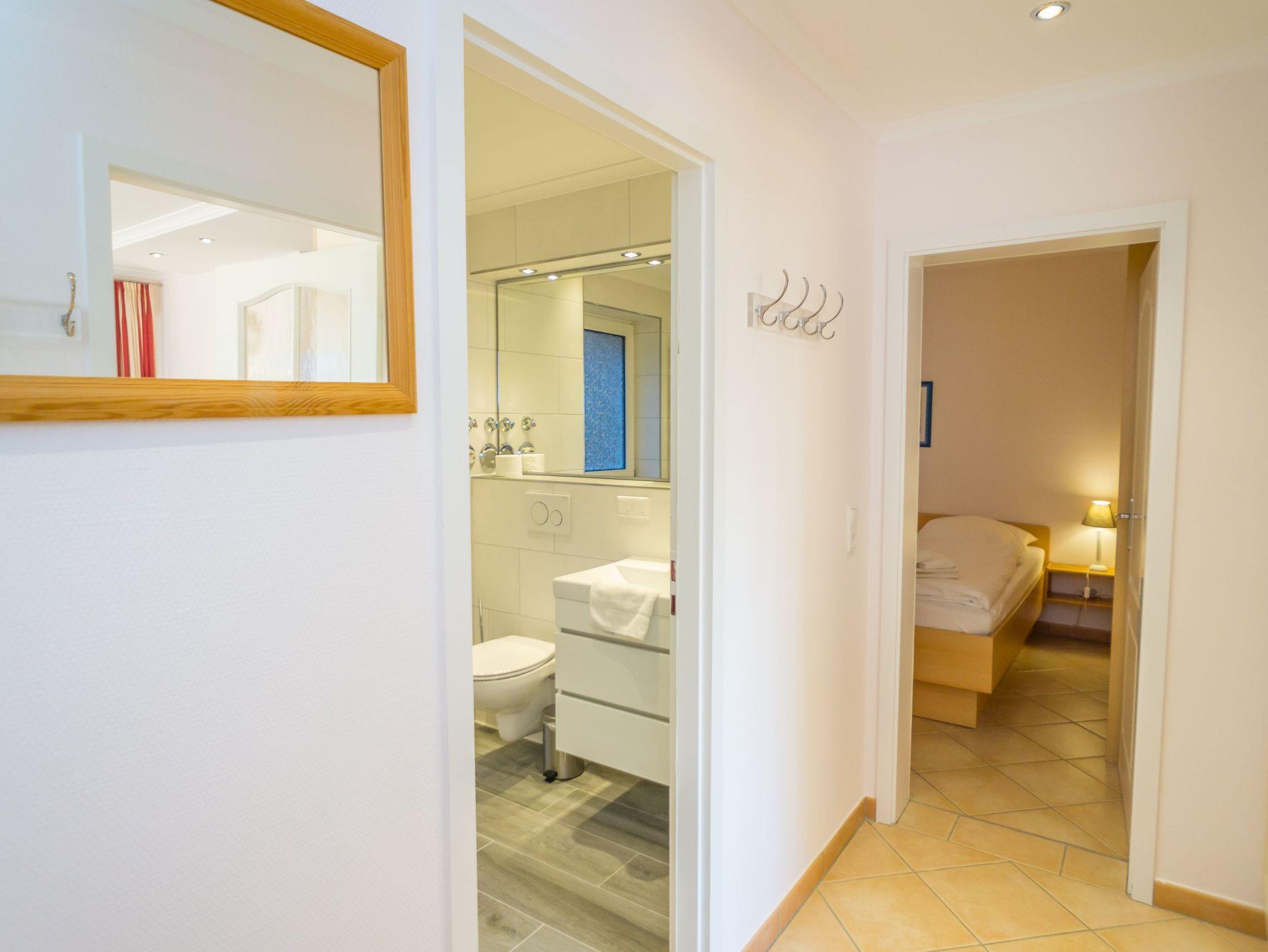 Vom Vorflur mit Garderobe gelangt man in das Wohnzimmer, Schlafzimmer und Duschbad/WC.