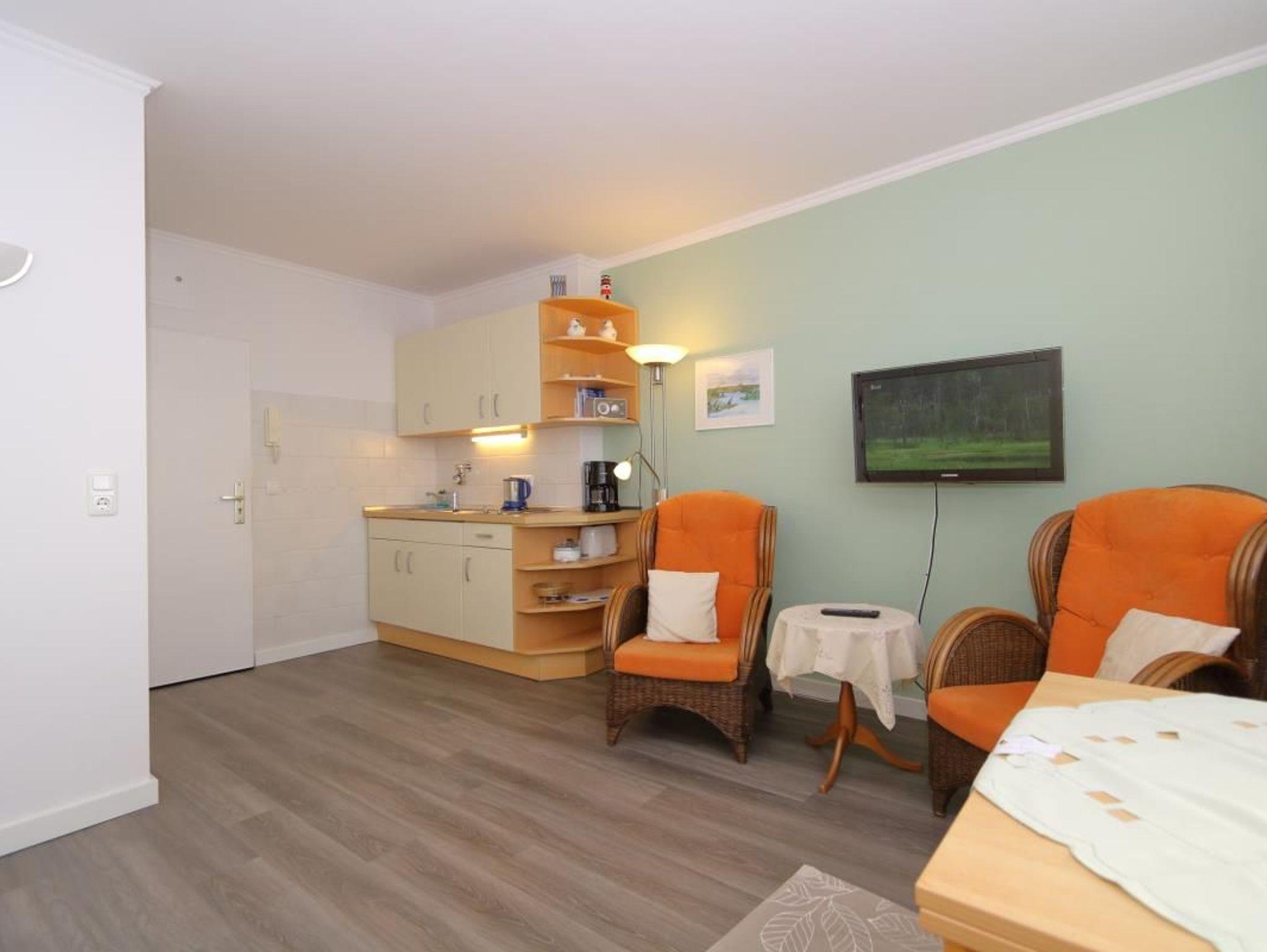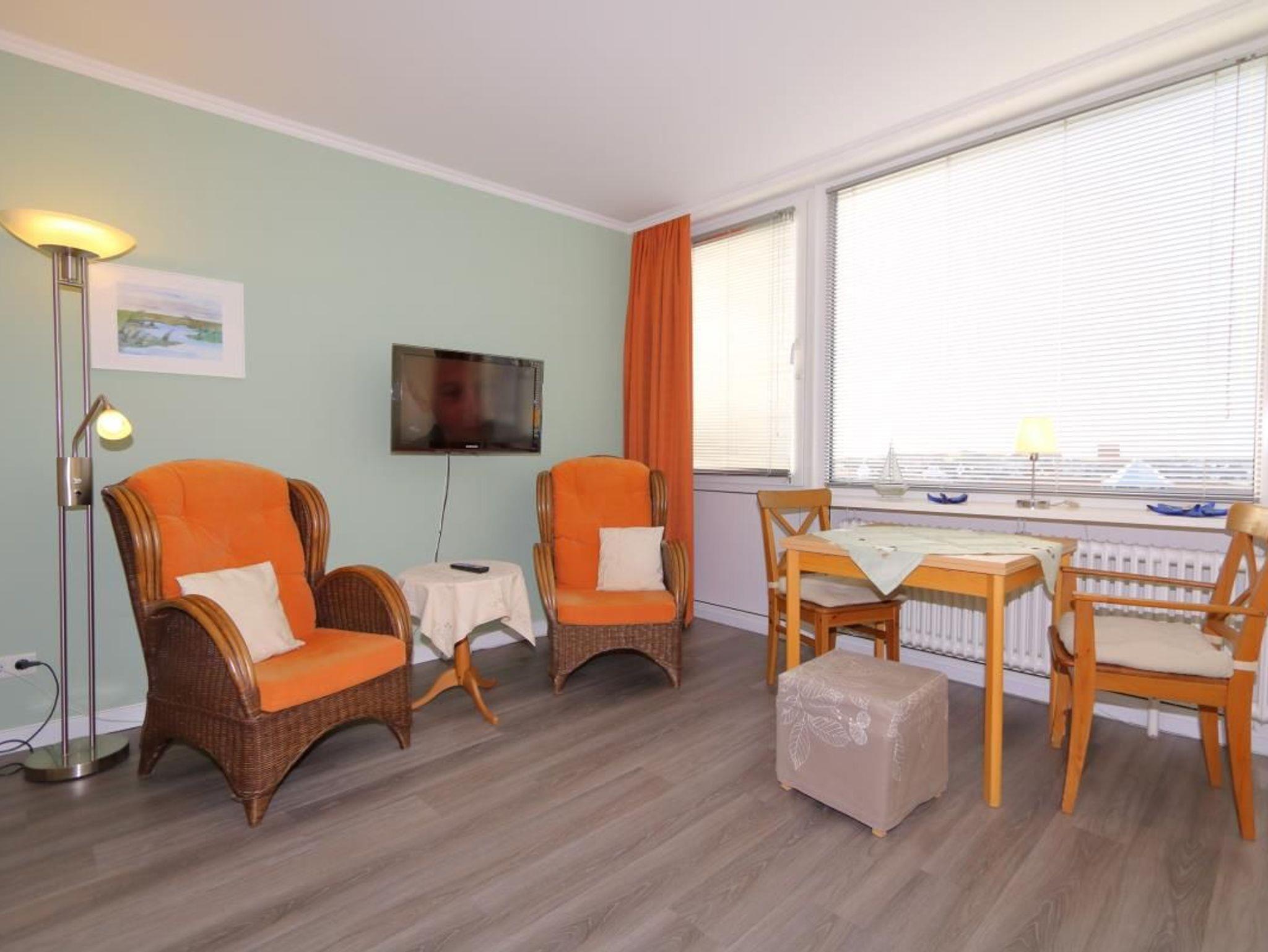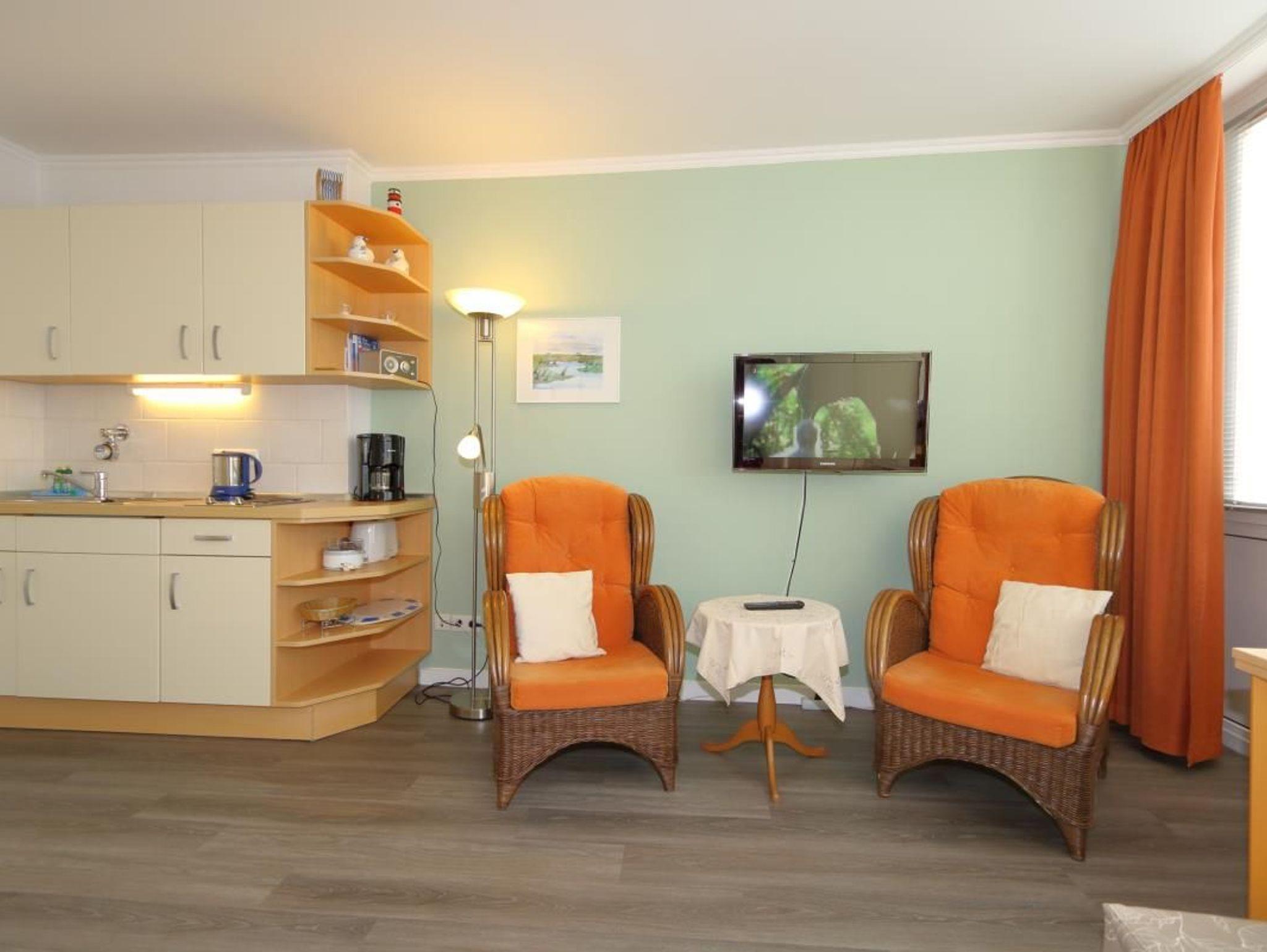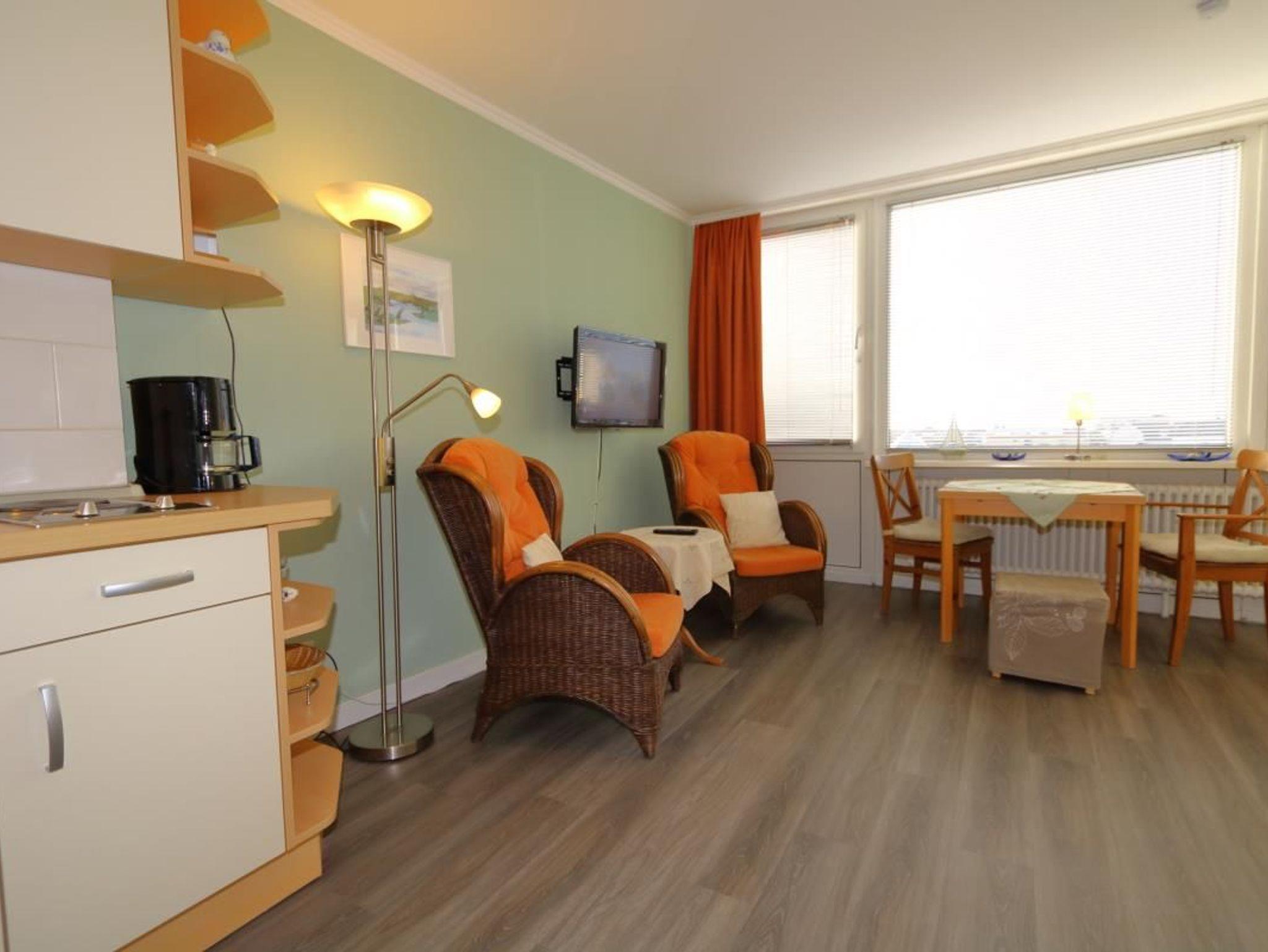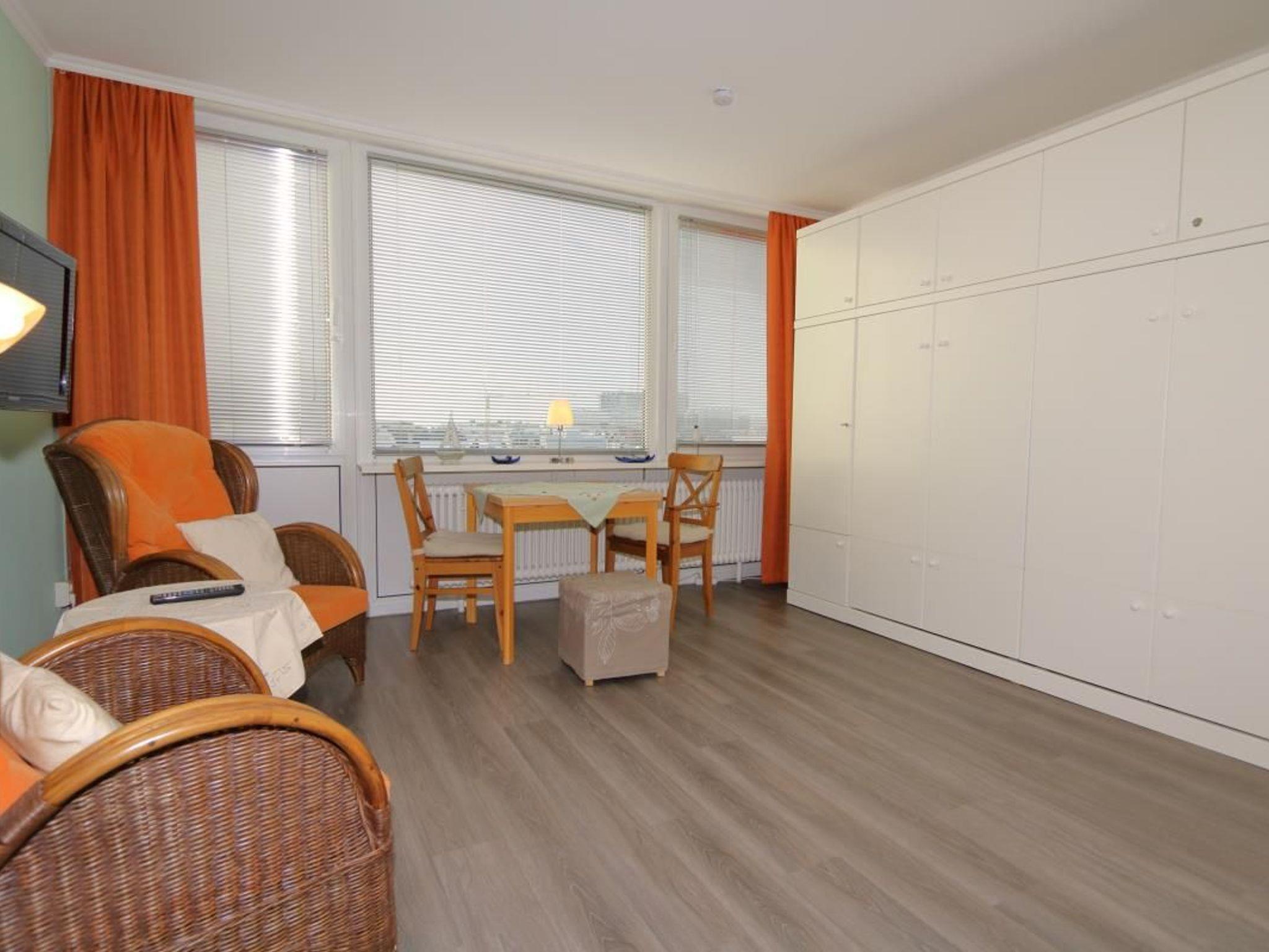 Im Wohnzimmer des Appartements stehen 2 Sessel und vor dem Fenster der Essplatz mit dem weitem Blick über die Stadt Richtung Nordsee. In einer Schrankwand sind zwei einzeln aufklappbare zusammenstehende Schrankbetten untergebracht. Die Küchenzeile ist zum Wohnzimmer hin offen. Das Bad hat eine Dusche.