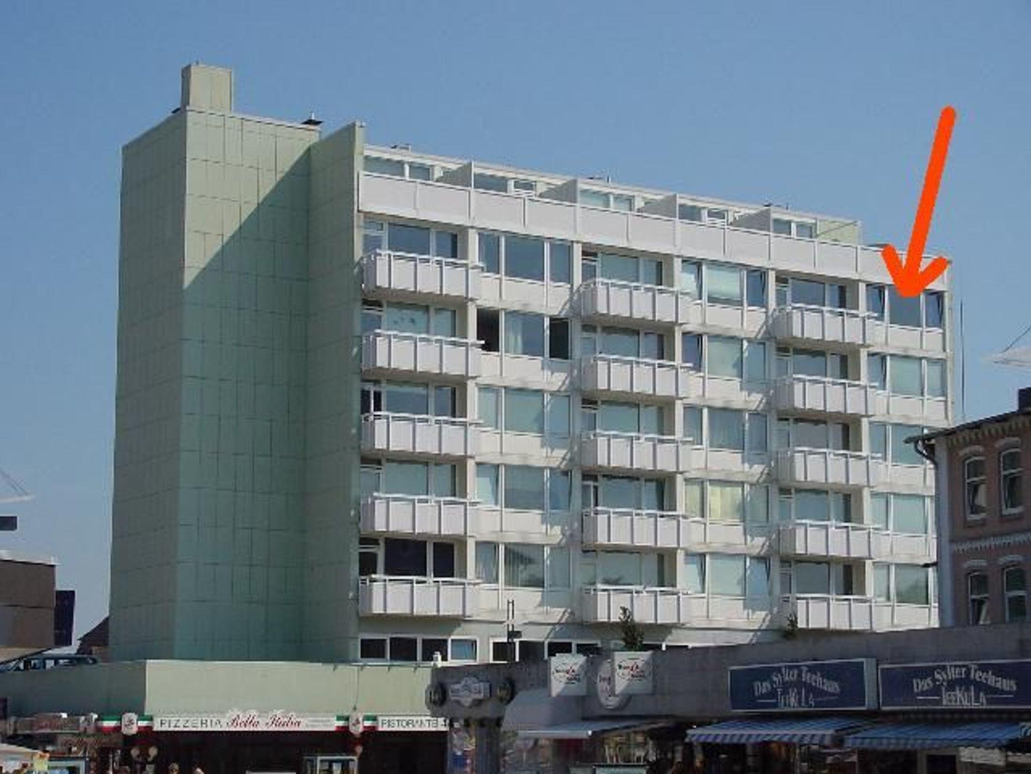 Das Appartementhaus steht an der Fußgängerzone Wilhelmstraße, die in die Friedrichstraße übergeht. Zum Strand sind es ca. 500 m. Das Appartement befindet sich in der 6. Etage mit Blick Richtung Westen.