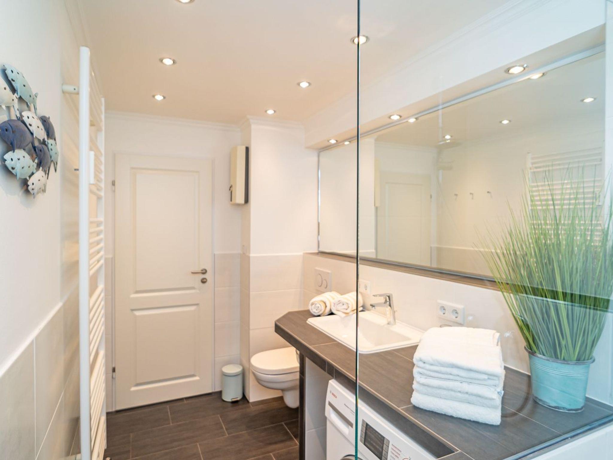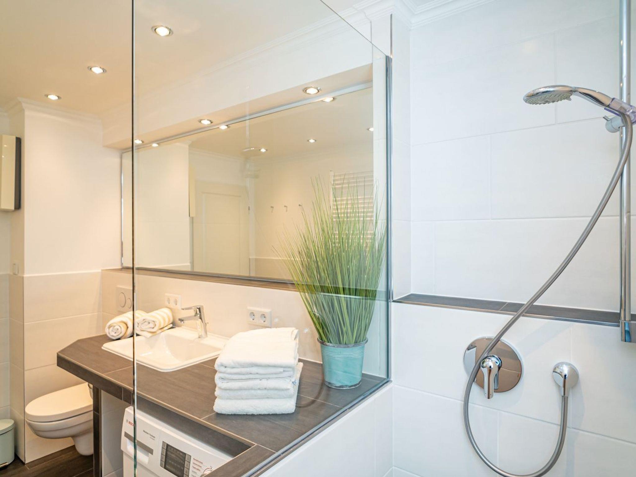 Das großzügige Duschbad/WC hat ein Fenster, einen Waschtisch, einen Handtuchtrockner, ein Fön und ein Waschmaschinen/Trockner-Kombigerät.