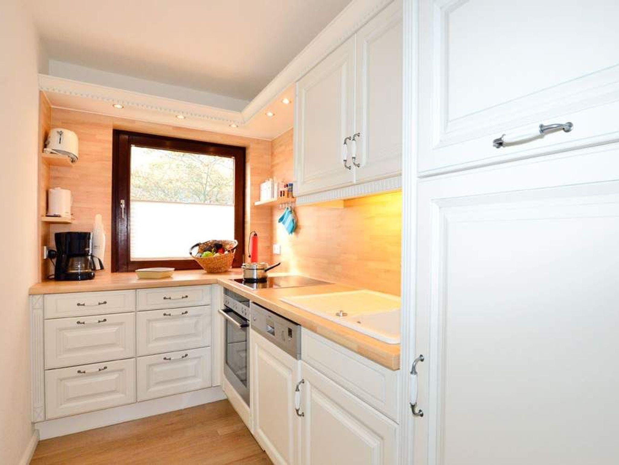 Die separate Küche hat einen Geschirrspüler, ein Glaskeramik-Kochfeld mit 4 Kochstellen, einen Backofen, eine Mikrowelle und einen Kühlschrank mit 3-Sterne-Gefrierfach und ein Fenster. Kaffeemaschine, Wasserkocher und Toaster gehören zur Grundausstattung.