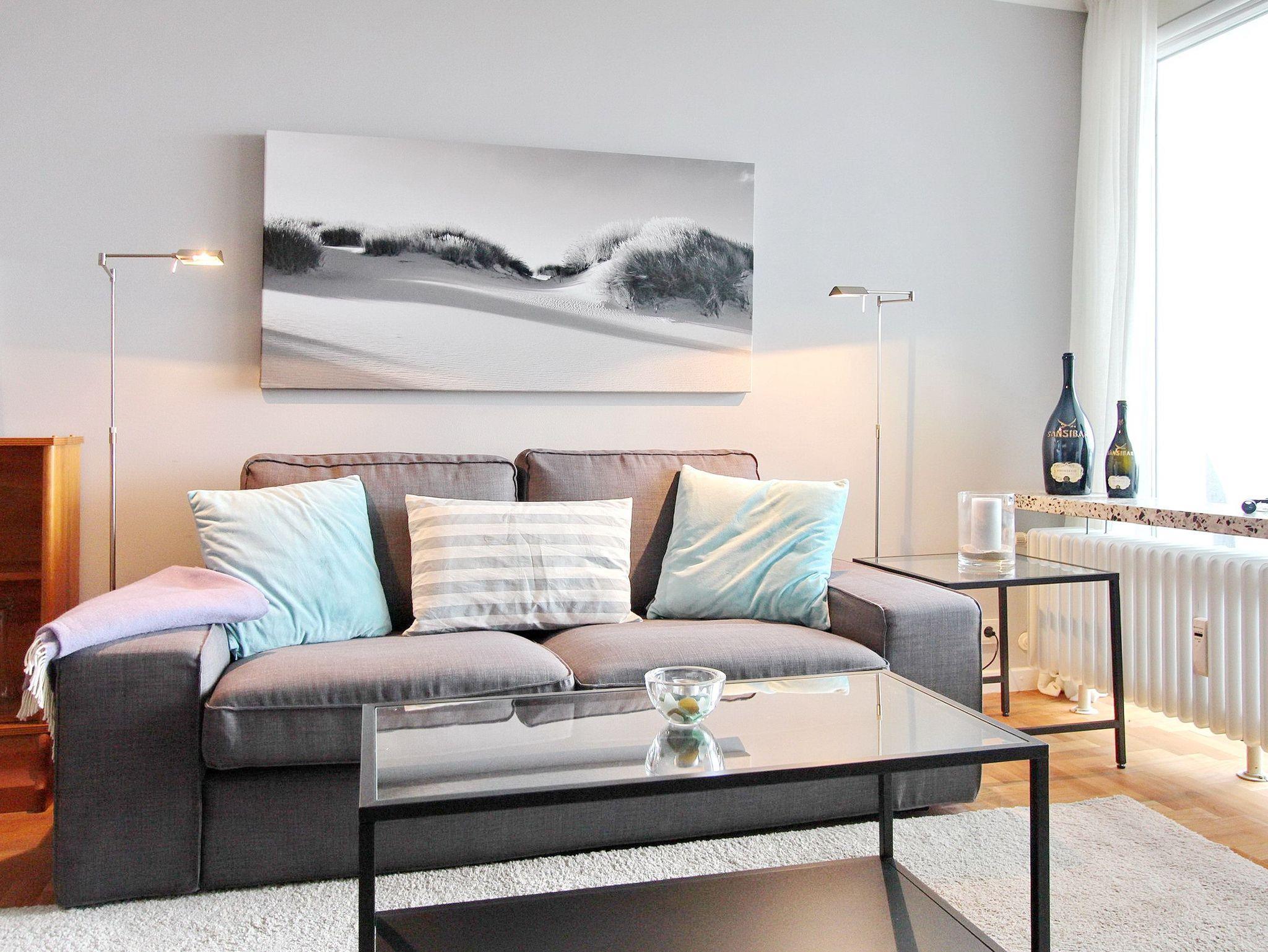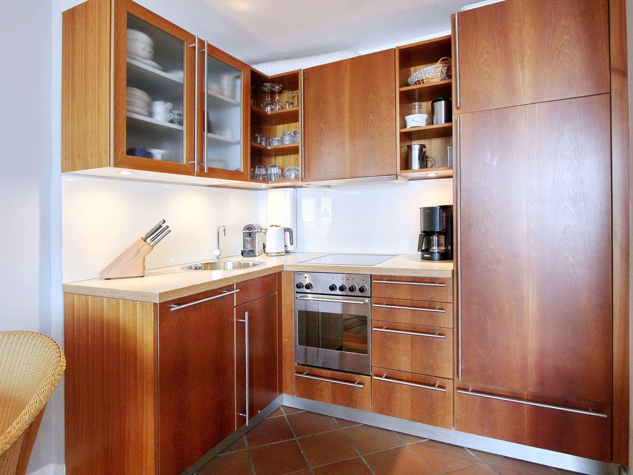 Ferienwohnung in der 5. Etage des Haus Eydum mit tollem Blick auf die Nordsee. Wenn man die Wohnung betritt steht man im Flur, im dem sich Schränke mit viel Stauraum befinden. Vom Flur geht eine Abstellkammer ab und das Badezimmer mit Dusche, Handtuchtrockner, Fön und Kosmetikspiegel. Der Einstieg der Dusche ist niedrig. Im Wohn-/Esszimmer gibt es eine bequeme Couch, 2 Korbstühle und ein Sideboard, zum offenen Küchenbereich gibt es einen Tisch mit 2 Stühlen. Um sich selbst zu verpflegen ist die Küche voll ausgestattet und verfügt über einen Geschirrspüler, ein 4 Platten Ceranfeld und einen großen Kühlschrank mit Gefrierfach. Selbst ein Smoothiemaker von WMF und eine zusätzliche Nespressomaschine sind vorhanden.