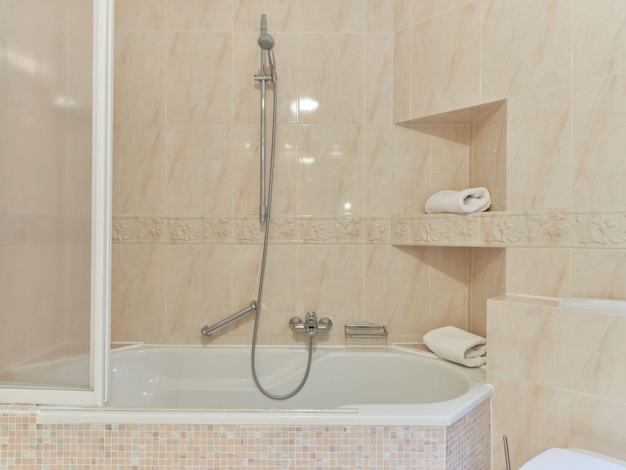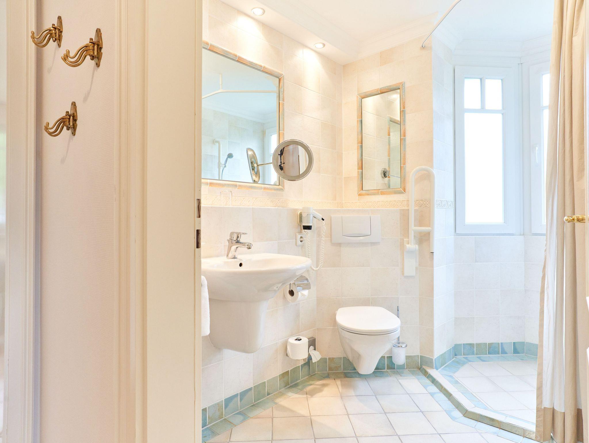 Zwei Badezimmer, einmal mit Wanne, Doppelwaschbecken und WC und ein Duschbad mit WC.