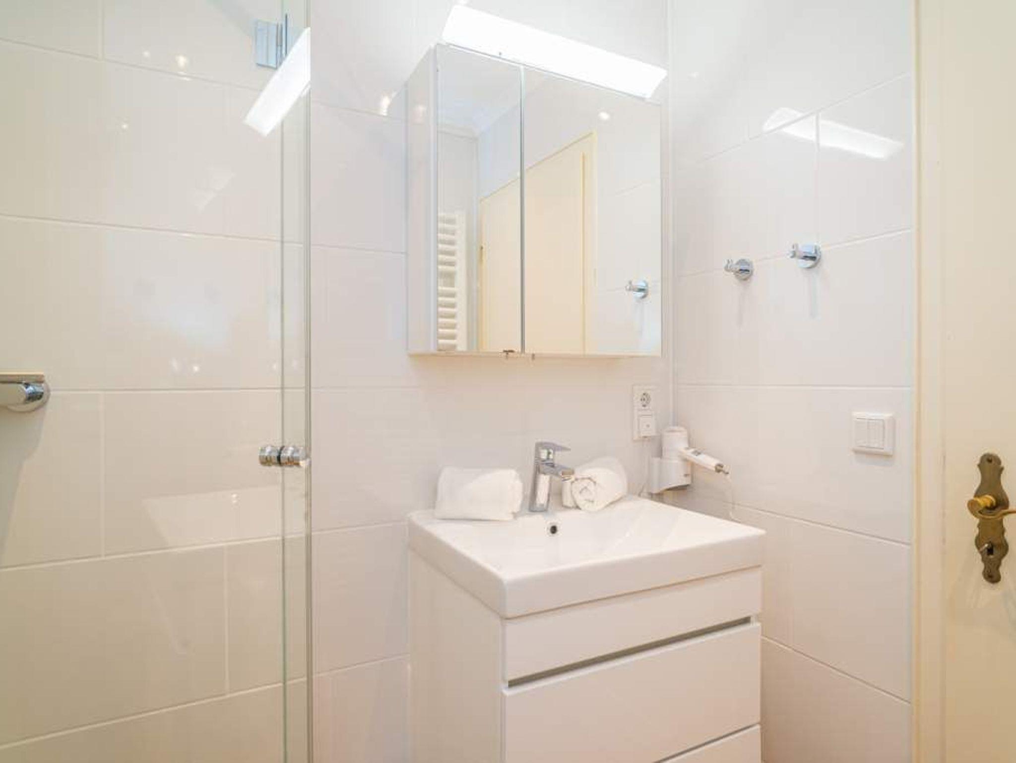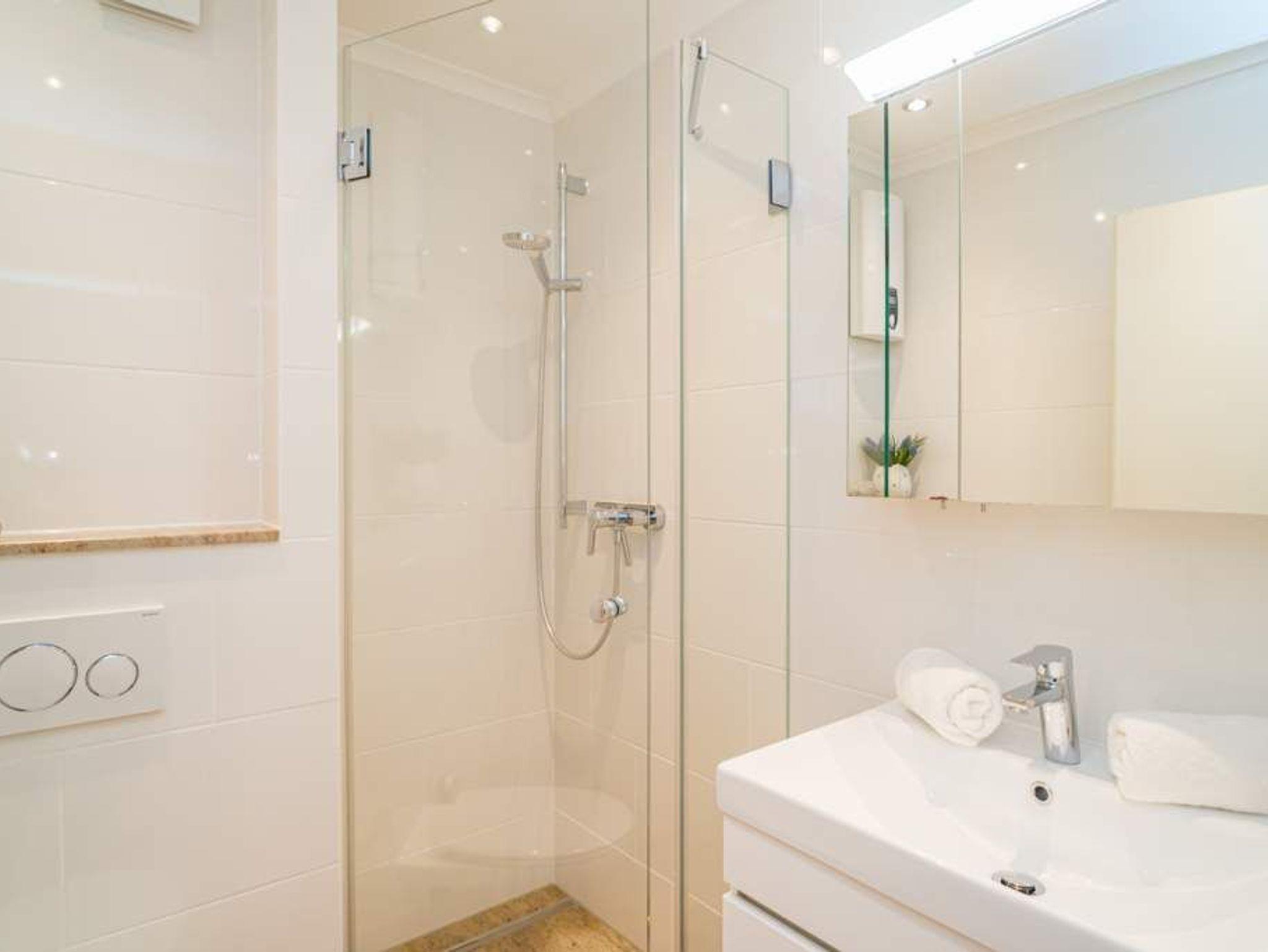 Das Badezimmer ist mit einer Dusche, einem Waschtisch, einem WC und einem Fön.