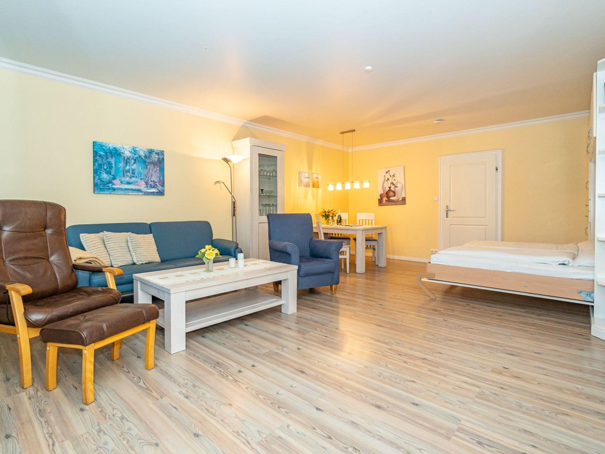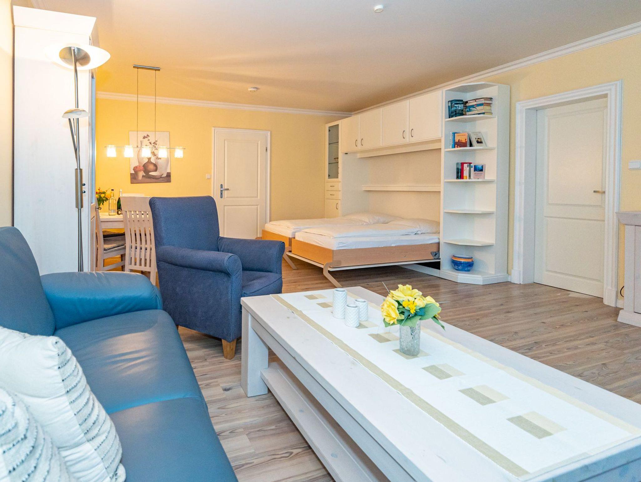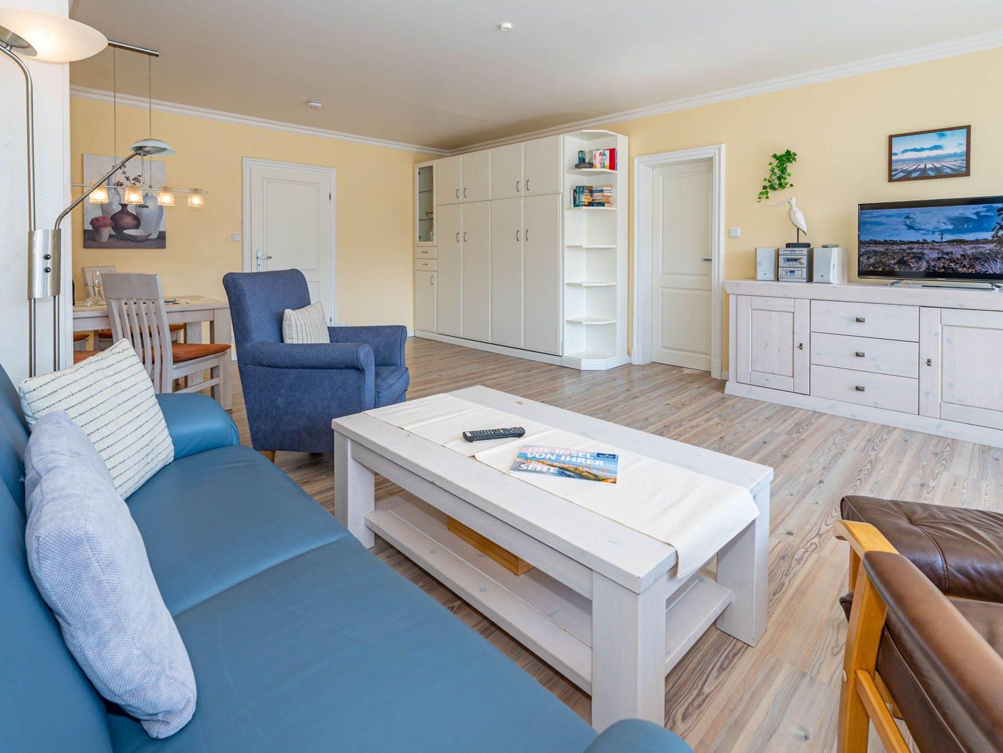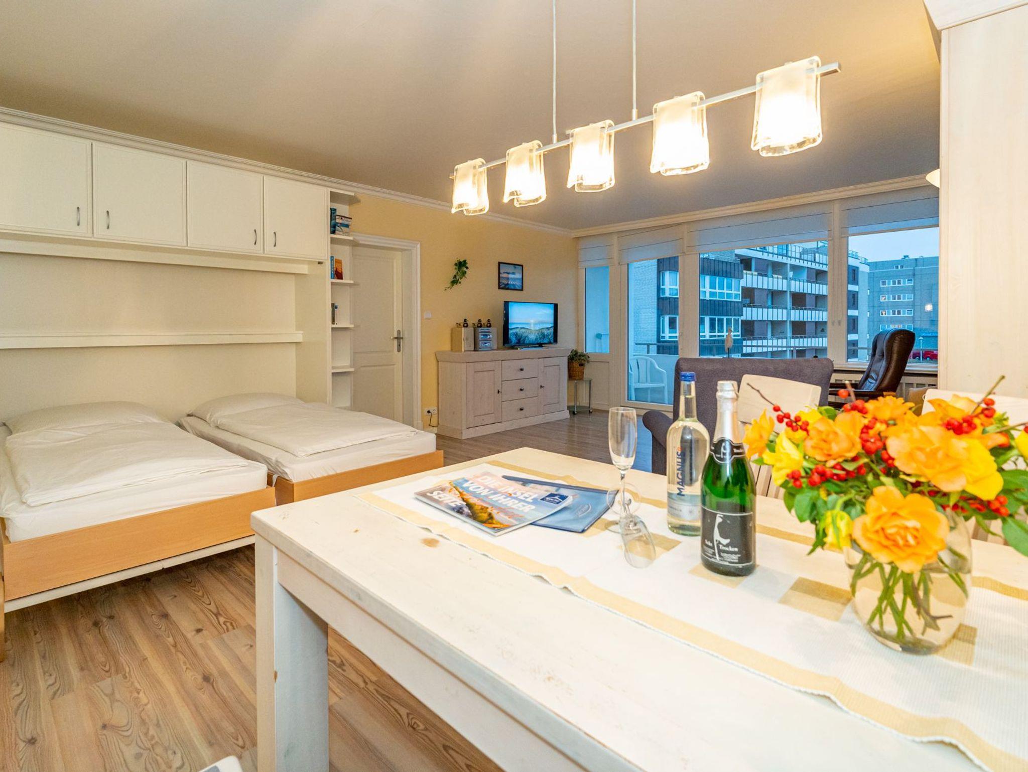 Wohnzimmer mit Sessel, Couchgarnitur, Schrankbetten (einzeln ausklappbar), Essplatz, Kabel-Flachbild-TV, Radio und CD, Südbalkon mit Strandkorb, separate Küche mit Fenster, Geschirrspüler, Mikrowelle, Kaffeemaschine, Wasserkocher und Toaster, Wannenbad/WC mit Fenster, Fön.