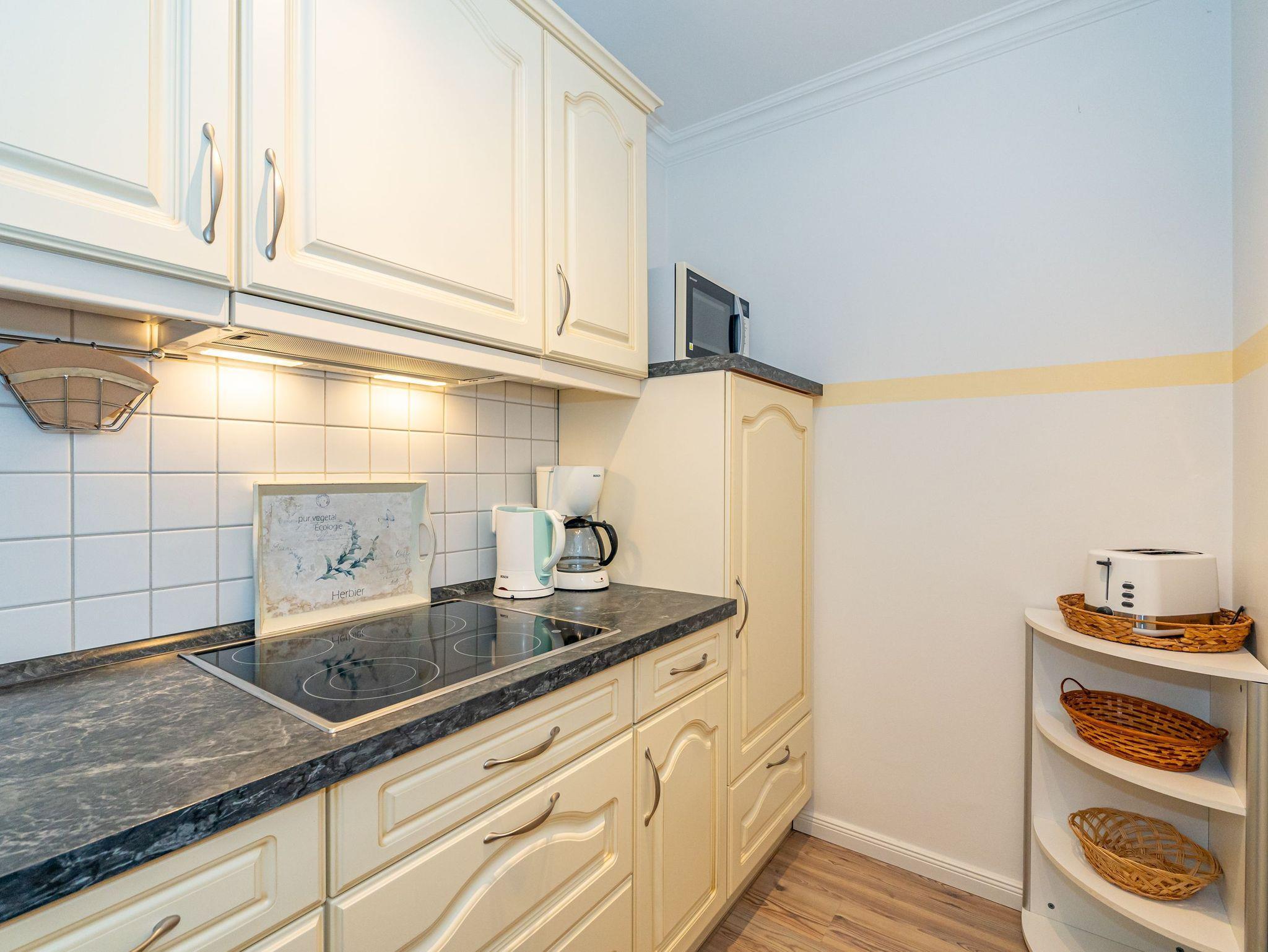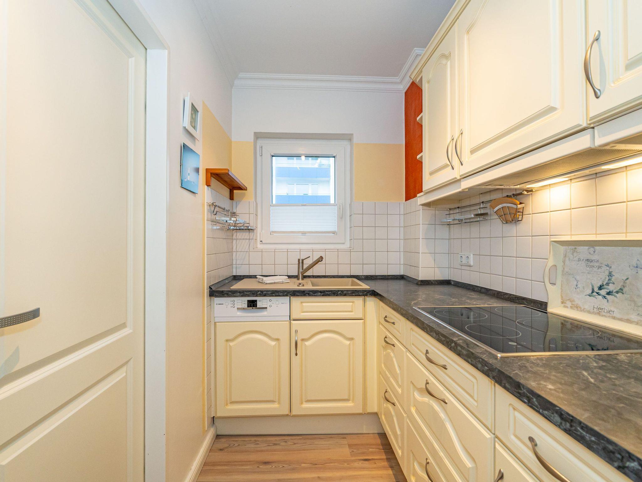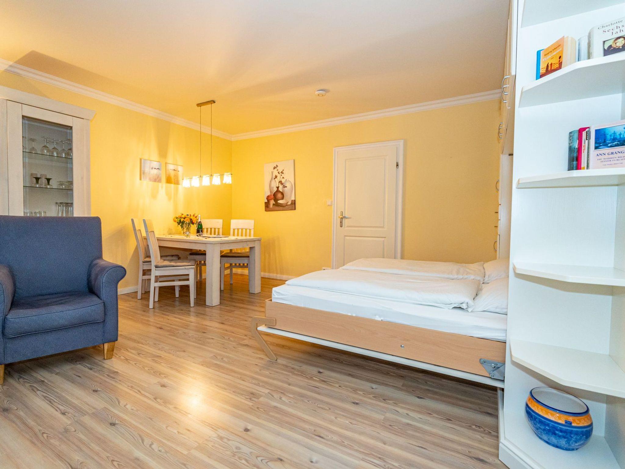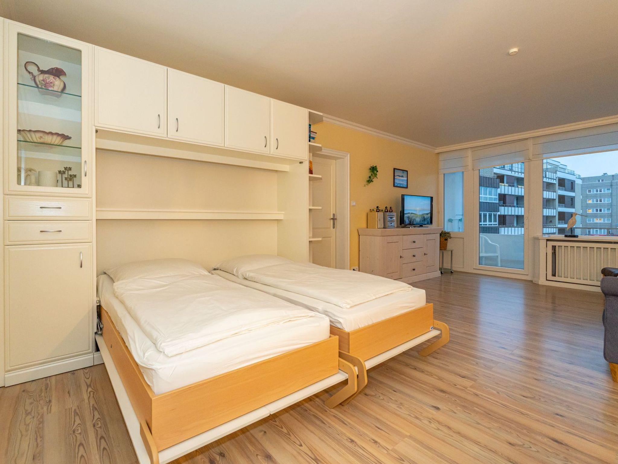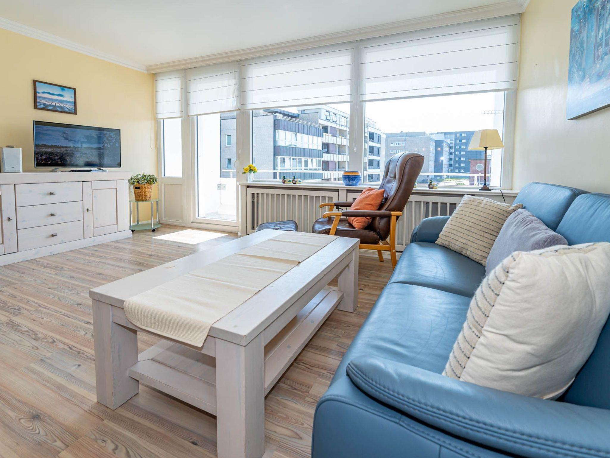 Wohnzimmer mit Sessel, Couchgarnitur, Schrankbetten (einzeln ausklappbar), Essplatz, Kabel-Flachbild-TV, Radio und CD, Südbalkon mit Strandkorb, separate Küche mit Fenster, Geschirrspüler, Mikrowelle, Kaffeemaschine, Wasserkocher und Toaster, Wannenbad/WC mit Fenster, Fön.