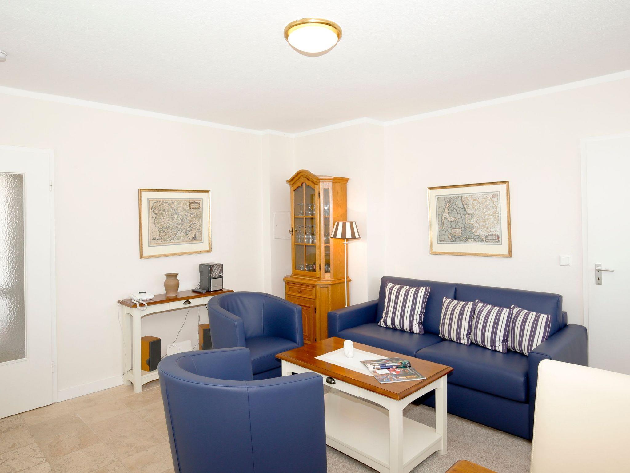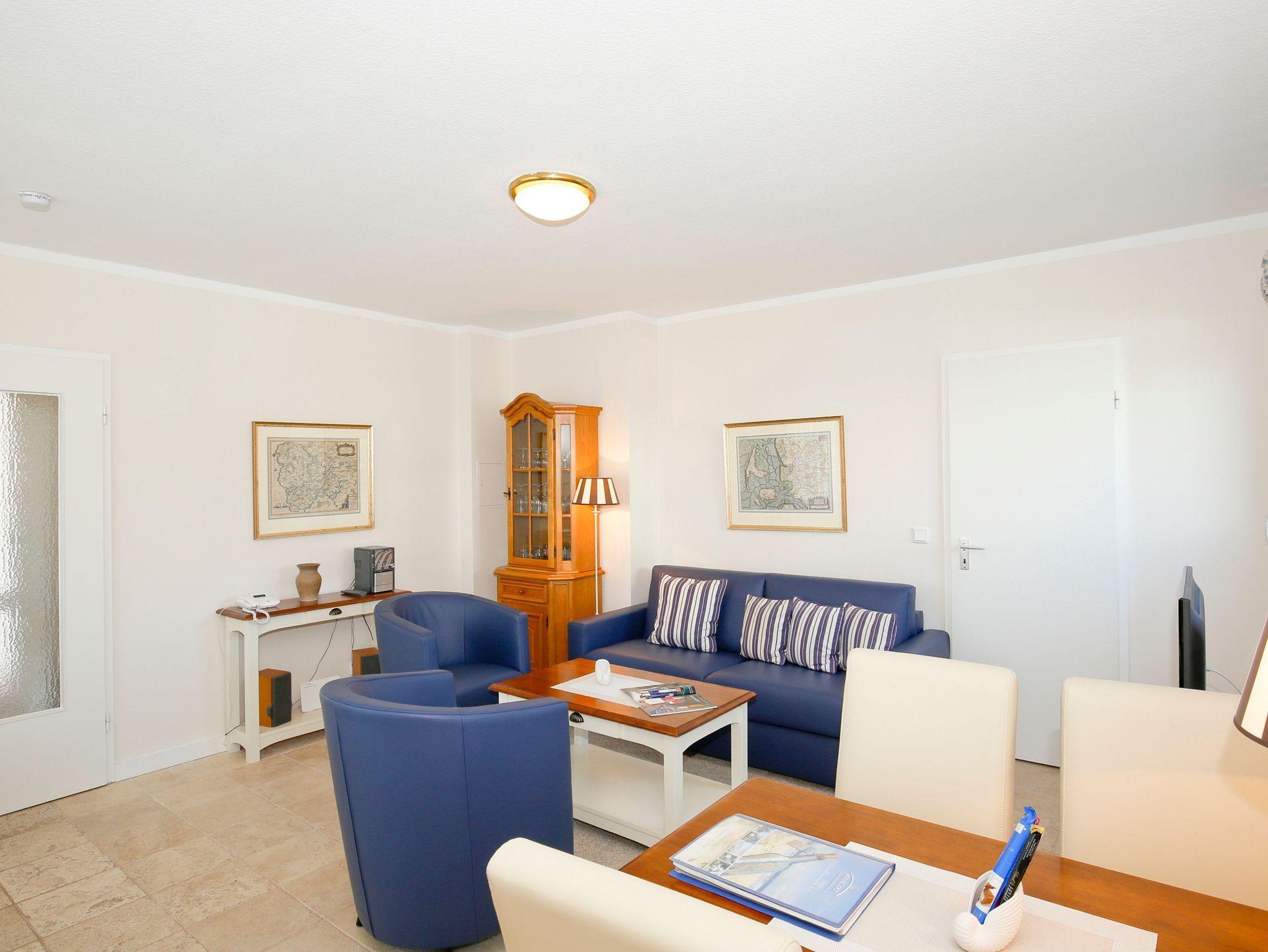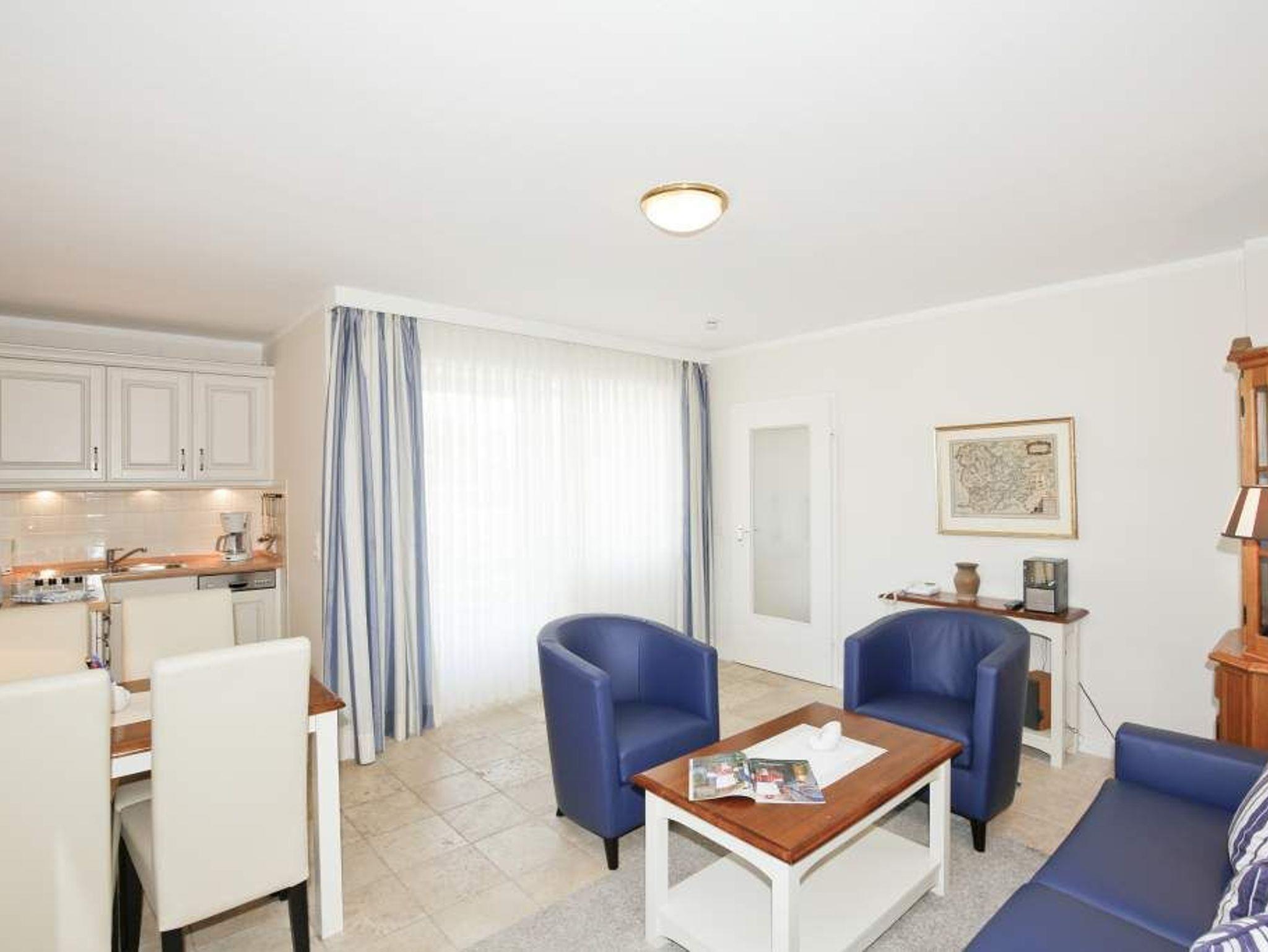 Der Wohnraum besteht aus einer gemütlichen Sitzgarnitur (Doppelschlafsofa und zwei Sessel), einem Essplatz, Kabel-Flachbild-TV, HiFi-Anlage, Telefon inklusive Flatrate für Gespräche ins deutsche Festnetz (Handynummern gesperrt), kostenloser Internetnutzung per W-Lan und offene Einbauküche im Landhausstil.