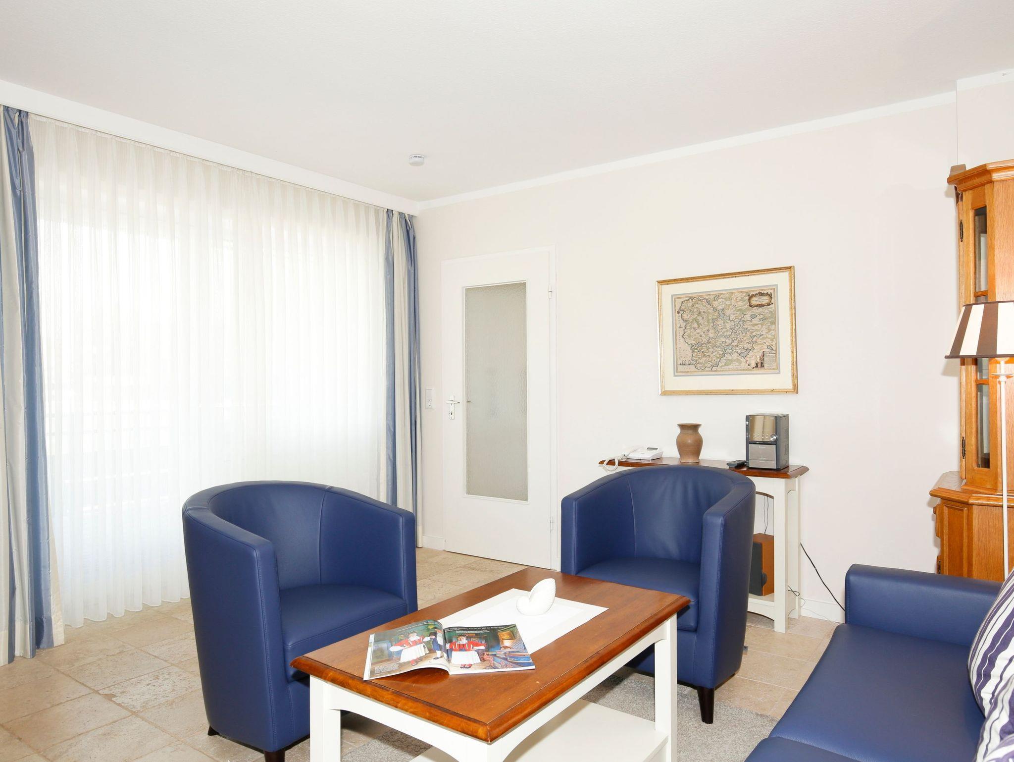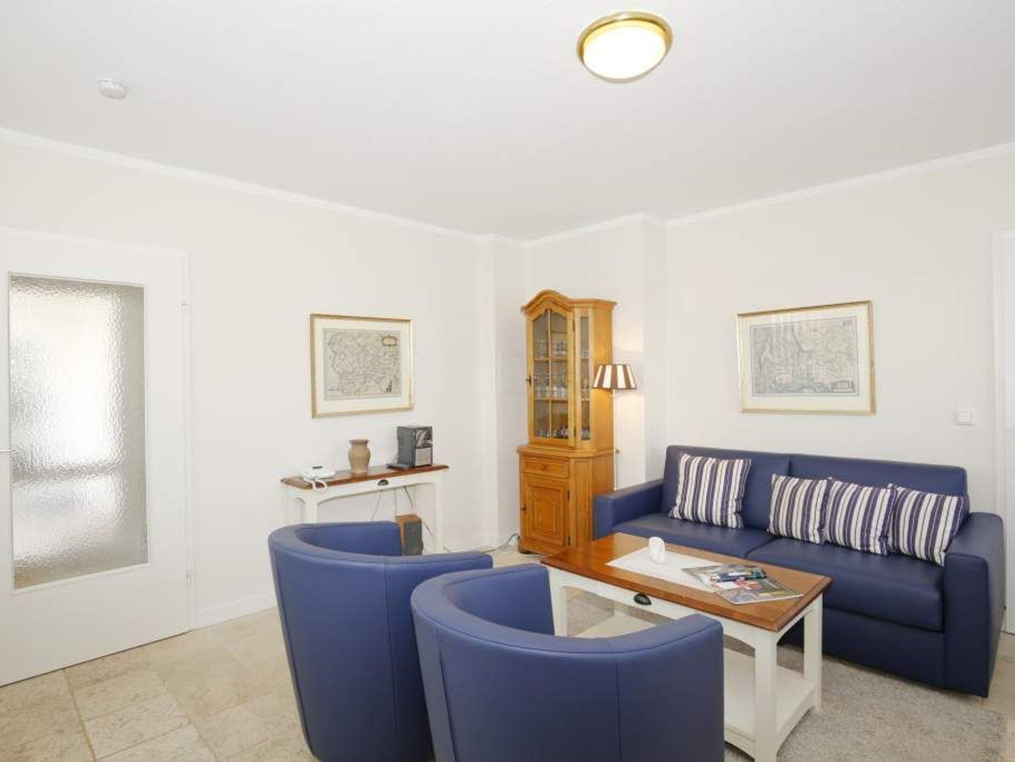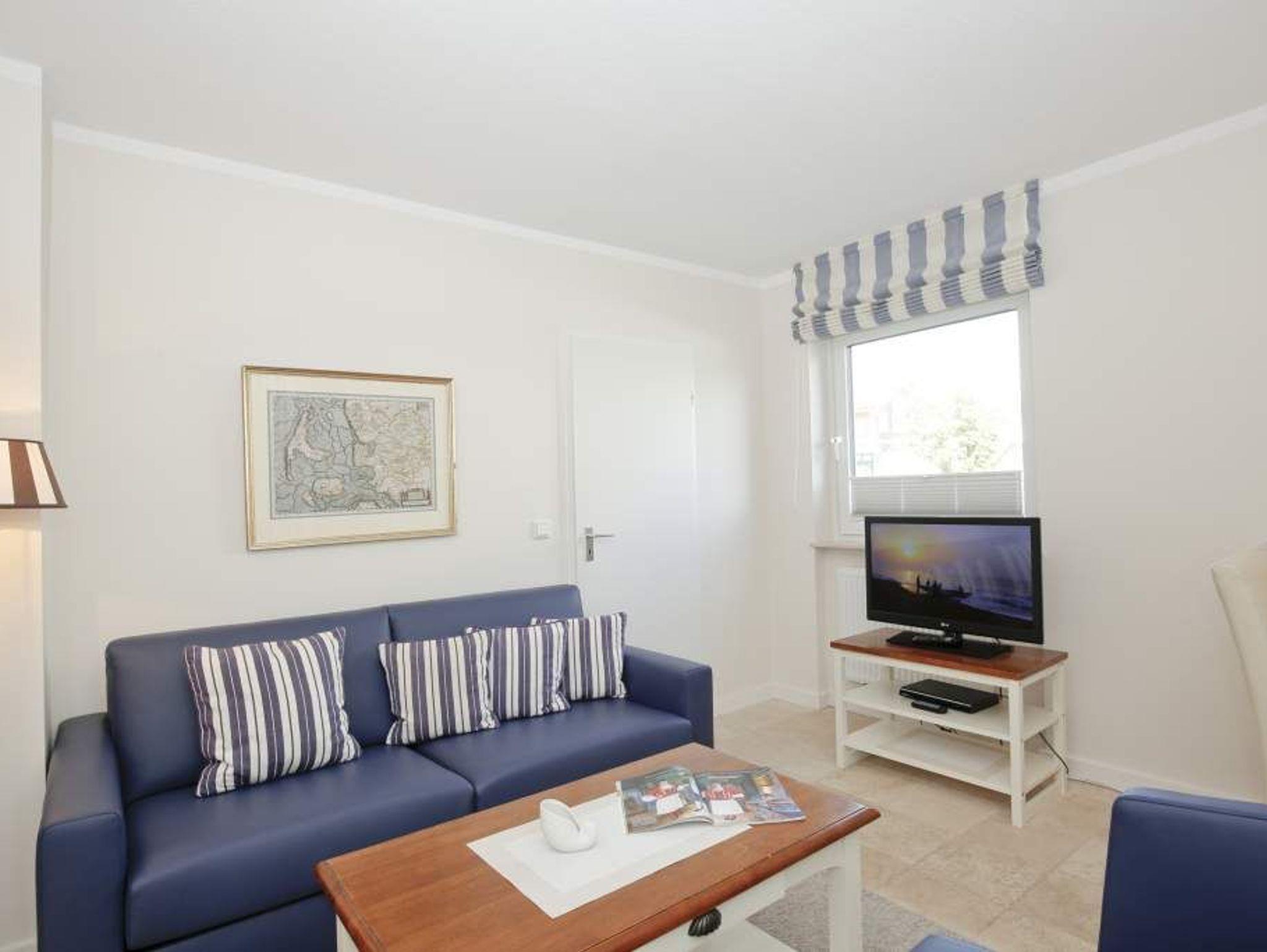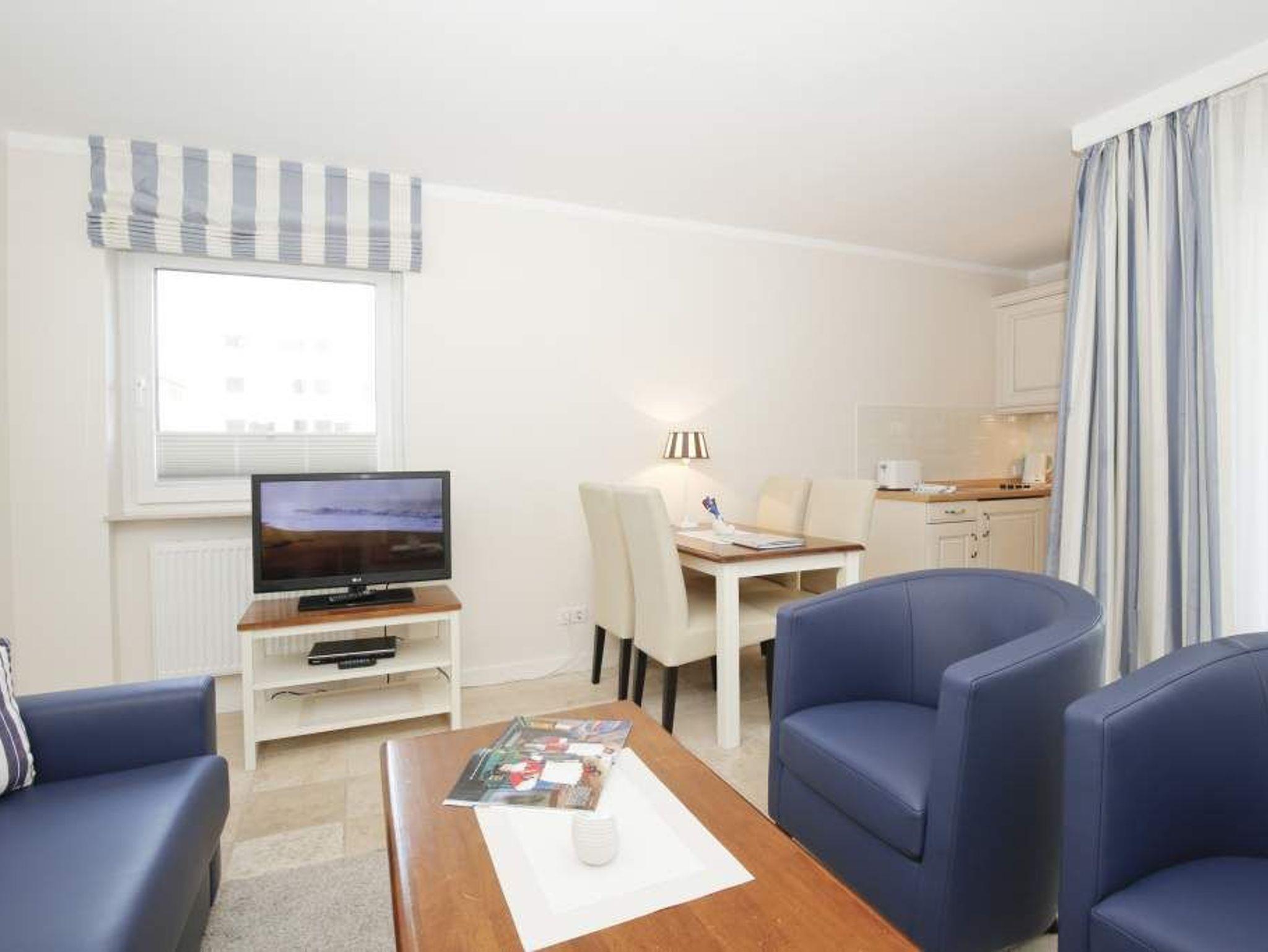 Der Wohnraum besteht aus einer gemütlichen Sitzgarnitur (Doppelschlafsofa und zwei Sessel), einem Essplatz, Kabel-Flachbild-TV, HiFi-Anlage, Telefon inklusive Flatrate für Gespräche ins deutsche Festnetz (Handynummern gesperrt), kostenloser Internetnutzung per W-Lan und offene Einbauküche im Landhausstil.