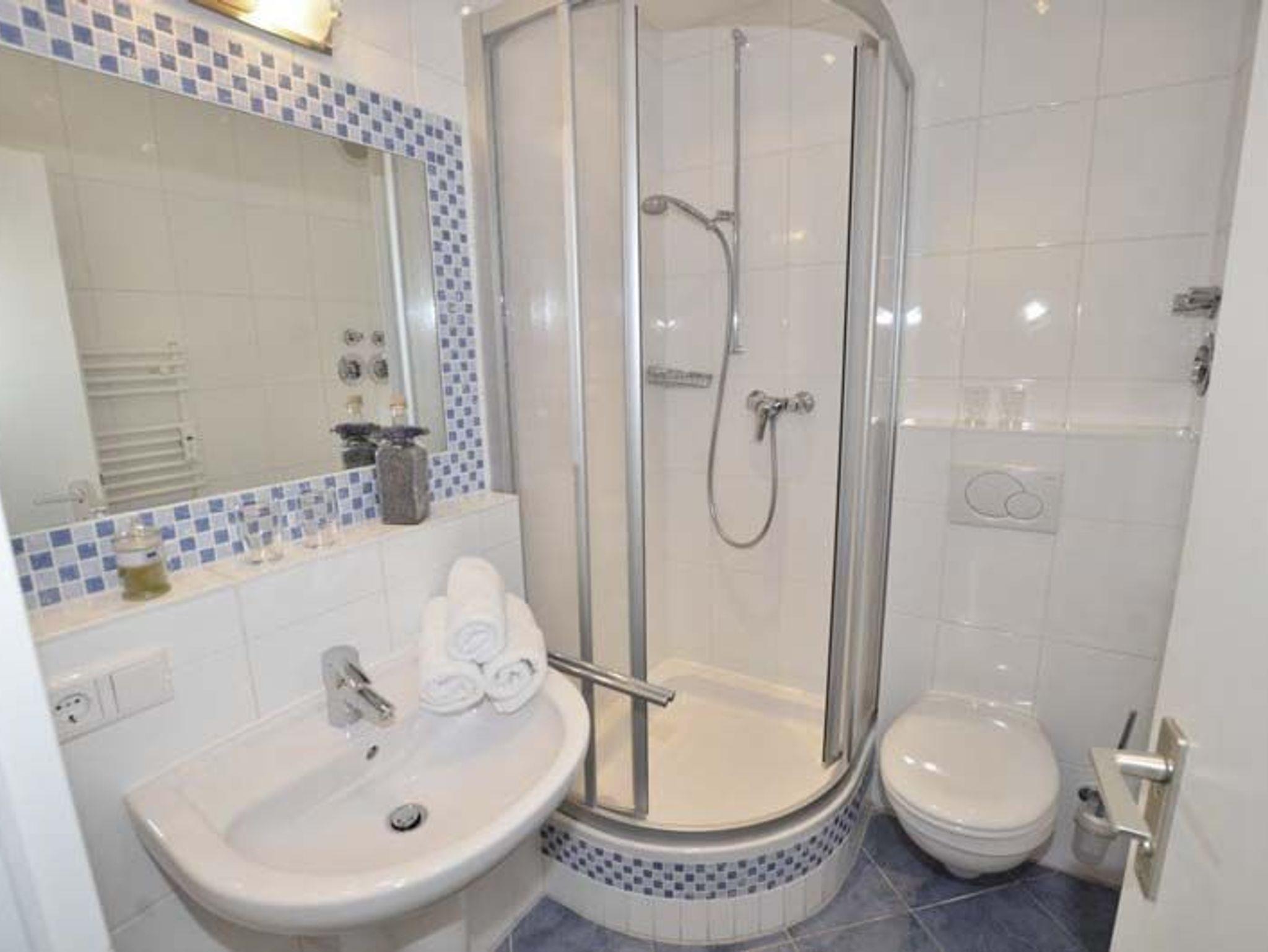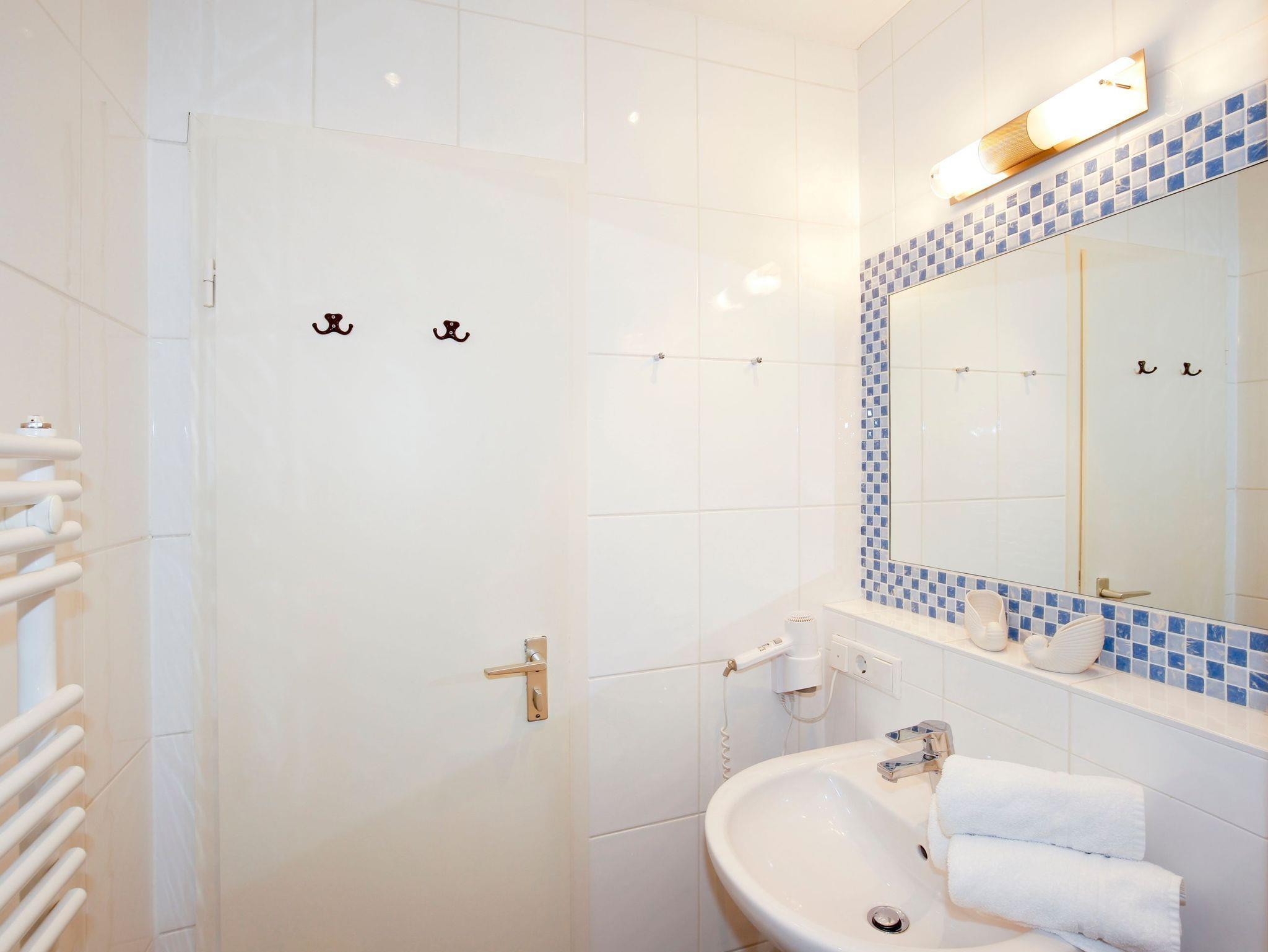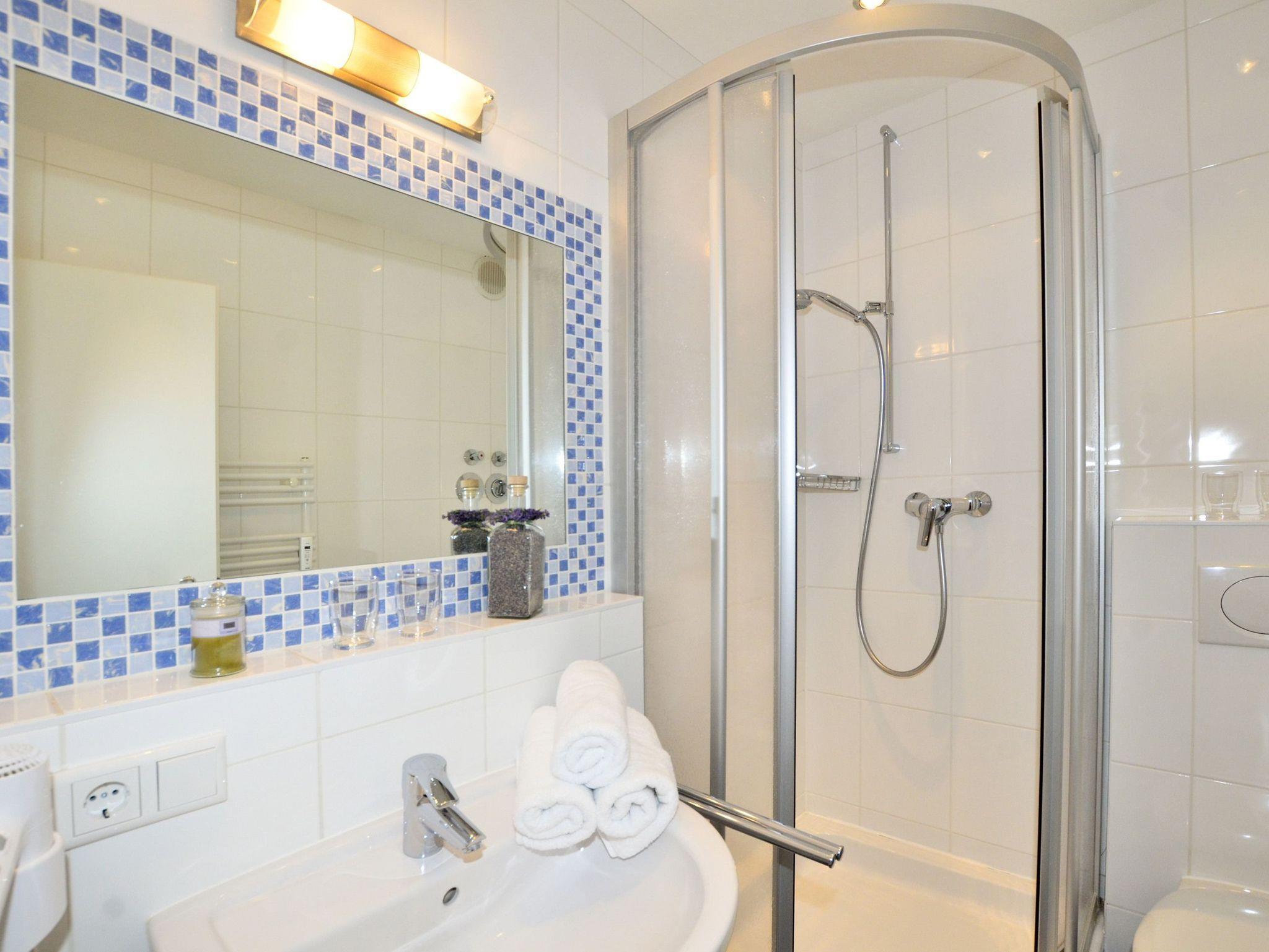 Das Badezimmer ist mit einer Runddusche, einem Waschtisch, einem Handtuchtrockner, einem Fön und einem WC ausgestattet.