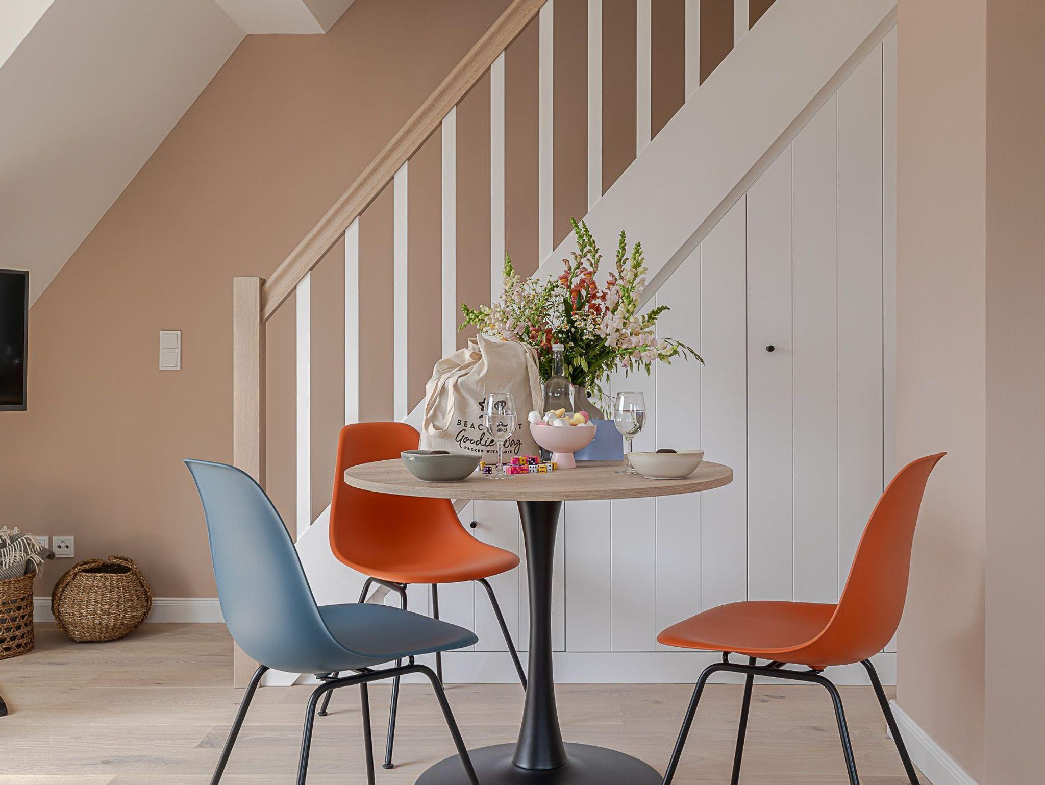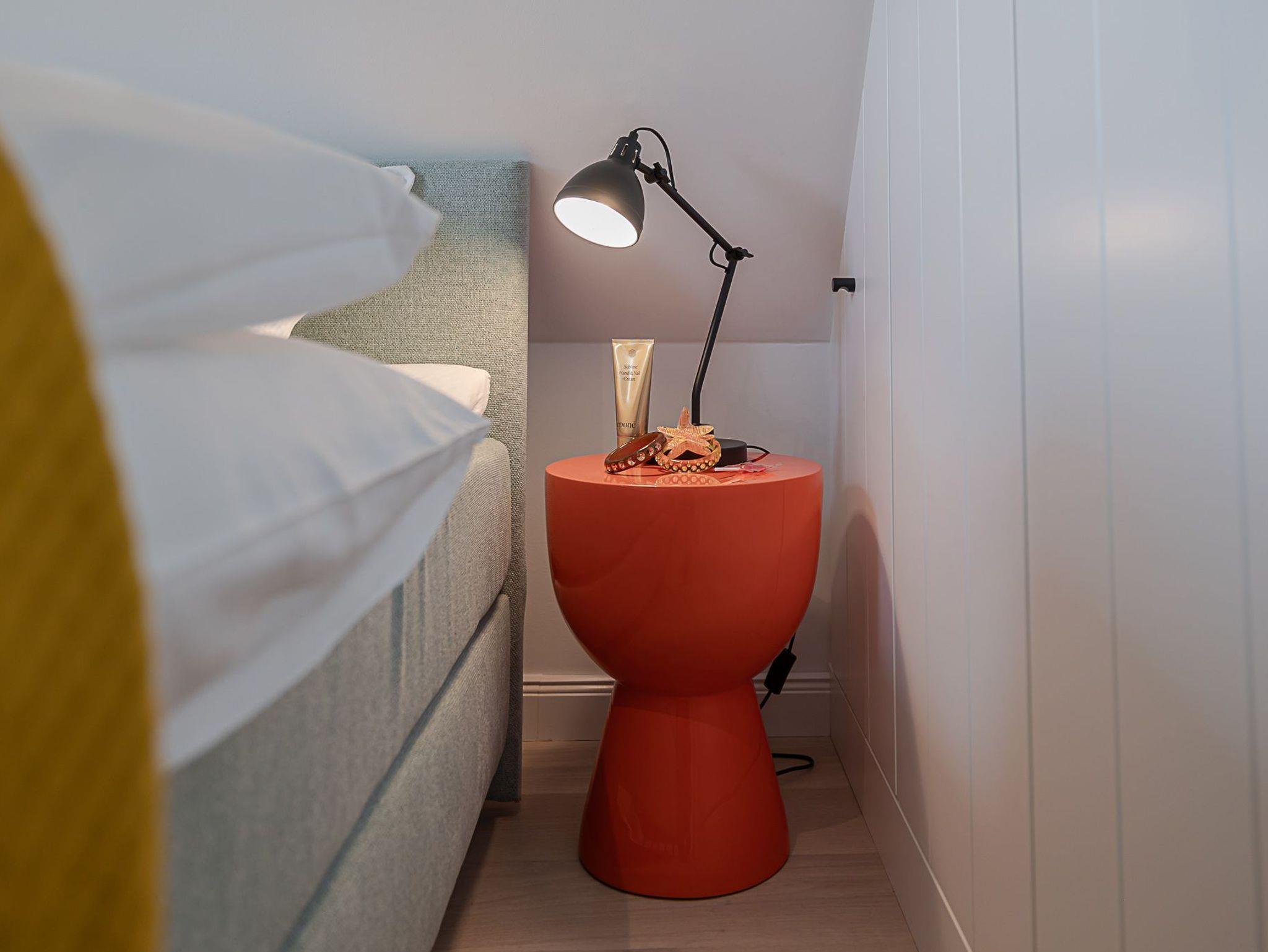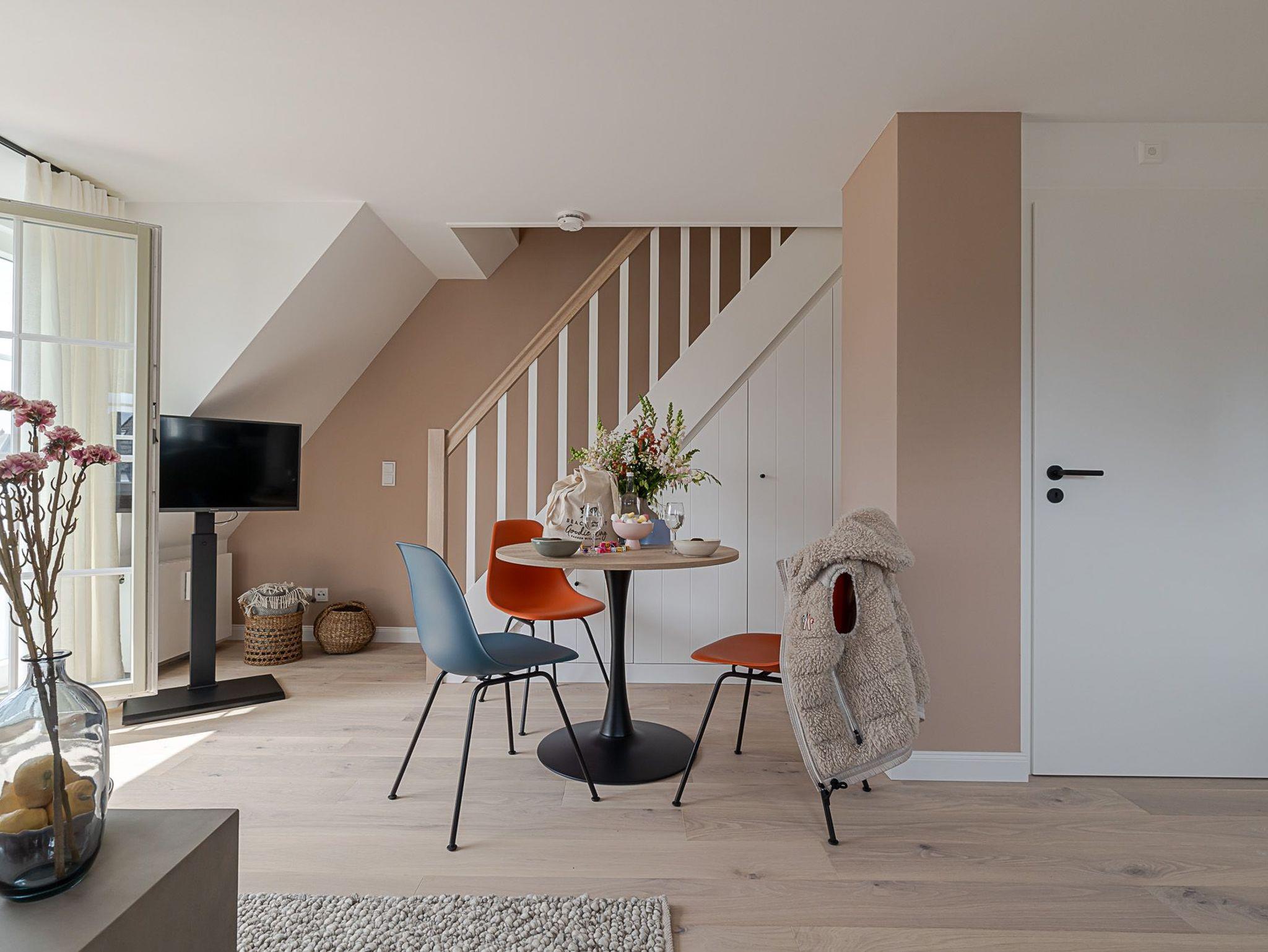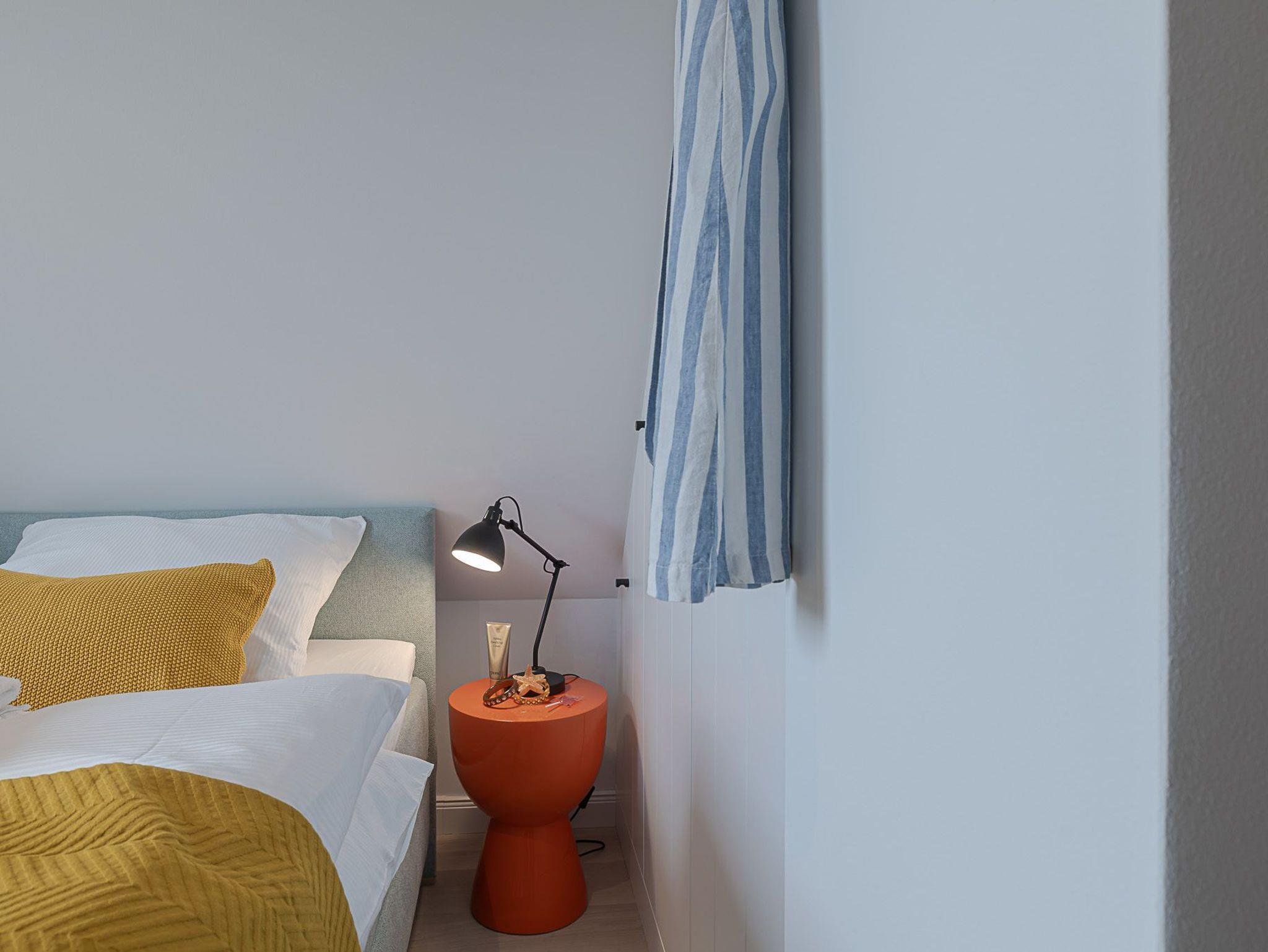 Wenn es in Westerland dunkel wird, geht es auf Ihr Oberdeck! Über die Treppe erreichen Sie Ihre nächtliche Ruhezone. Hier erwartet Sie ein komfortables Boxspringbett der Marke Schramm, welches die optimale Erholung nach einem aktiven Tag an der frischen Nordseeluft garantiert.