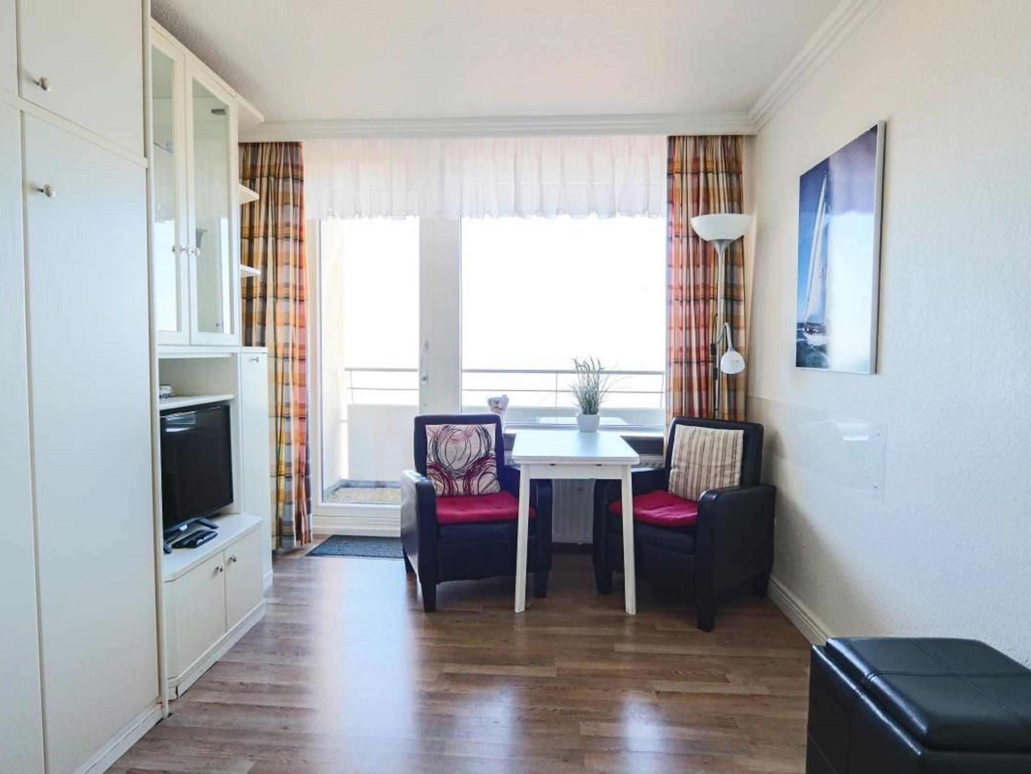In dem mit Design-Planken ausgelegten Wohnzimmer stehen zwei Sessel und der Essplatz. In der weißen Schrankwand ist ein Doppelschrankbett untergebracht. Vom Balkon hat man einen wunderschönen Blick auf den Strand und das Meer. Die Küche ist als Zeile im Flur des Appartements untergebracht und hat u. a. eine Mikrowelle. Das moderne Bad hat eine Dusche mit tiefem Einstieg.