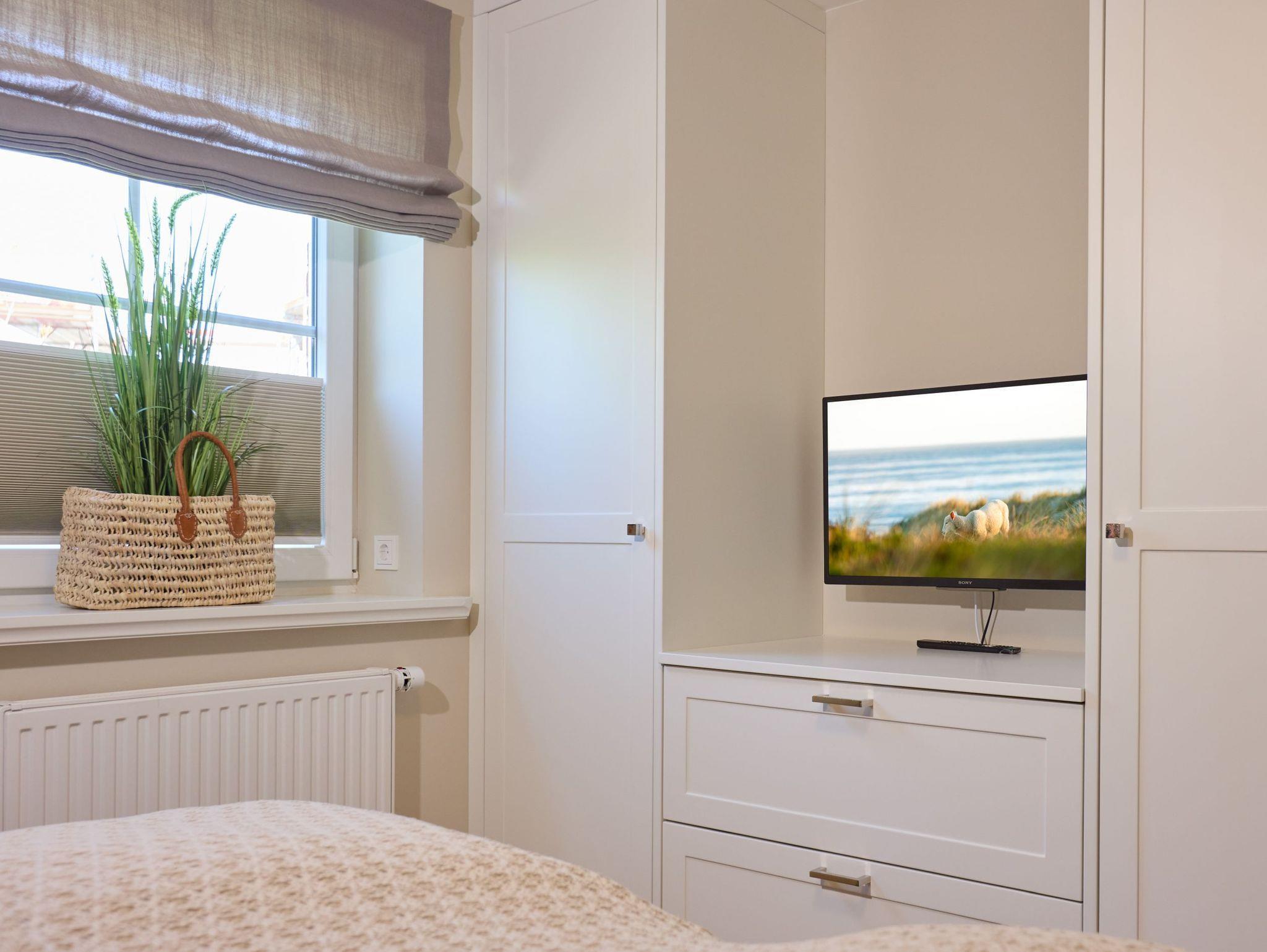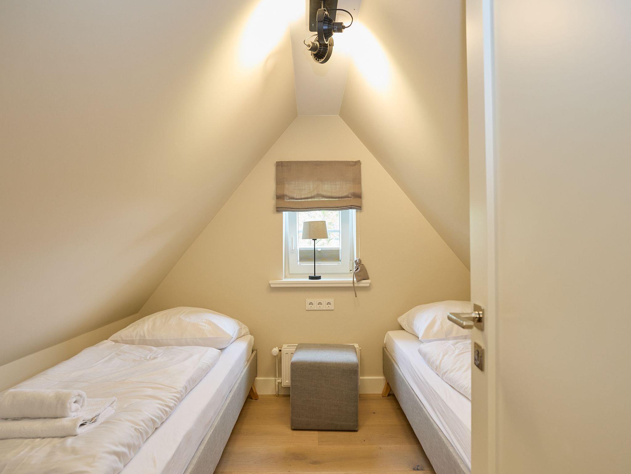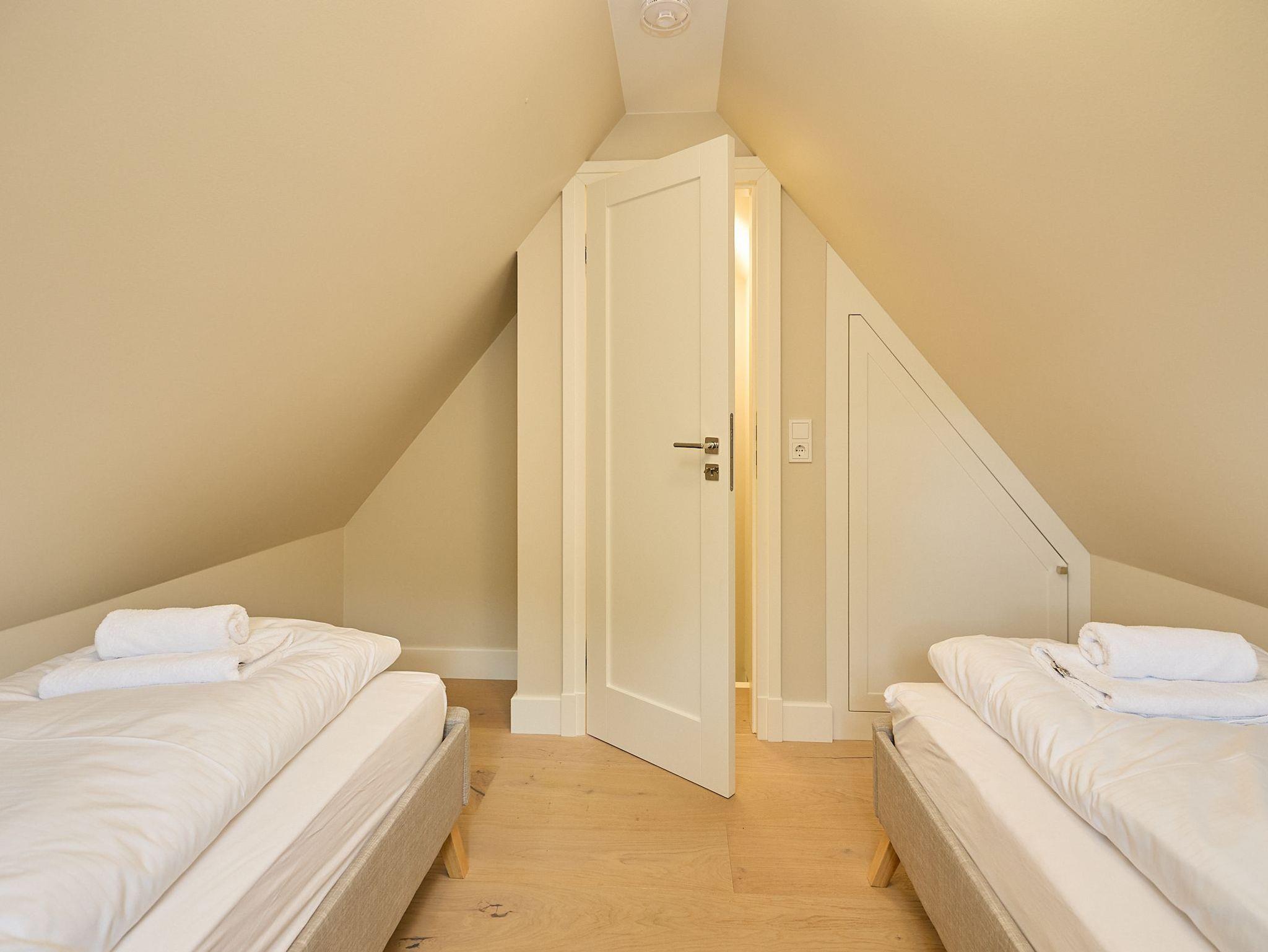 Folgen Sie nun der Treppe ins 1.OG erblicken Sie ein helles, modern ausgestattetes Duschbad sowie ein Schlafzimmer mit Doppelbett und ausreichend Stauraum, falls es ein längerer Aufenthalt sein soll. Folgen Sie der Treppe nun ein weiteres Stockwerk nach oben gelangen Sie in einen lichtdurchfluteten Spitzboden. Hier erwartet Sie ein zweites Schlafzimmer mit zwei Einzelbetten.