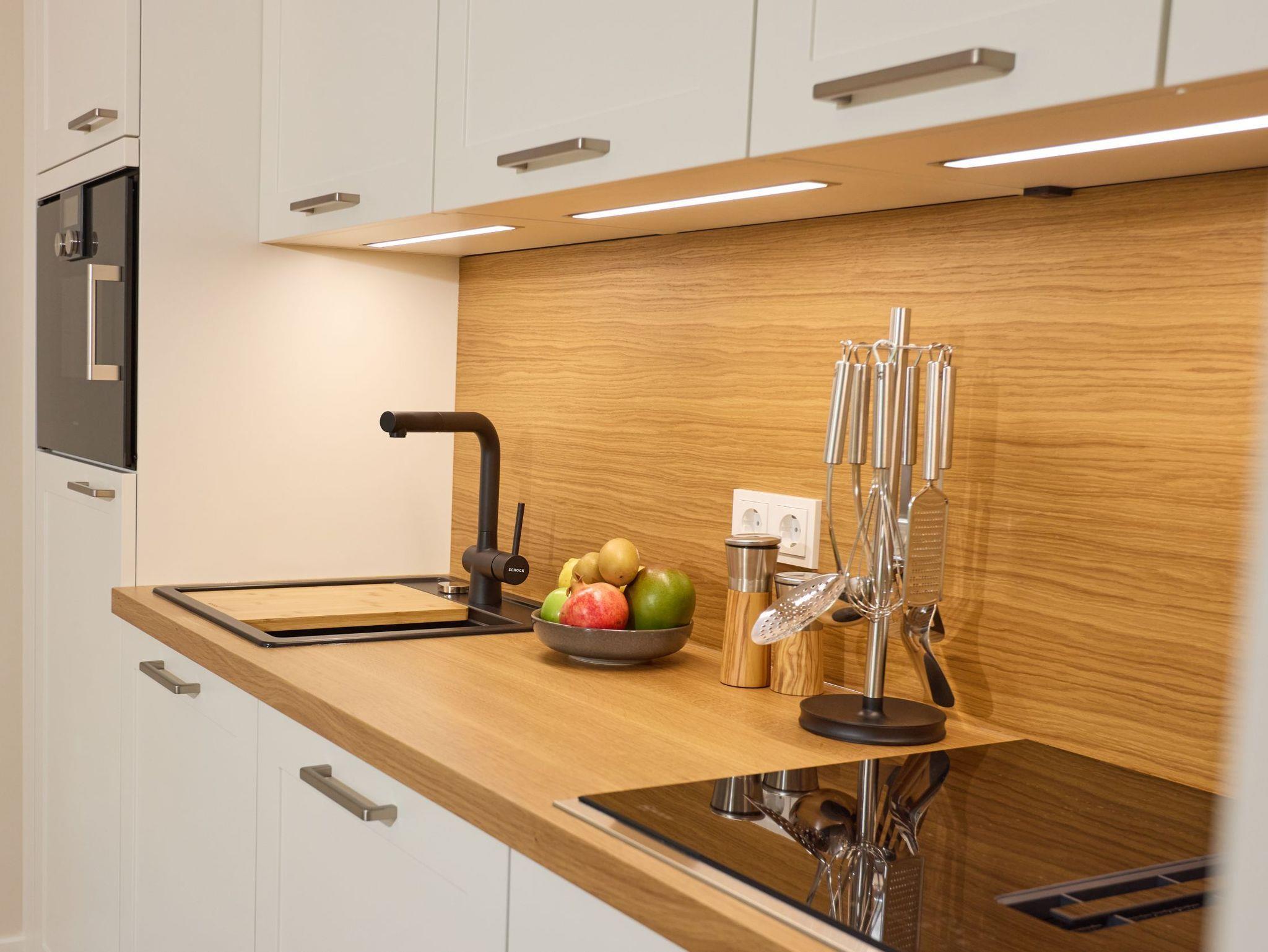 Die Küchenzeile ist mit modernen Elektrogeräten und Inventar ausgestattet und lässt auch was Ästhetik angeht keine Wünsche offen. Ein Esstisch mit 4 Stühlen sowie ein großes Sofa und eine kleine Leseecke mit Sessel runden diese schöne Wohnküche ab.