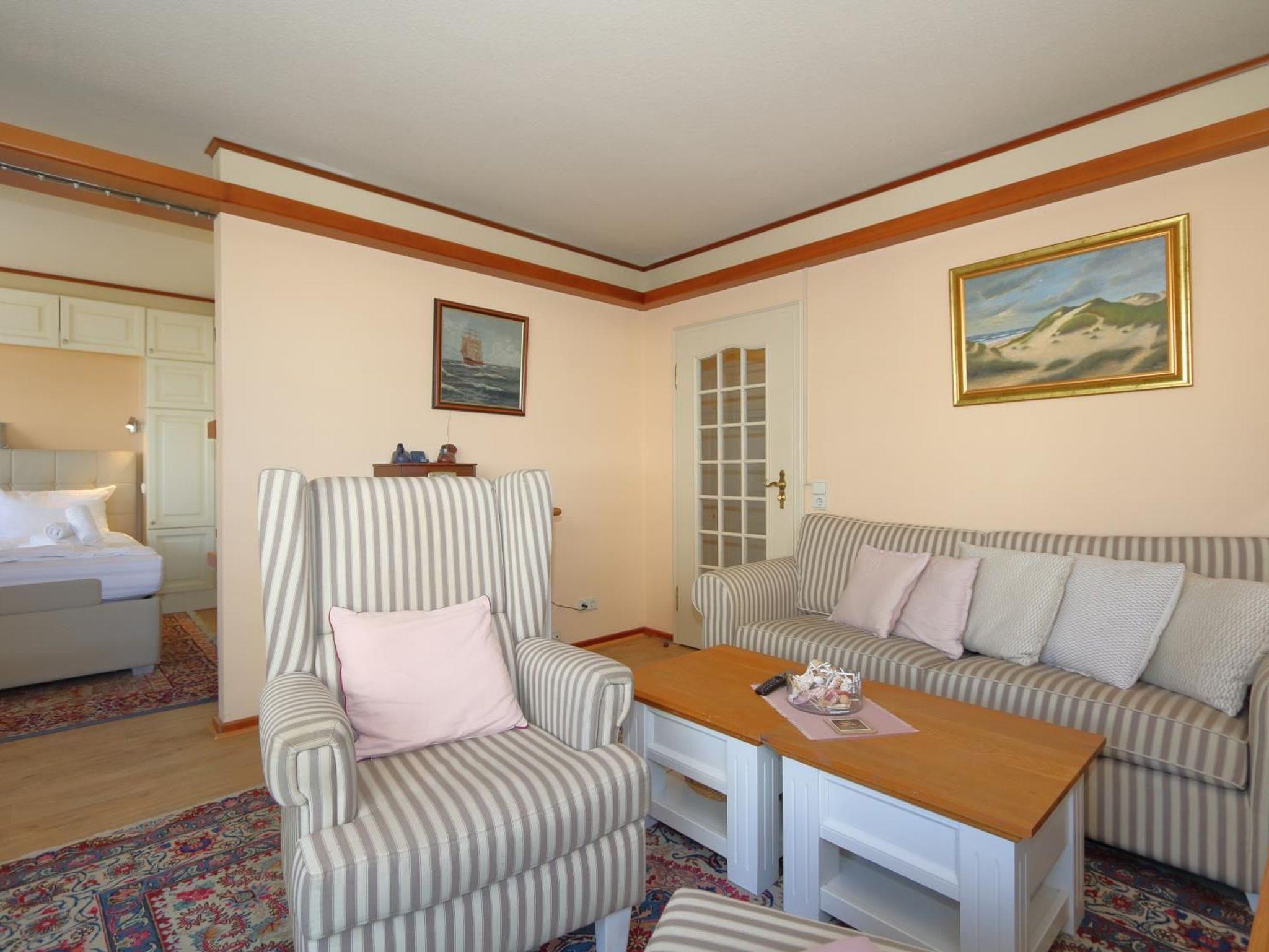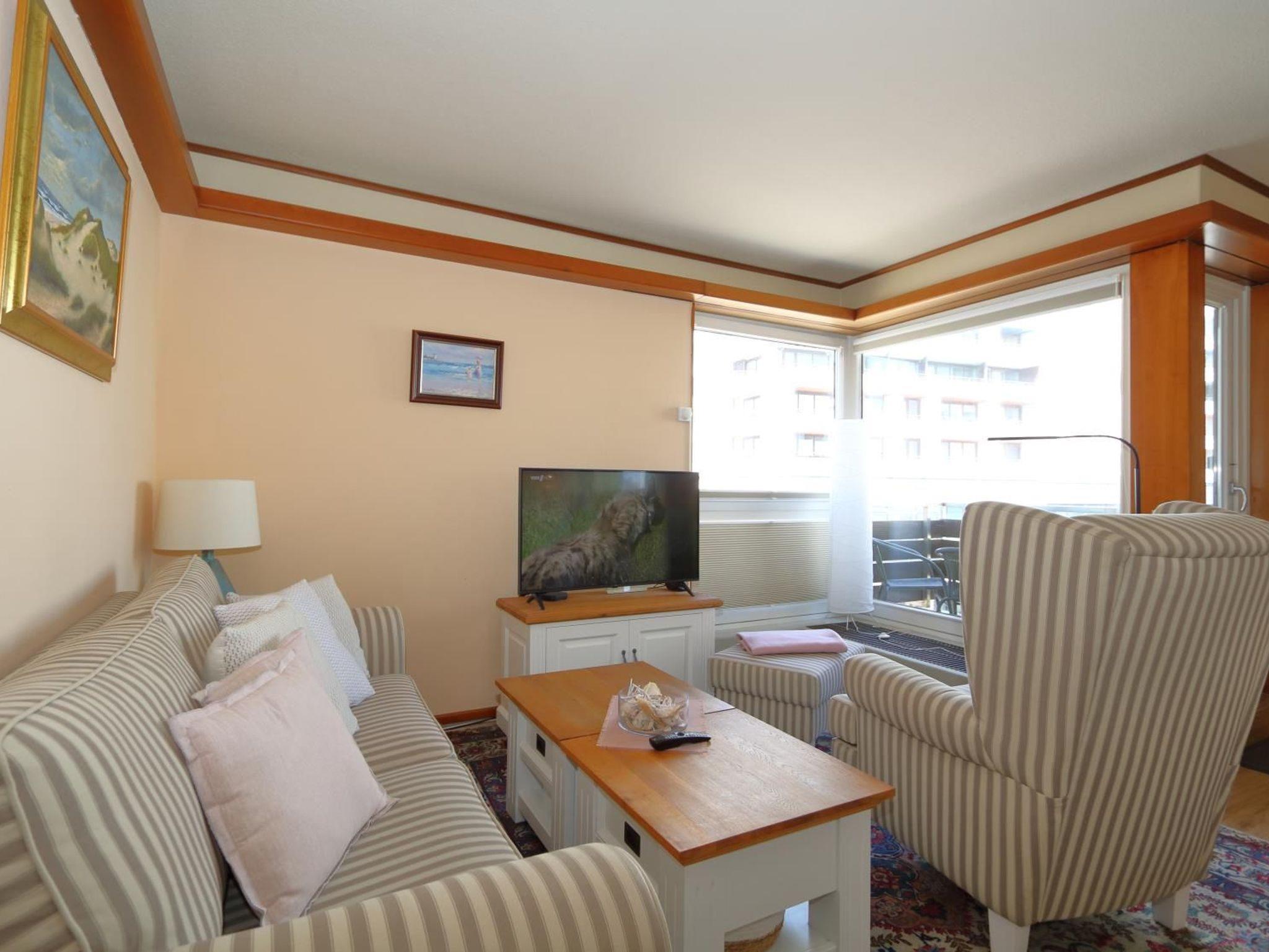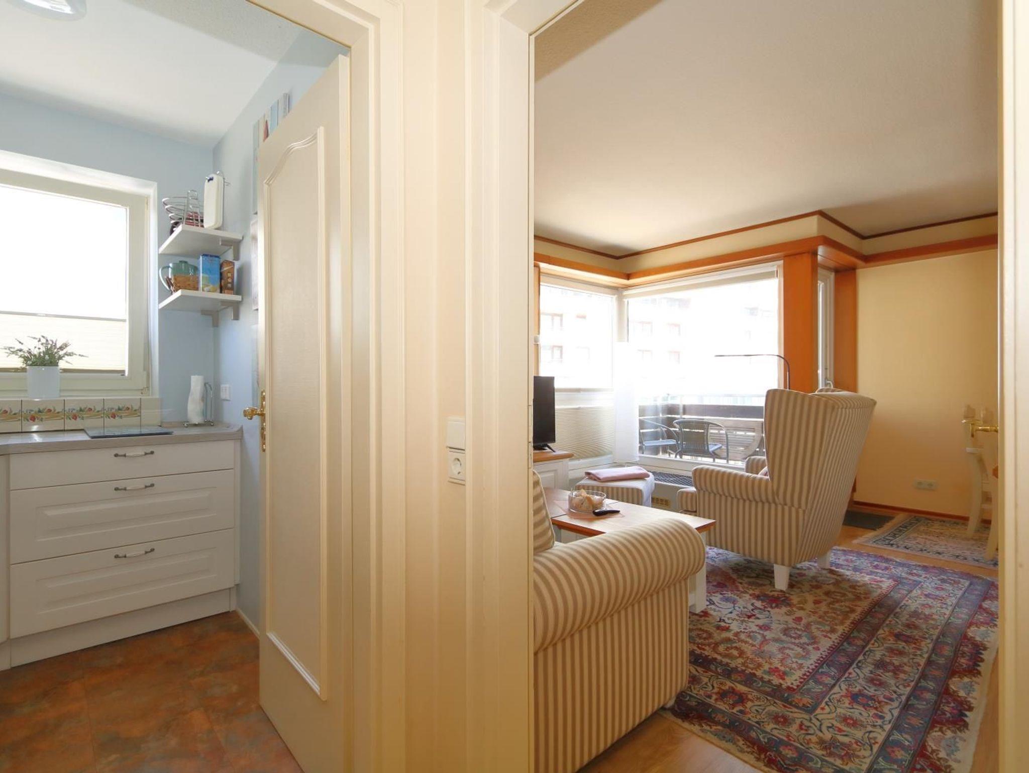 Das sehr gemütlich und seniorengerecht eingerichtete Appartement hat eine separate Küche mit Fenster, Microwelle und Spülmaschine. Das innen liegende Duschbad verfügt über eine erhöhte Toilette, Handtuchheizkörper und überall Griffe zum Festhalten. Im Wohnraum finden Sie eine gemütliche Sitzgarnitur und einen Essplatz. In einer Nische befindet sich ein extra hohes Box-Spring-Bett mit getrennten Matratzen, die Einbauschänke bieten ausreichend Platz .Aus dem Wohnraum und vom vorgelagerten kleinen Balkon haben Sie einen wundervollen Ausblick aufs Meer und auf die Fussgängerzone.