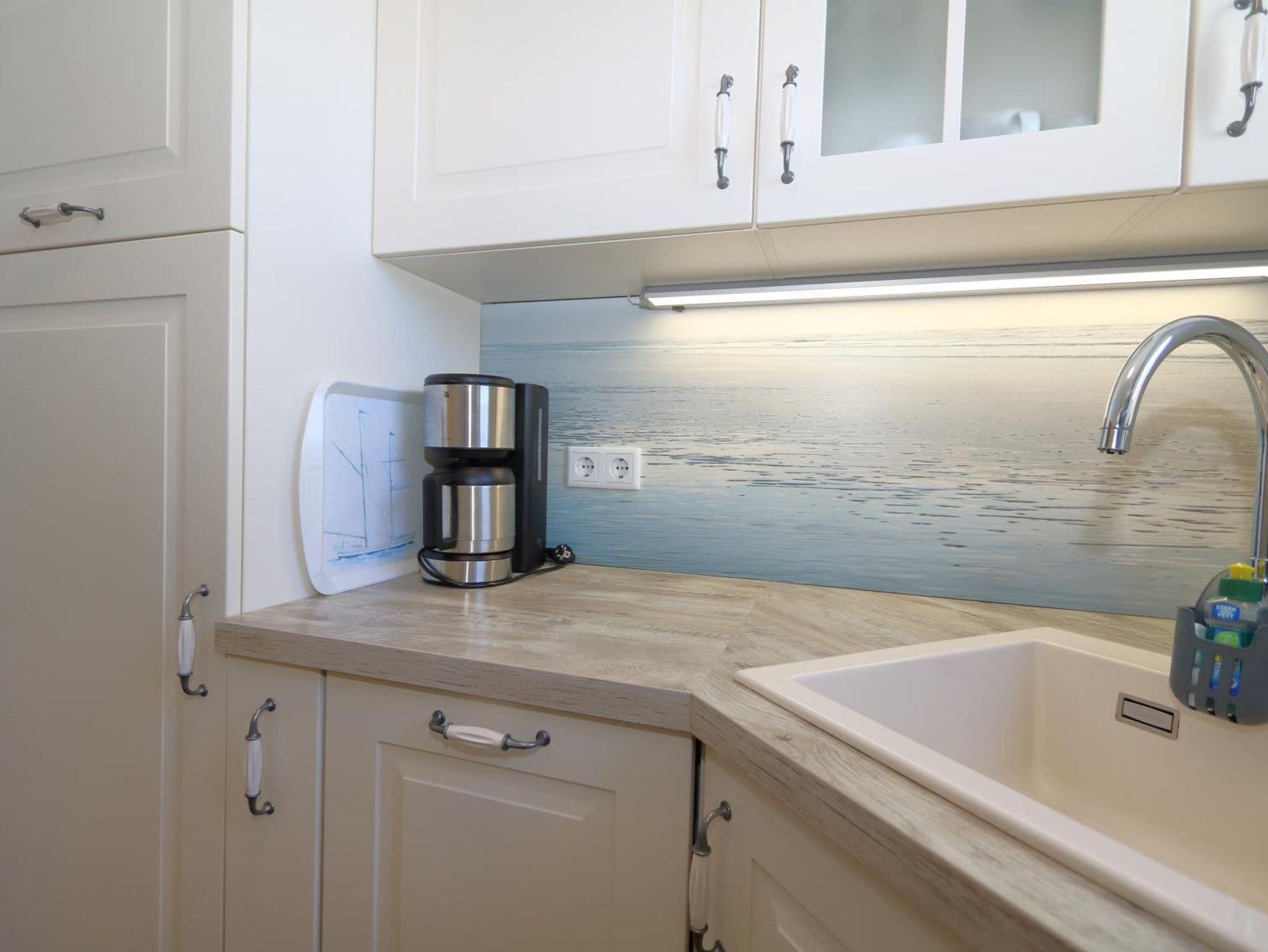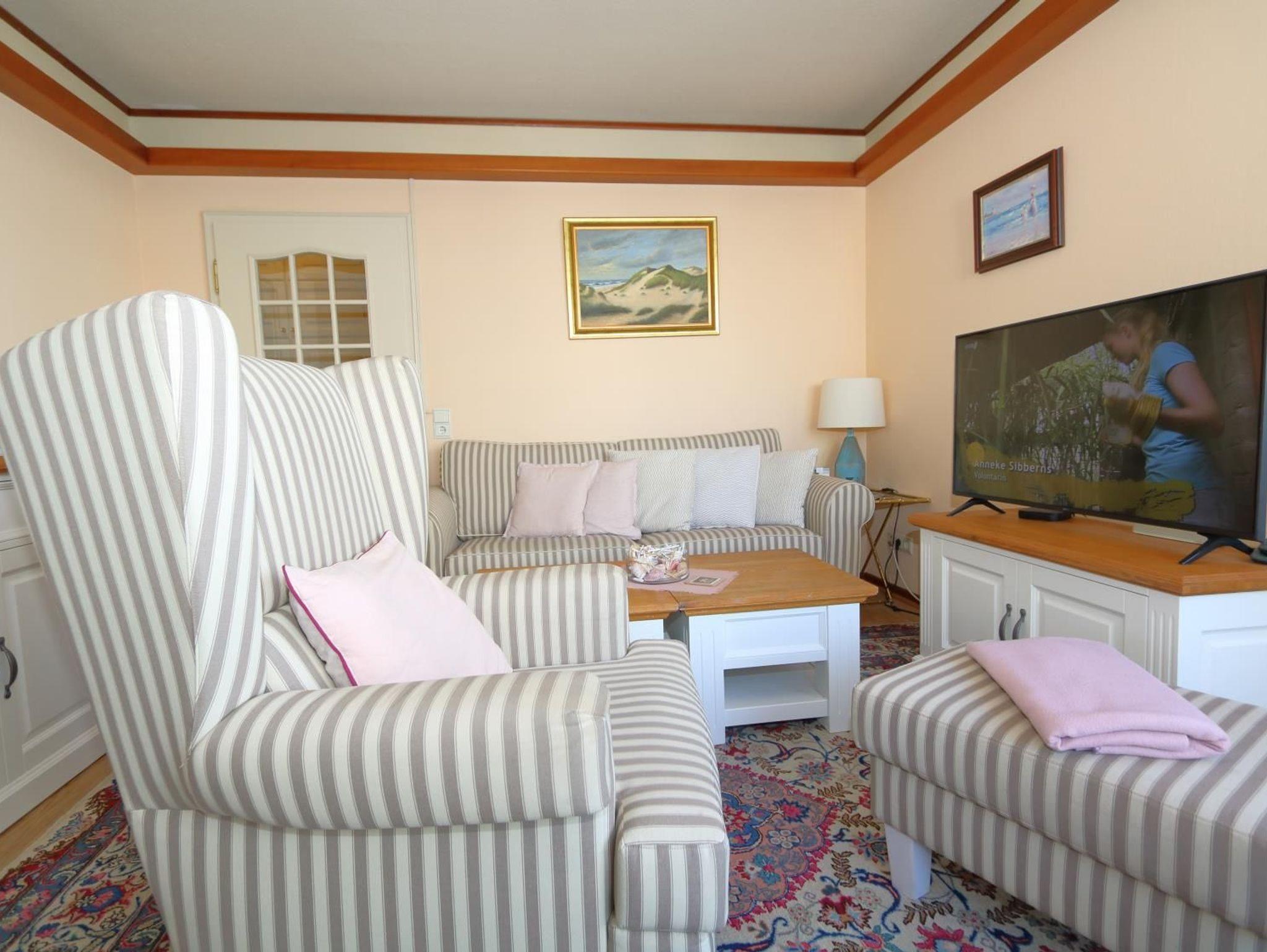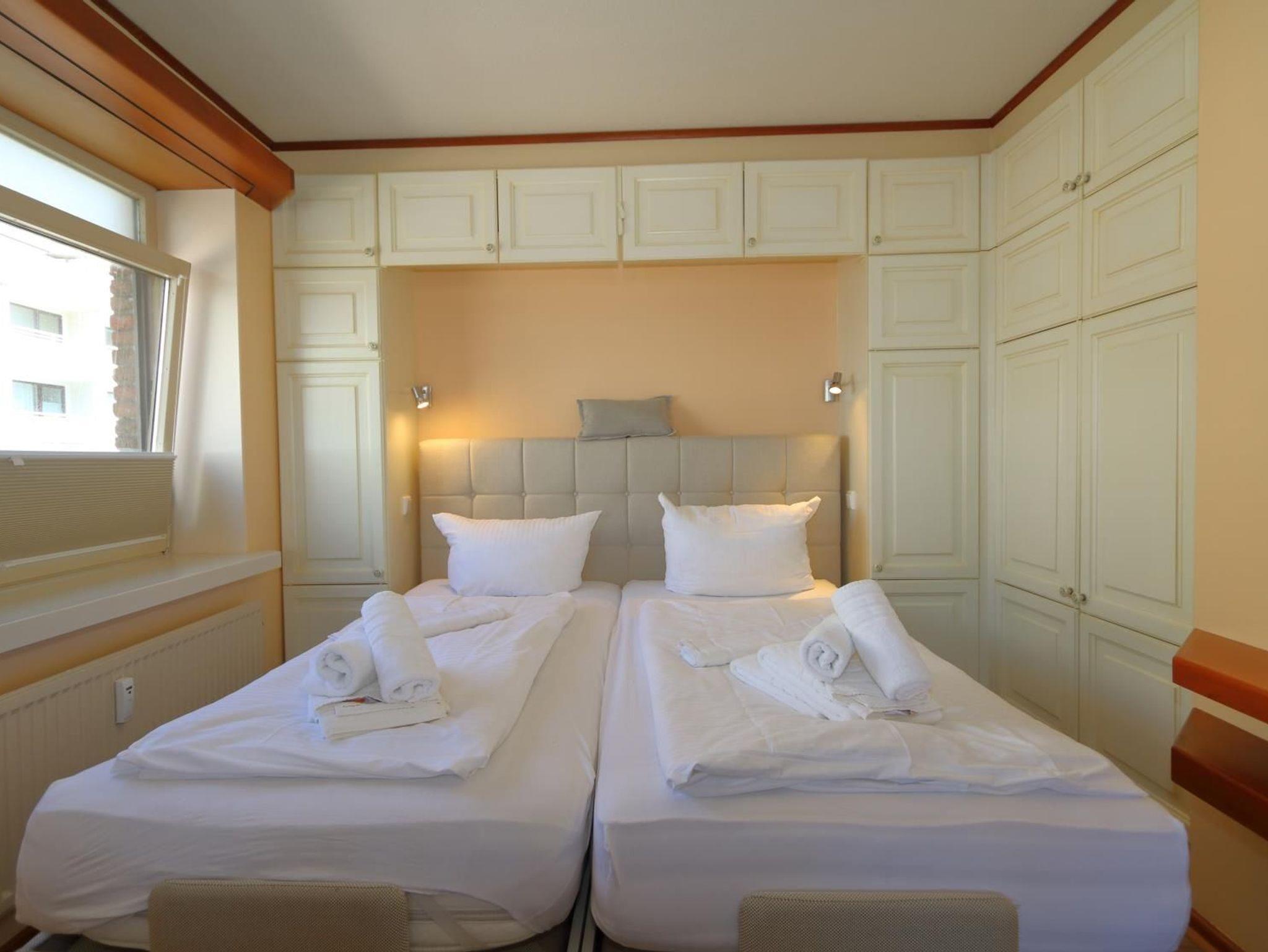 Das sehr gemütlich und seniorengerecht eingerichtete Appartement hat eine separate Küche mit Fenster, Microwelle und Spülmaschine. Das innen liegende Duschbad verfügt über eine erhöhte Toilette, Handtuchheizkörper und überall Griffe zum Festhalten. Im Wohnraum finden Sie eine gemütliche Sitzgarnitur und einen Essplatz. In einer Nische befindet sich ein extra hohes Box-Spring-Bett mit getrennten Matratzen, die Einbauschänke bieten ausreichend Platz .Aus dem Wohnraum und vom vorgelagerten kleinen Balkon haben Sie einen wundervollen Ausblick aufs Meer und auf die Fussgängerzone.