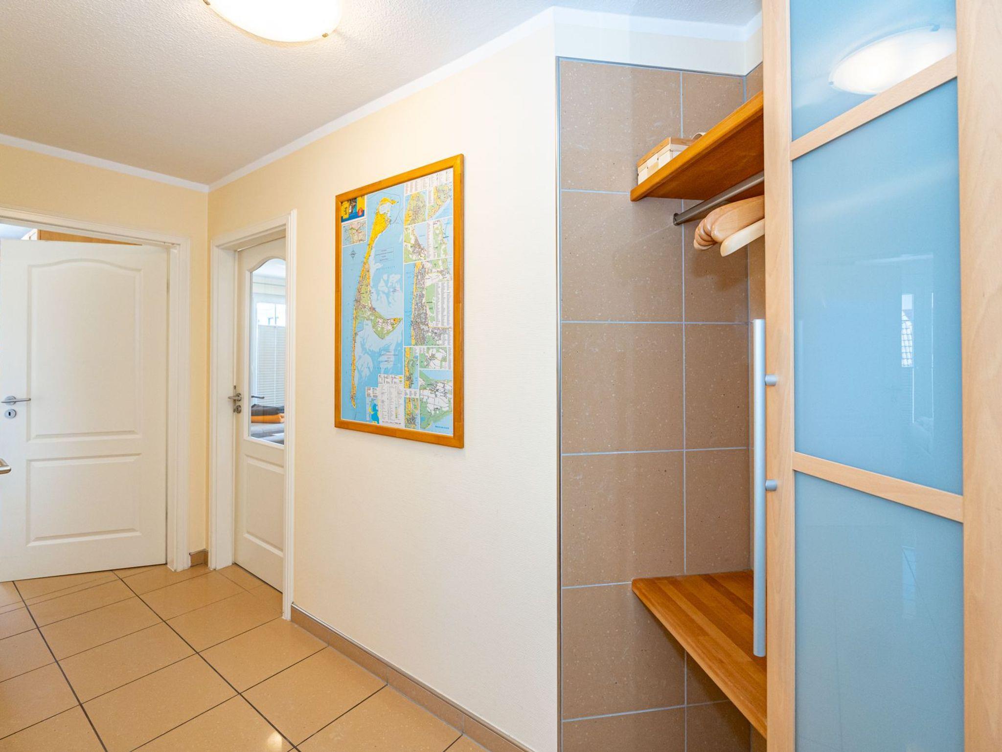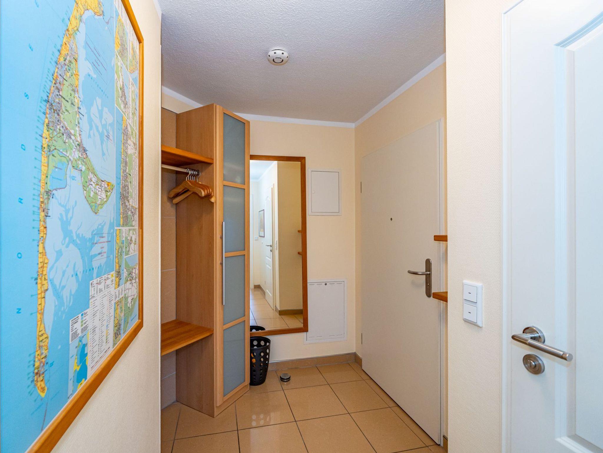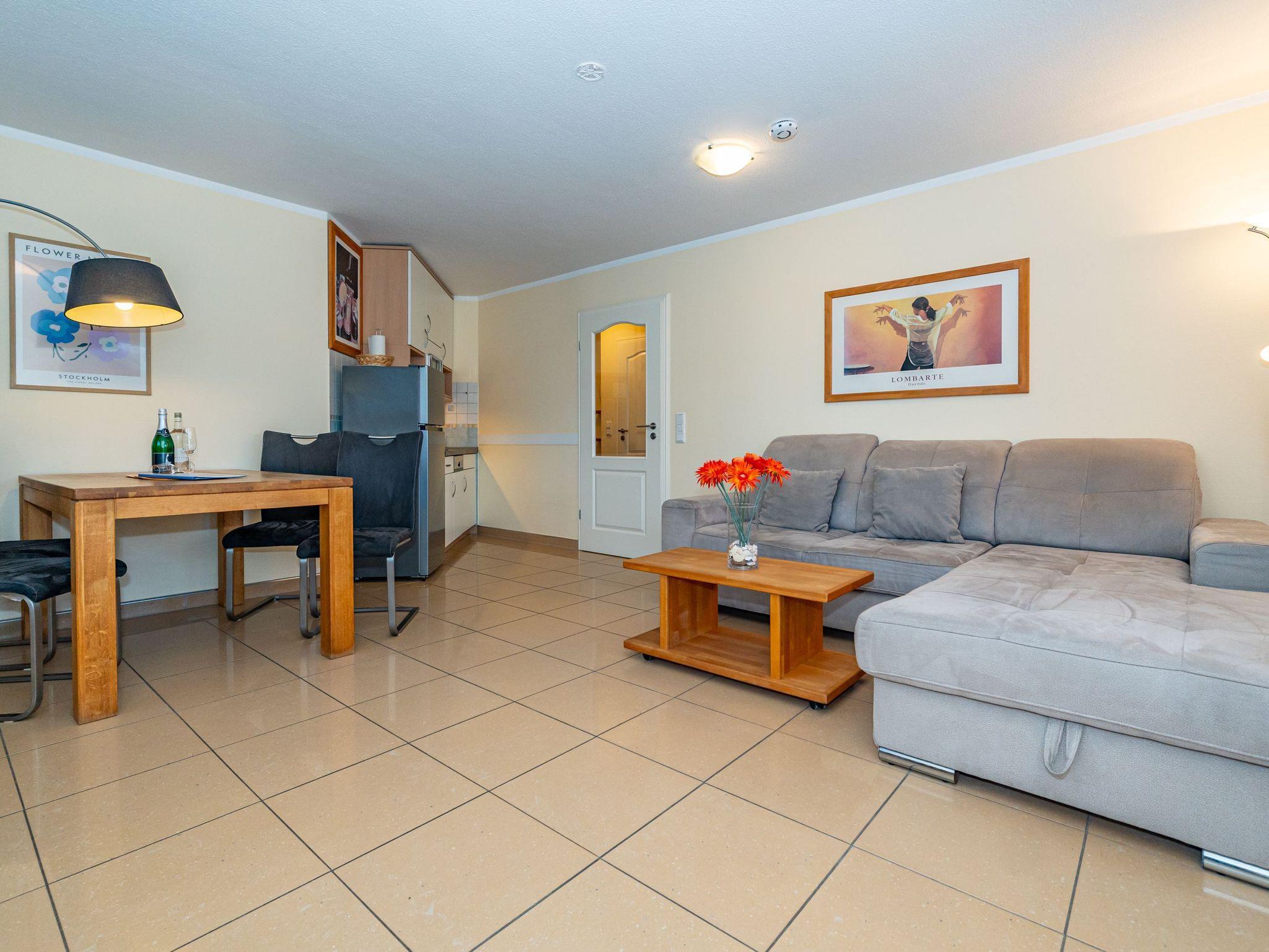 Vom Vorflur mit Garderobe gelangt man in das schicke Wohnzimmer (mit Austritt zum Balkon, mit Strandkorb, Balkonmöbeln und Auflagen), in das geräumige Duschbad/WC und in das Schlafzimmer.