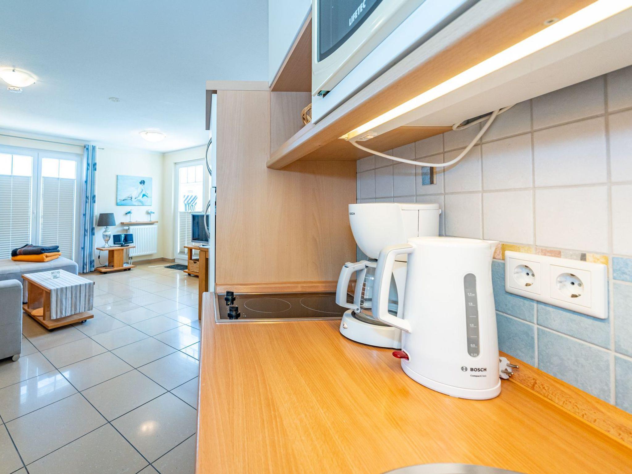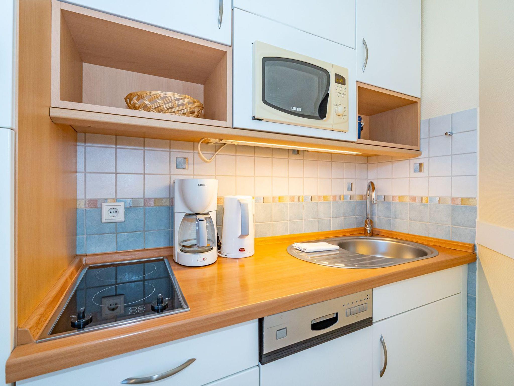 Die moderne Küchenzeile hat einen Geschirrspüler, Mikrowelle mit Grillfunktion, ein 2-Platten-Ceranfeld und einen Kühlschrank mit 3-Sterne-Gefrierfach.