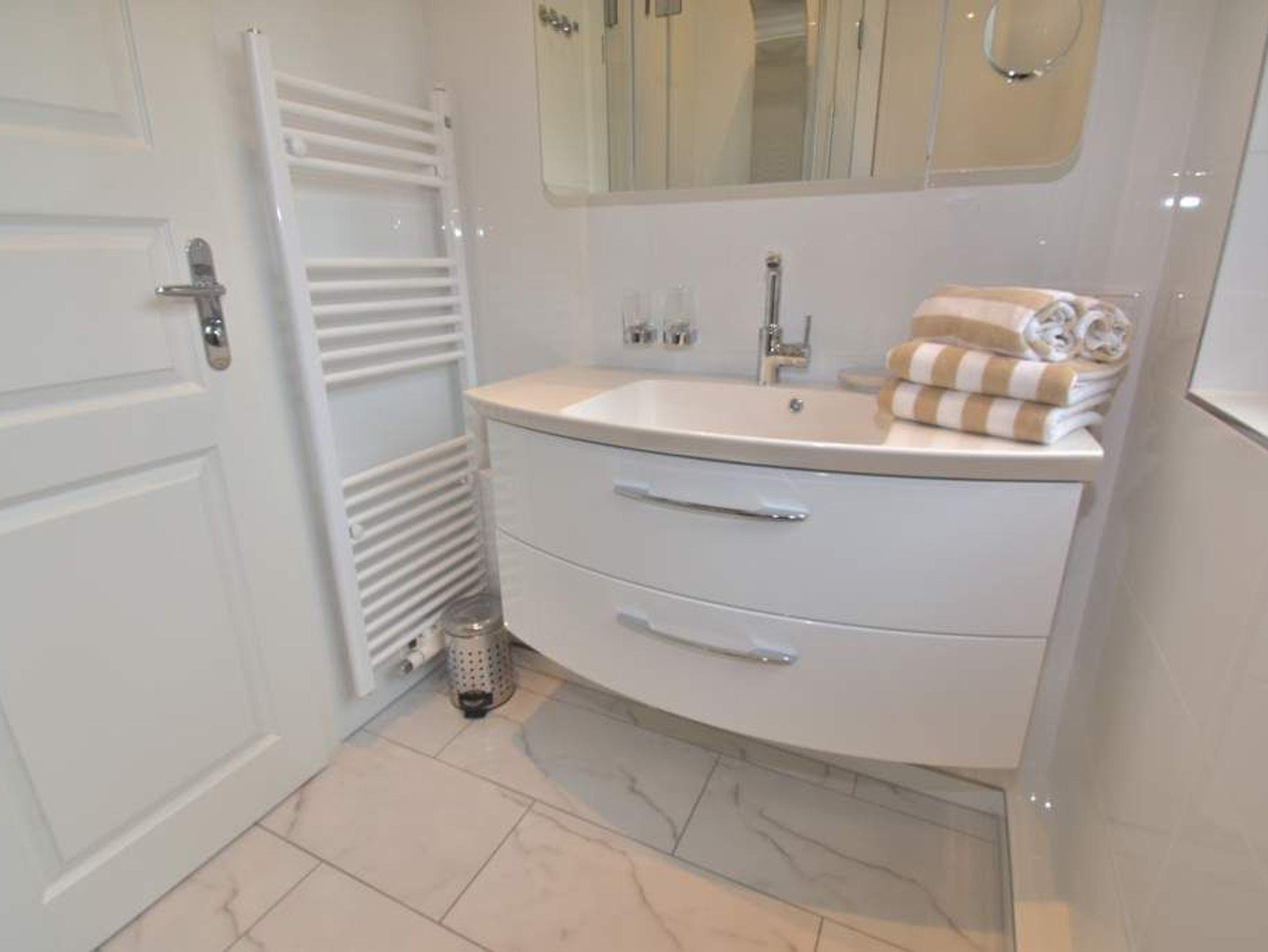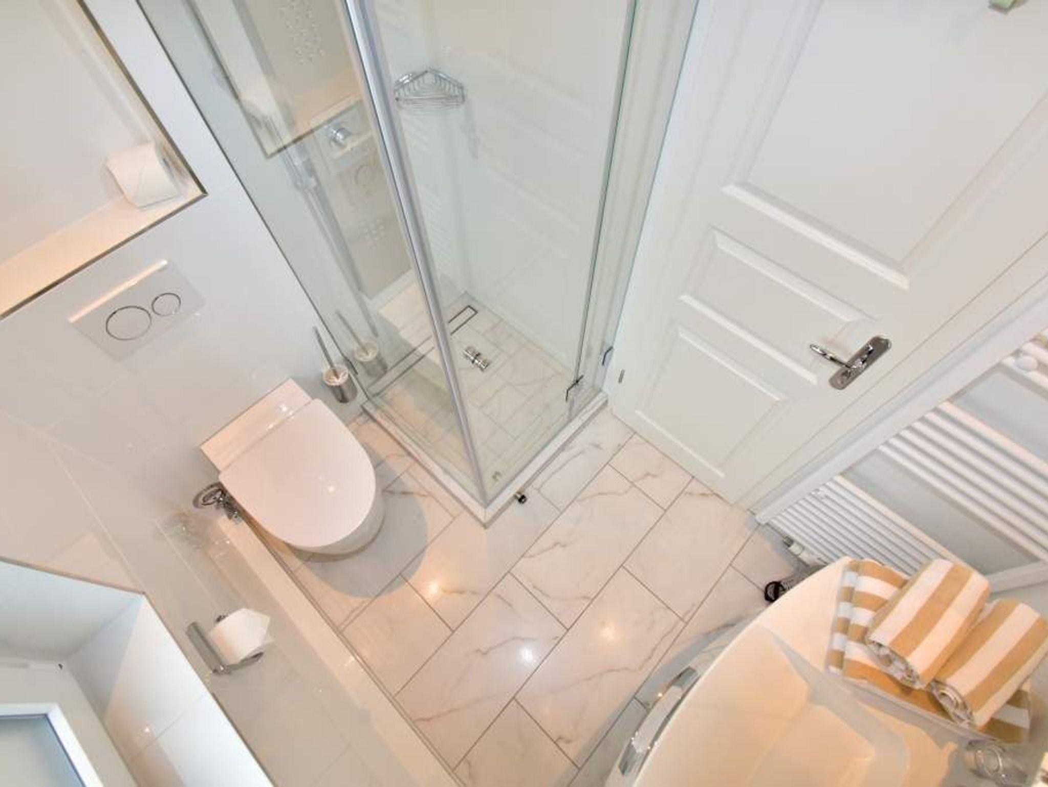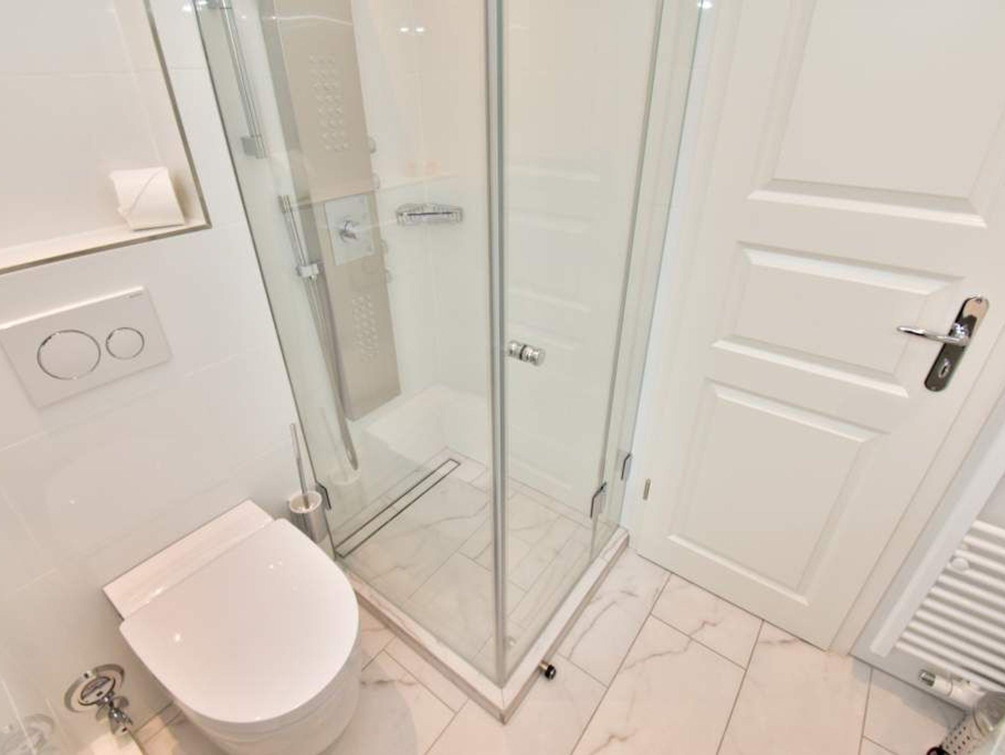Das elegante Badezimmer besticht mit einer raffinierten Duschpaneele in einer eigenen, transparenten Duschkabine mit extraflachem Einstieg sowie einer modernen Geberit-Toilette. Ein Fön und ein Handtuchtrockner ergänzen den praktischen Waschtisch mit Unterbau und Spiegelschrank.