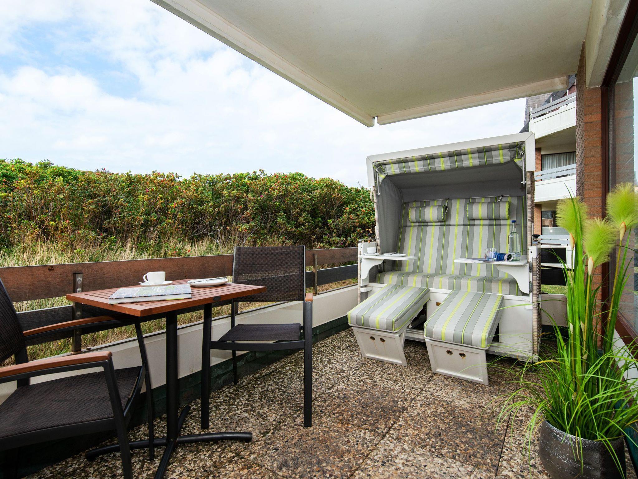 Der großzügige Balkon zur Meer- und Westseite, ausgestattet mit einem behaglichen Strandkorb auf Rollen, lädt in der Nachmittagssonne zum Entspannen ein.