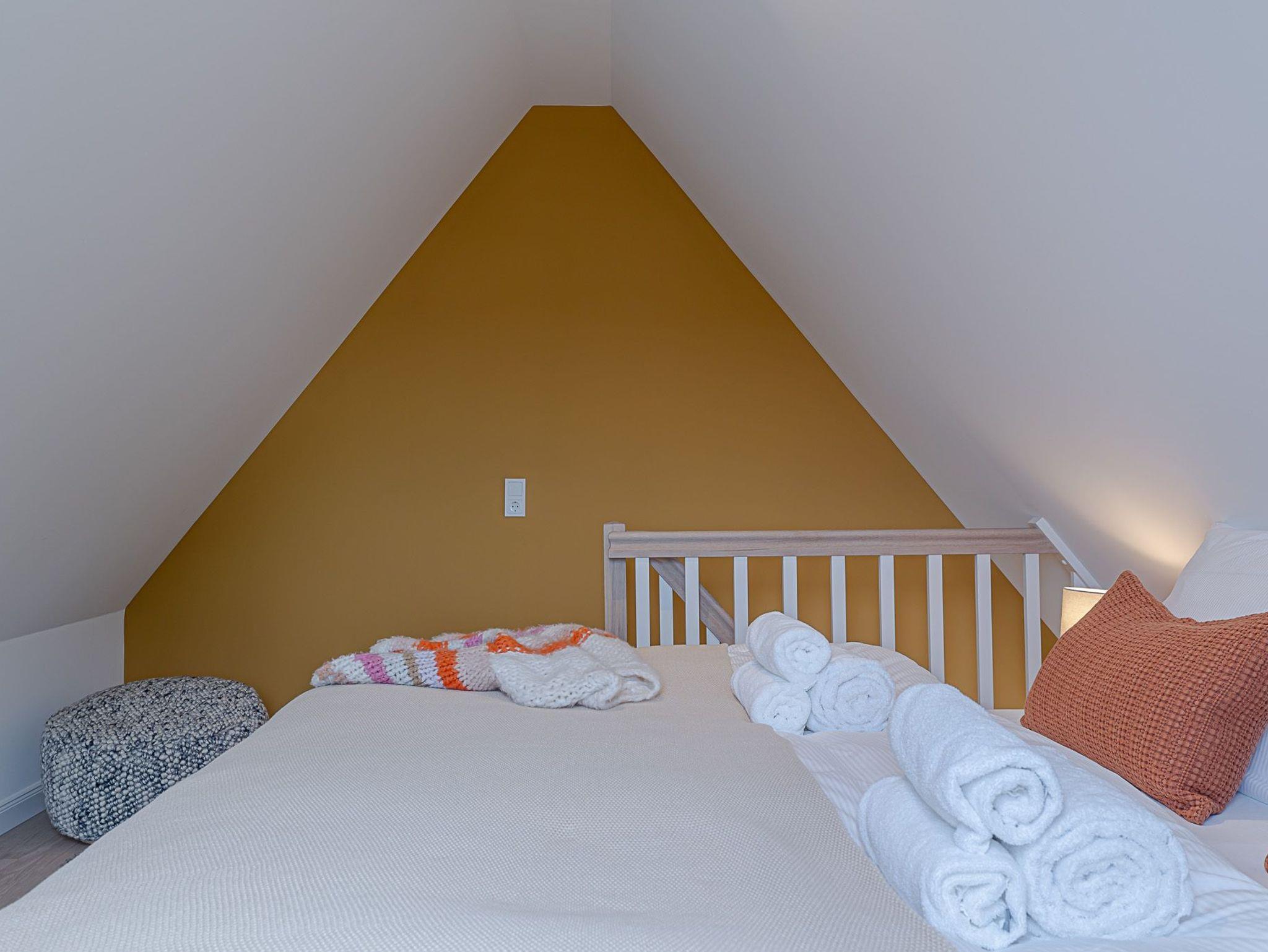 Neigt sich der Tag dem Ende, entspannen Sie auf Ihrem Oberdeck! Das Schlafzimmer ist über die Treppe erreichbar und erwartet Sie mit einem komfortablen Boxspringbett, welches sich dem Körper hervorragend anpasst und somit für einen erholsamen Schlaf sorgt.