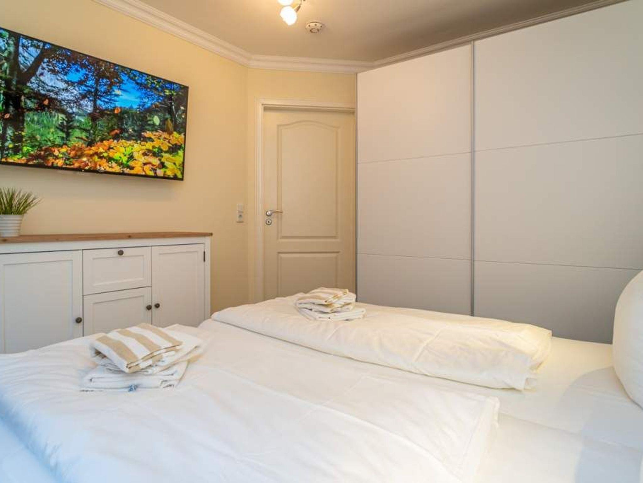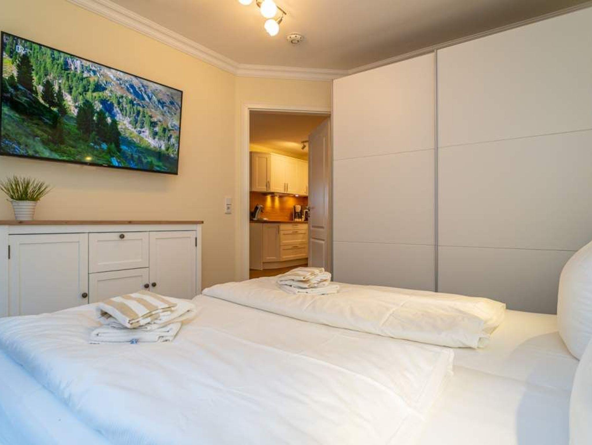 Im großen Schlafzimmer finden Sie ein freistehendes Doppelbett mit guten Einzelmatratzen (Liegefläche jeweils 90 x 200 cm), einen großzügigen Schwebetürenschrank, 1 weiteren Flachbild-TV, Kommoden sowie Nachttische vor.