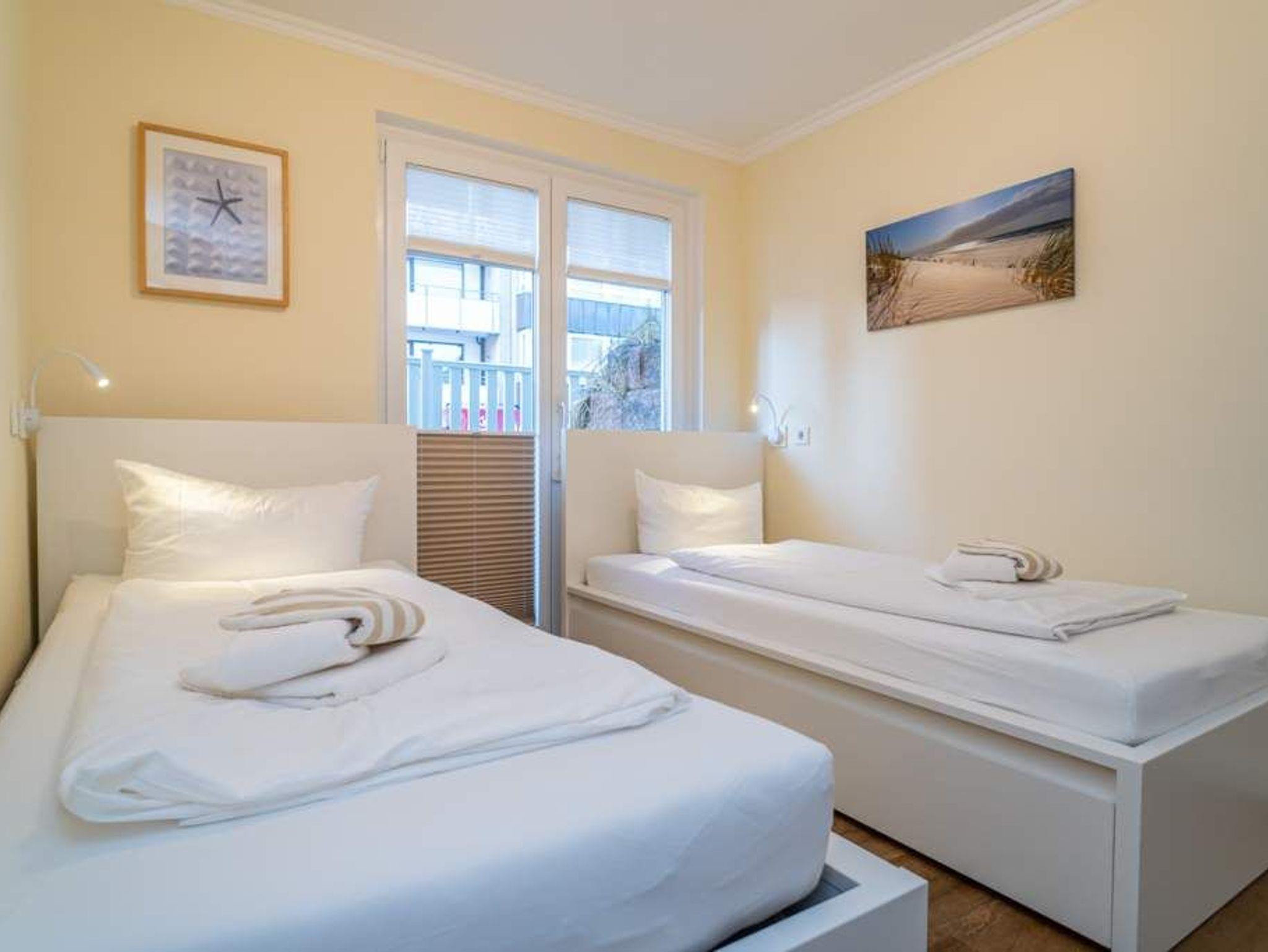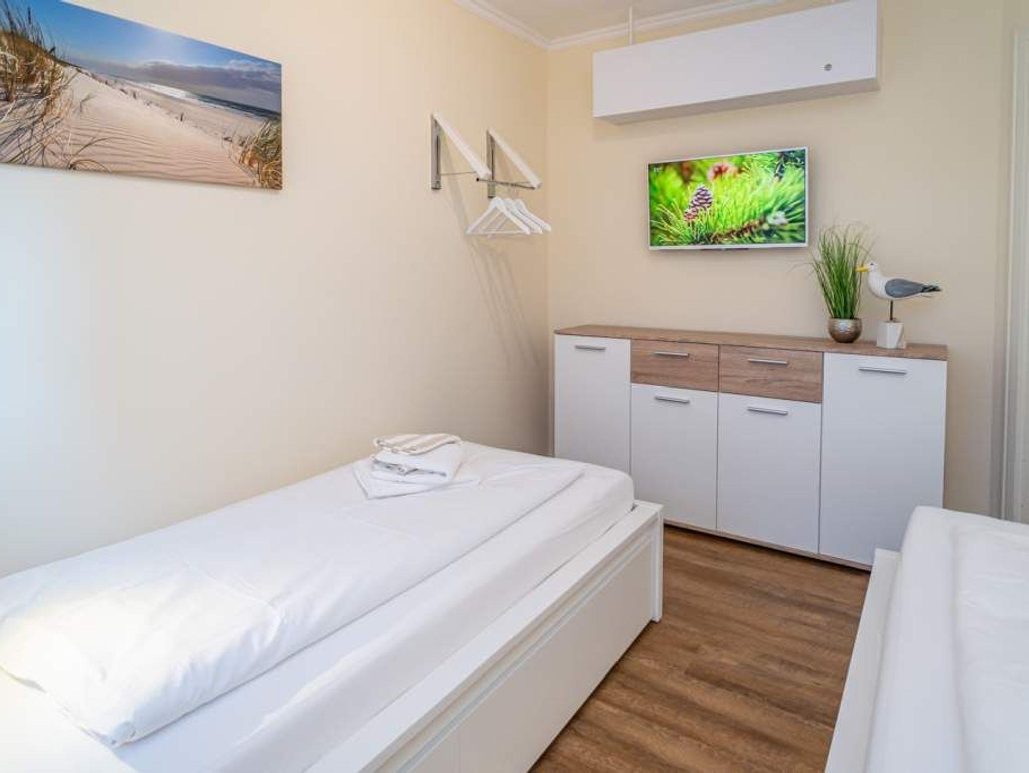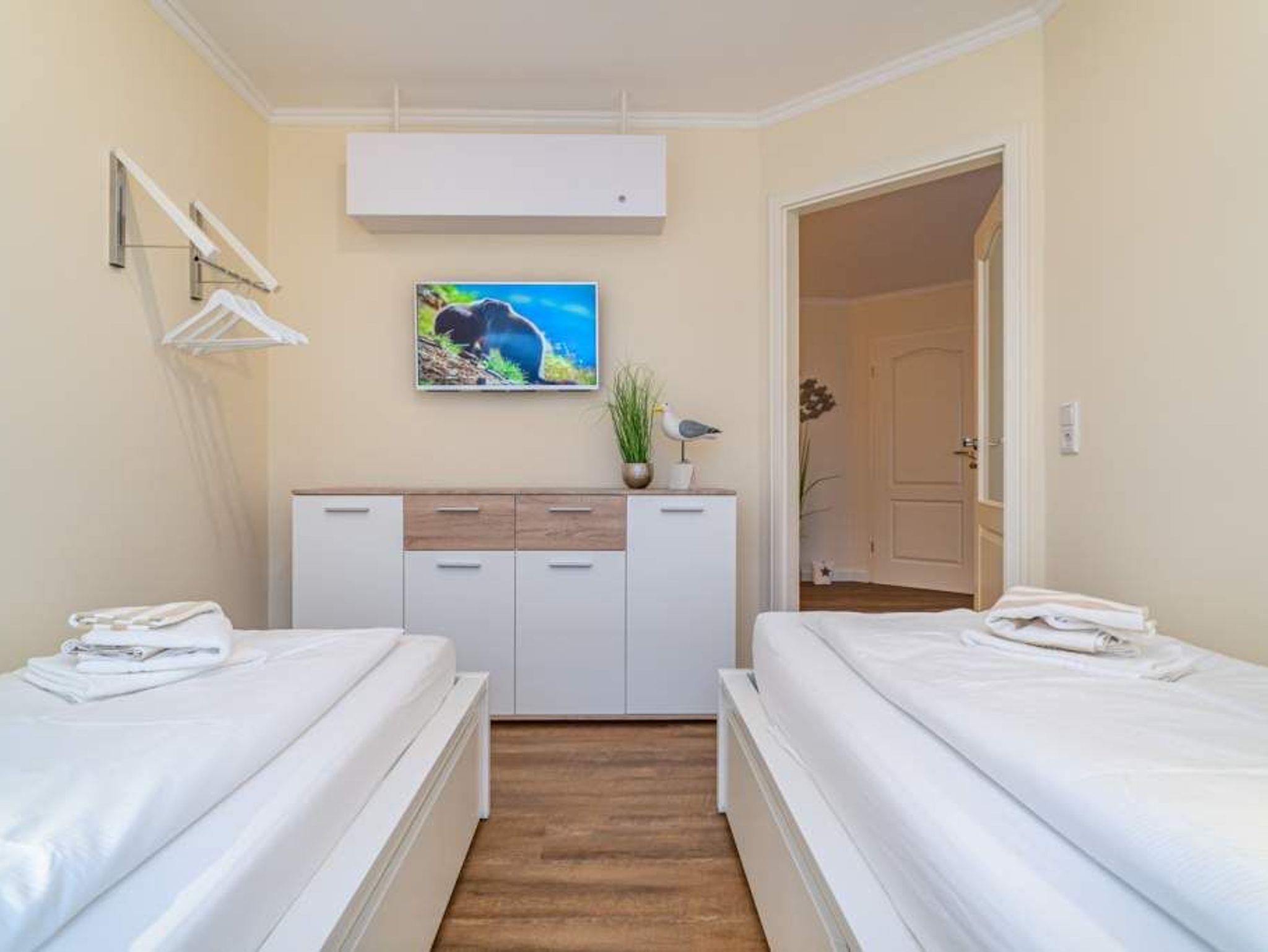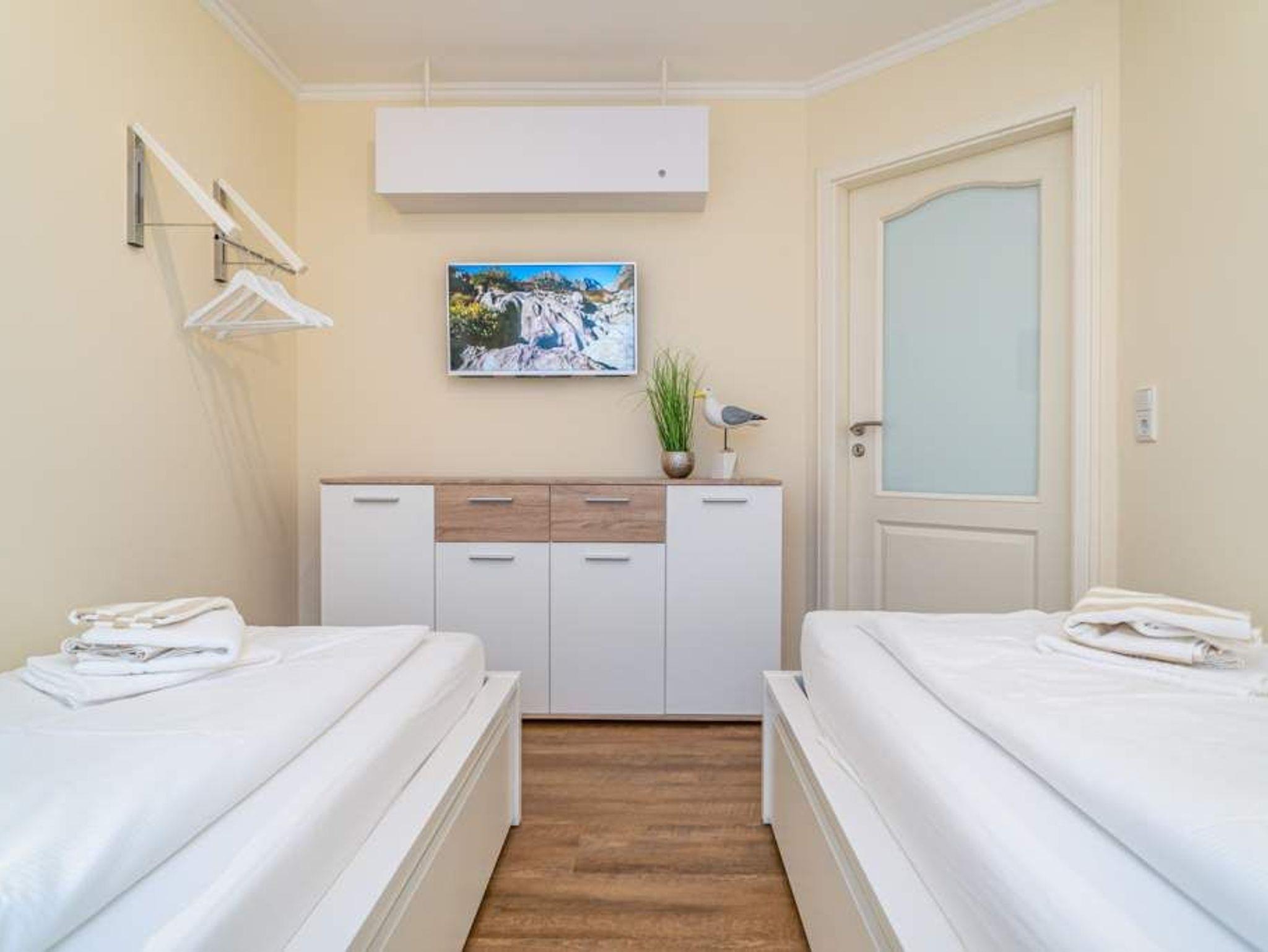 Das zweite Schlafzimmer ist mit zwei Einzelbetten (Liegefläche jeweils 90 x 200 cm) mit großen Schubladen (Gepäck praktisch verstaut), 1 weiteren Flachbild-Fernseher (Wandmontage) mit Kabelanschluss, sowie Kommode ausgestattet. Beide Schlafräume lassen sich mit Dim-Out-Plissees gut abdunkeln.