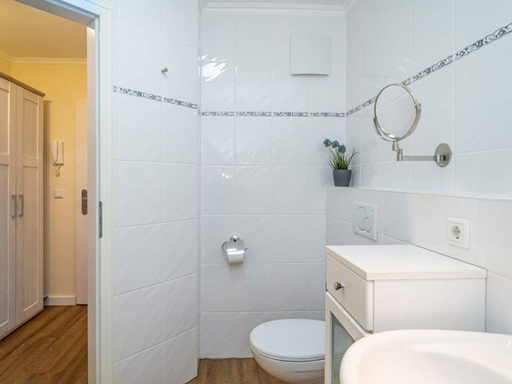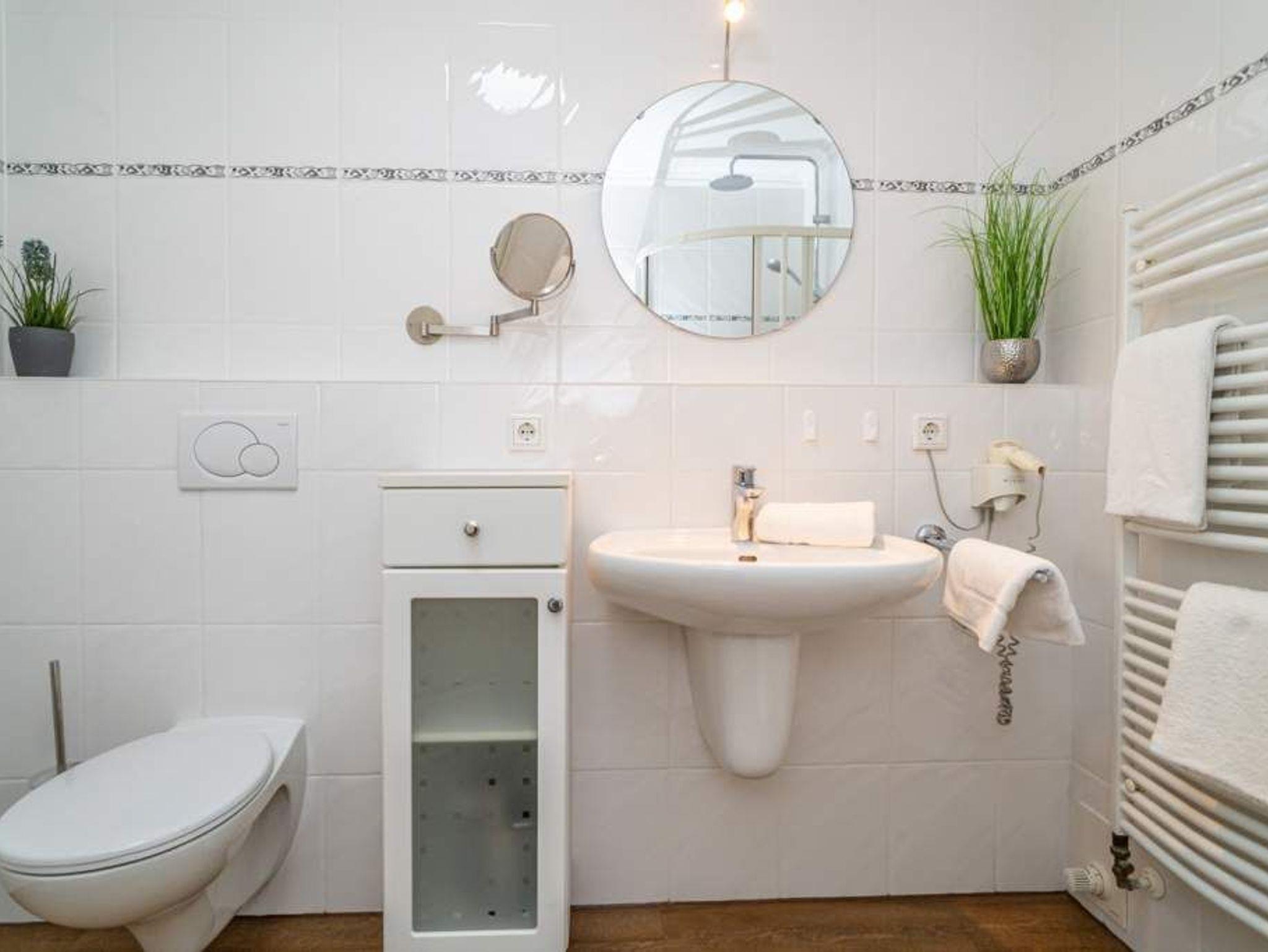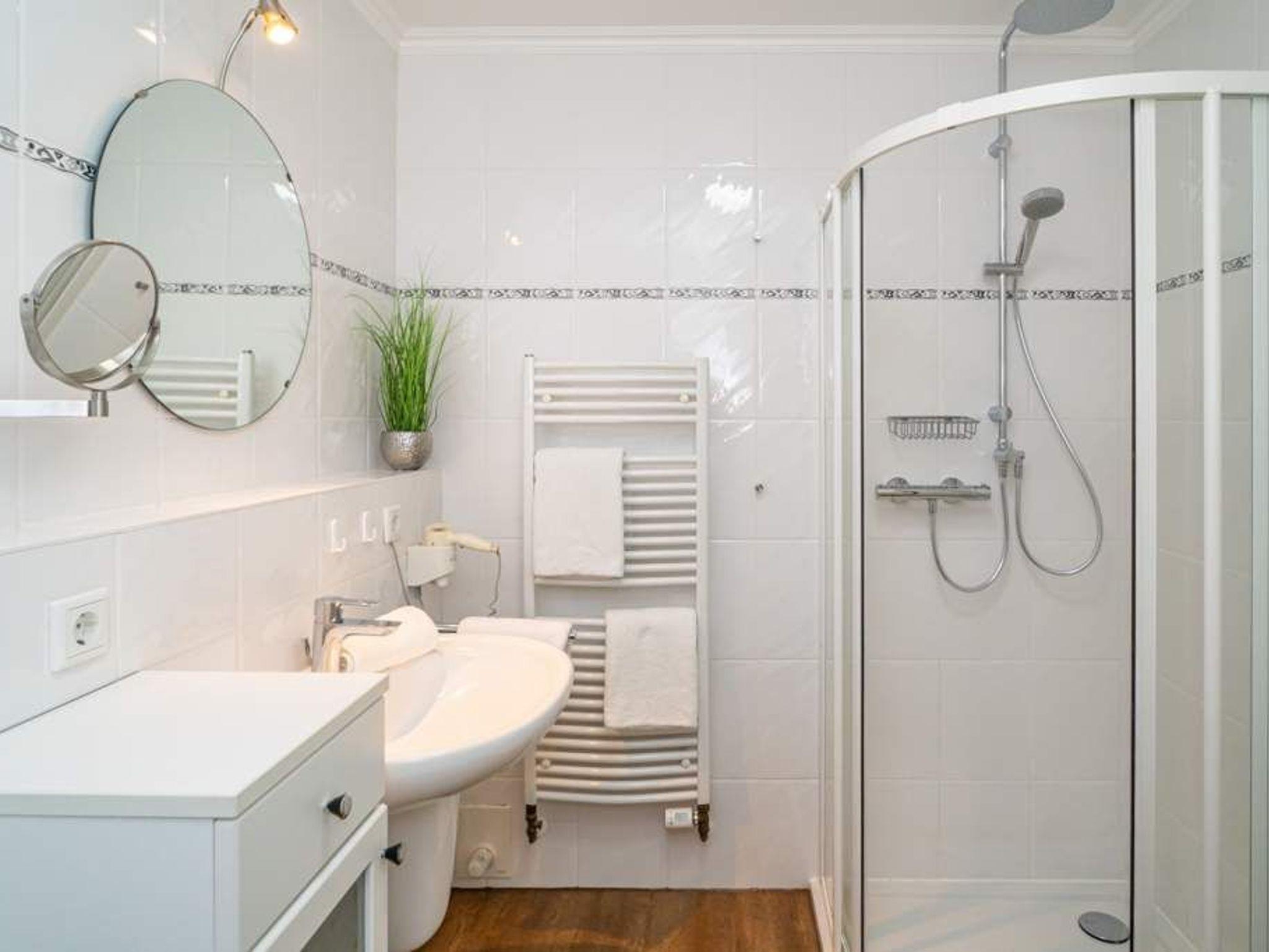 Im modernen Badezimmer mit Fußbodenheizung, befinden sich eine Dusche mit extraflachem Einstieg, ein Waschtisch, ein Handtuchtrockner, Fön, Kosmetikspiegel und WC.
