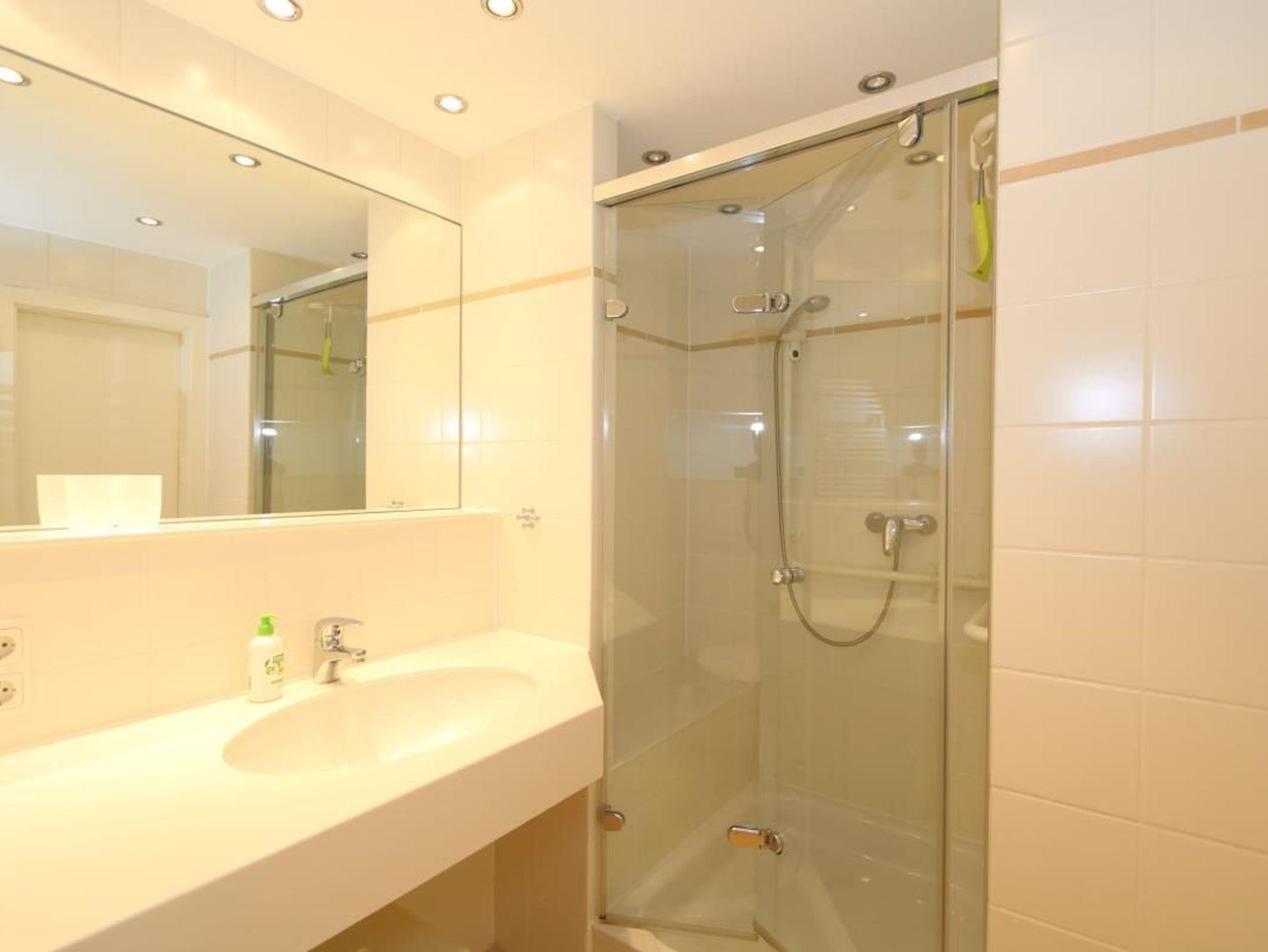 WC, Dusche, Waschbecken, Spiegel und ausreichend Handtücher und Vorleger.