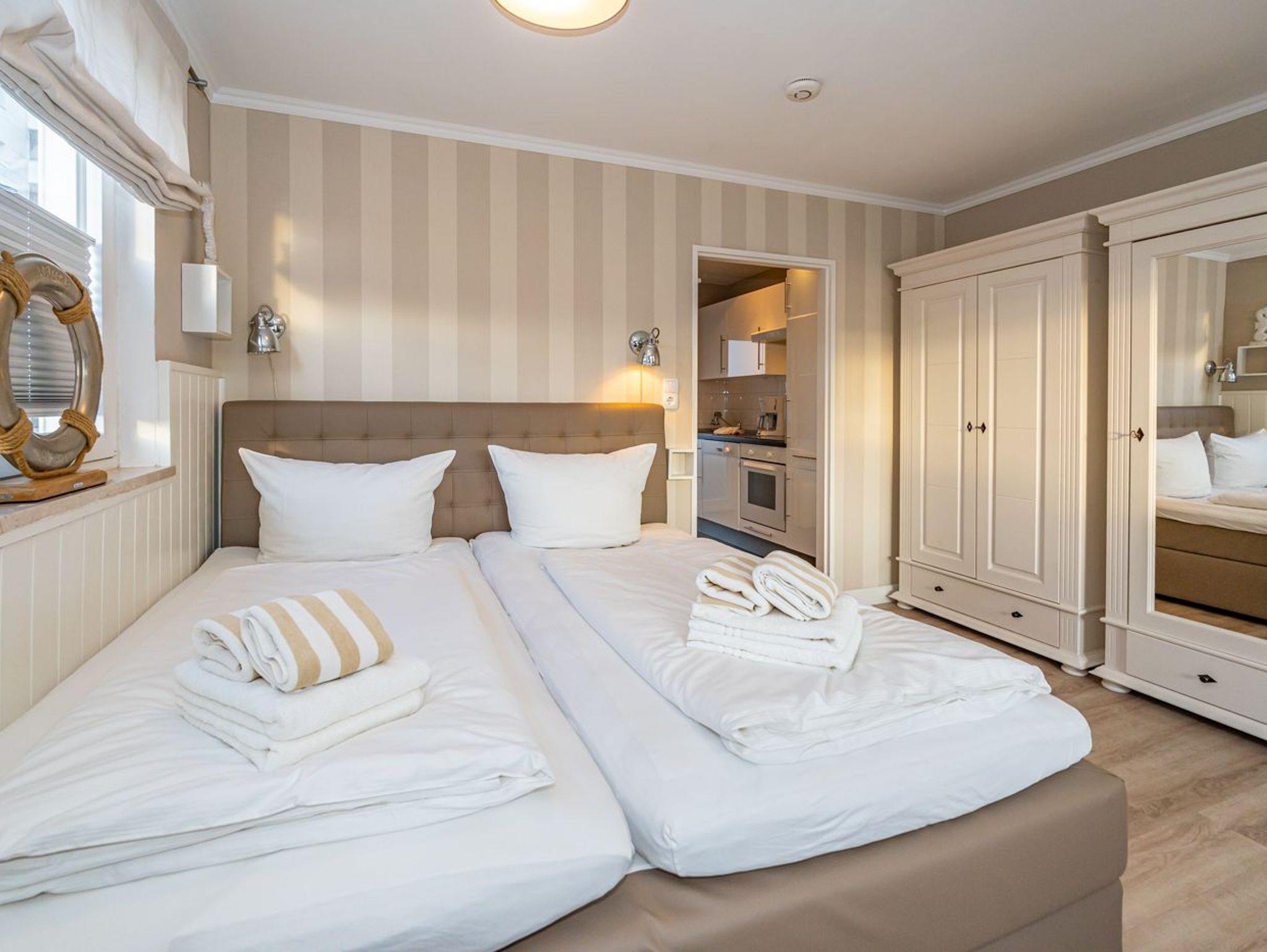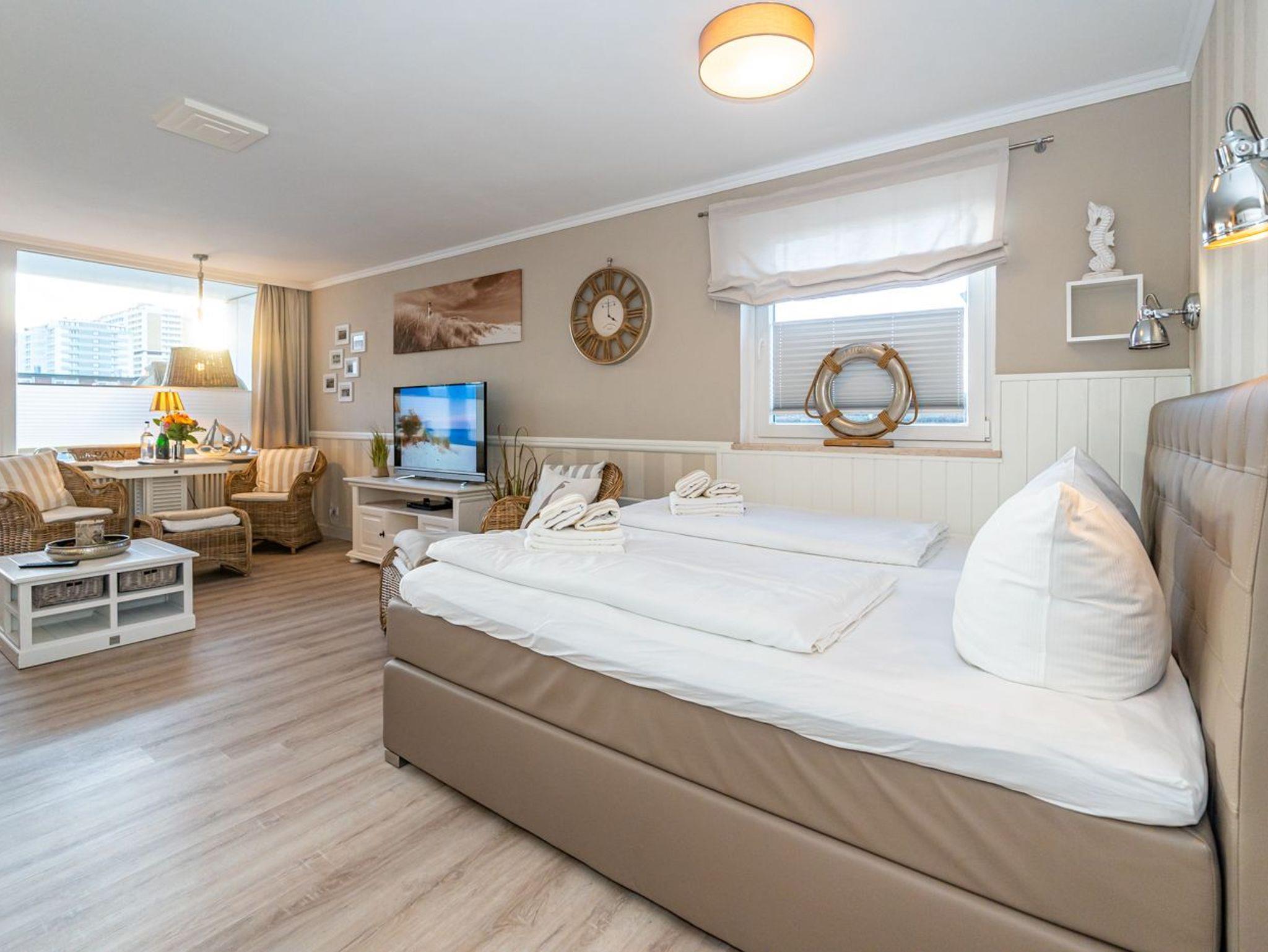 Im kombinierten Wohn-/Schlafraum lässt die Ausstattung mit 49-Zoll-Flachbild-TV, Radio, DVD- und BluRay-Player, CD-Player, MP3-Player, Bluetooth-Lautsprecher keine Wünsche offen. Des Weiteren sorgt ein hochwertiges Boxspringbett (durchgehender Topper ca. 1,80 x 2,00 Meter) für traumhaften Schlafkomfort, Dünenblick inklusive.