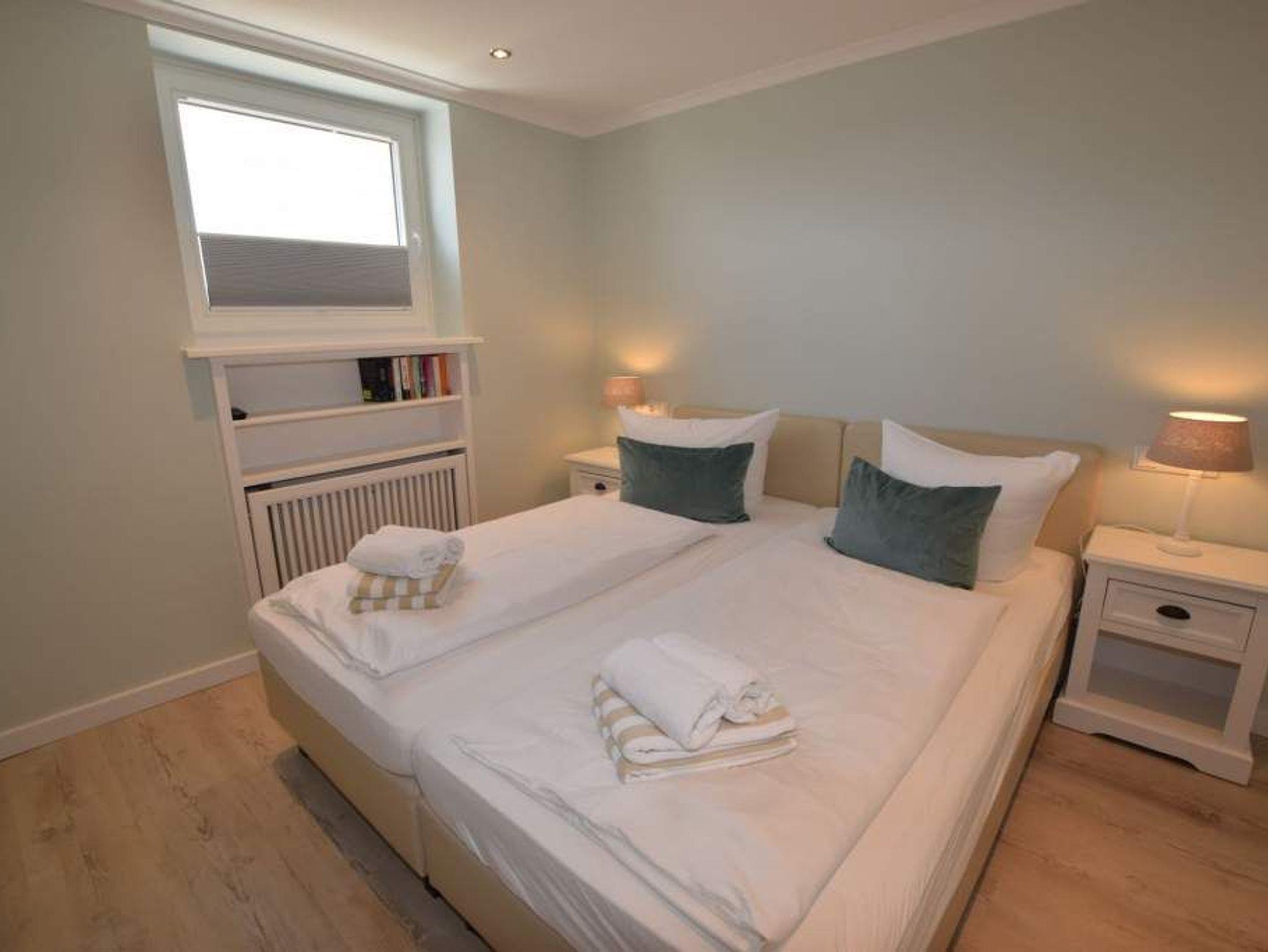 Das Schlafzimmer ist mit einem komfortablen Boxspring-Doppelbett (Liegefläche 1,80 x 2,00m, Einzelmatratzen) ausgestattet. Auf Wunsch kann das Bett in zwei Einzelbetten umgewandelt werden. Im neuen, großzügigen Badezimmer befinden sich eine Dusche mit extra flachem Einstieg, zusätzlich eine kleine Badewanne, ein Waschtisch, ein Handtuchtrockner, sowie WC.