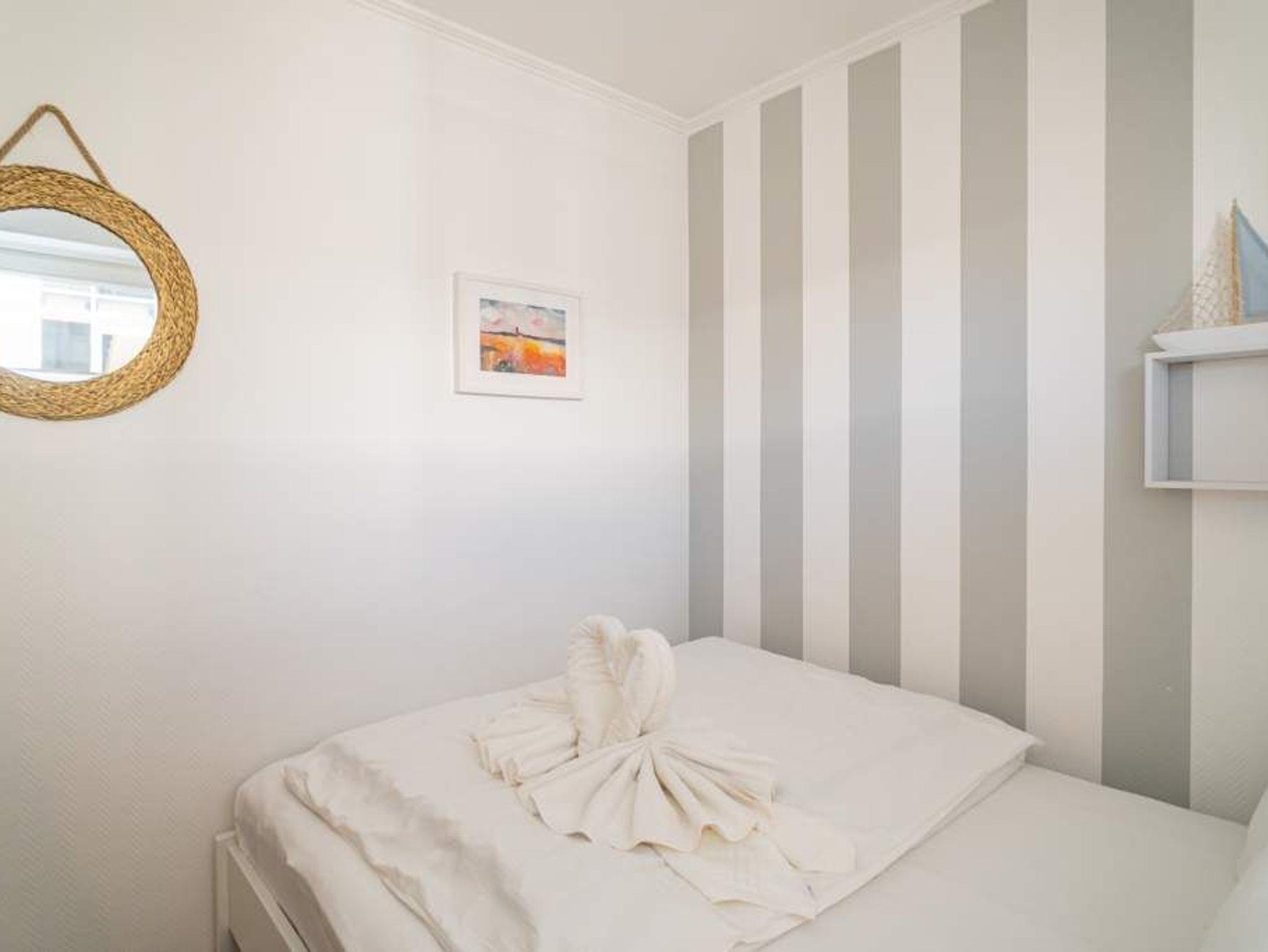 Das Schlafzimmer ist mit einem kleinen Doppelbett (1,40 m x 2,00 m, mit einseitigem Einstieg) ausgestattet.