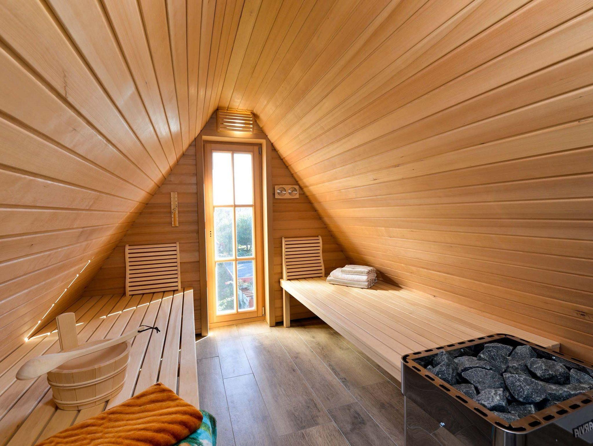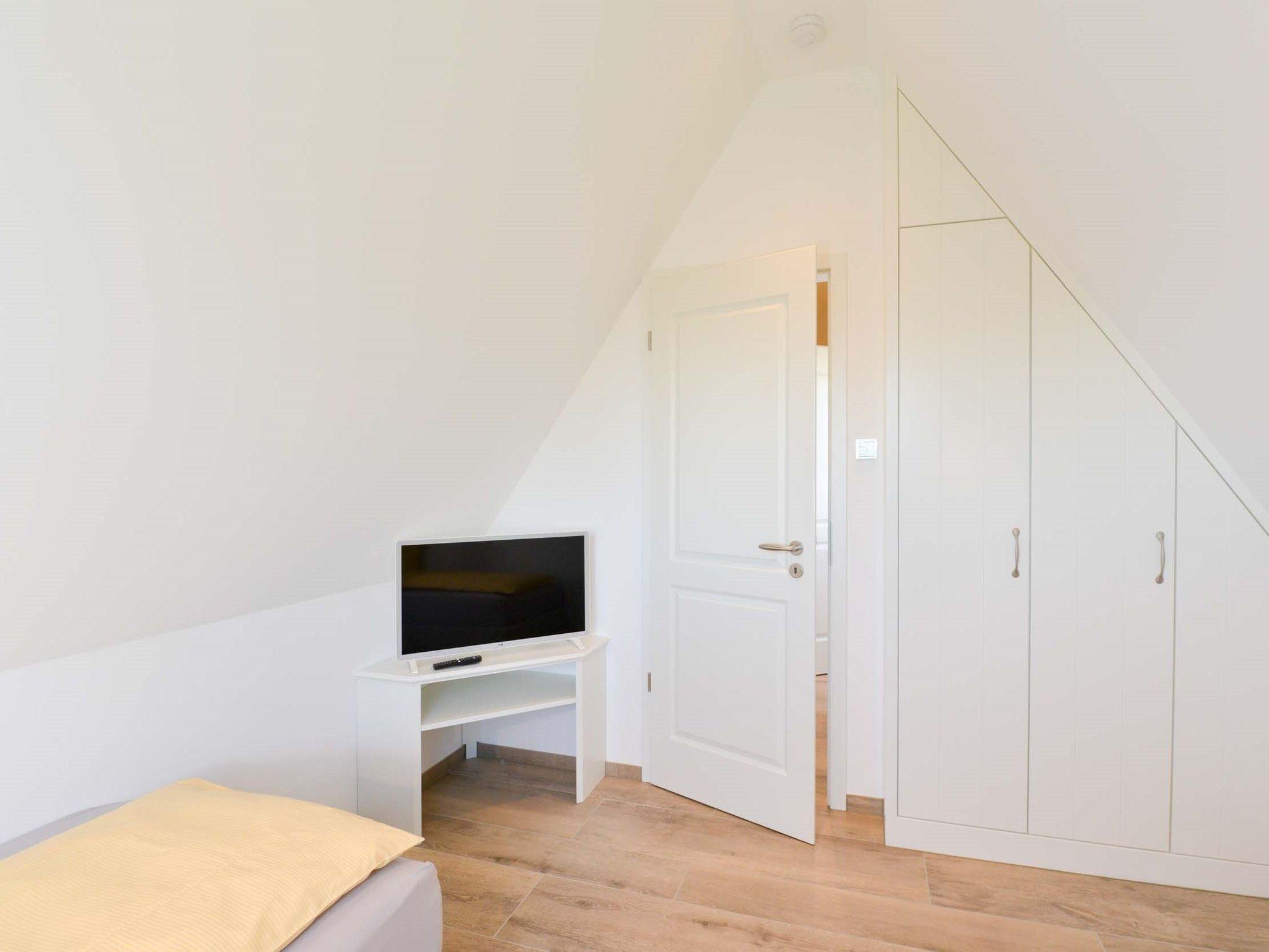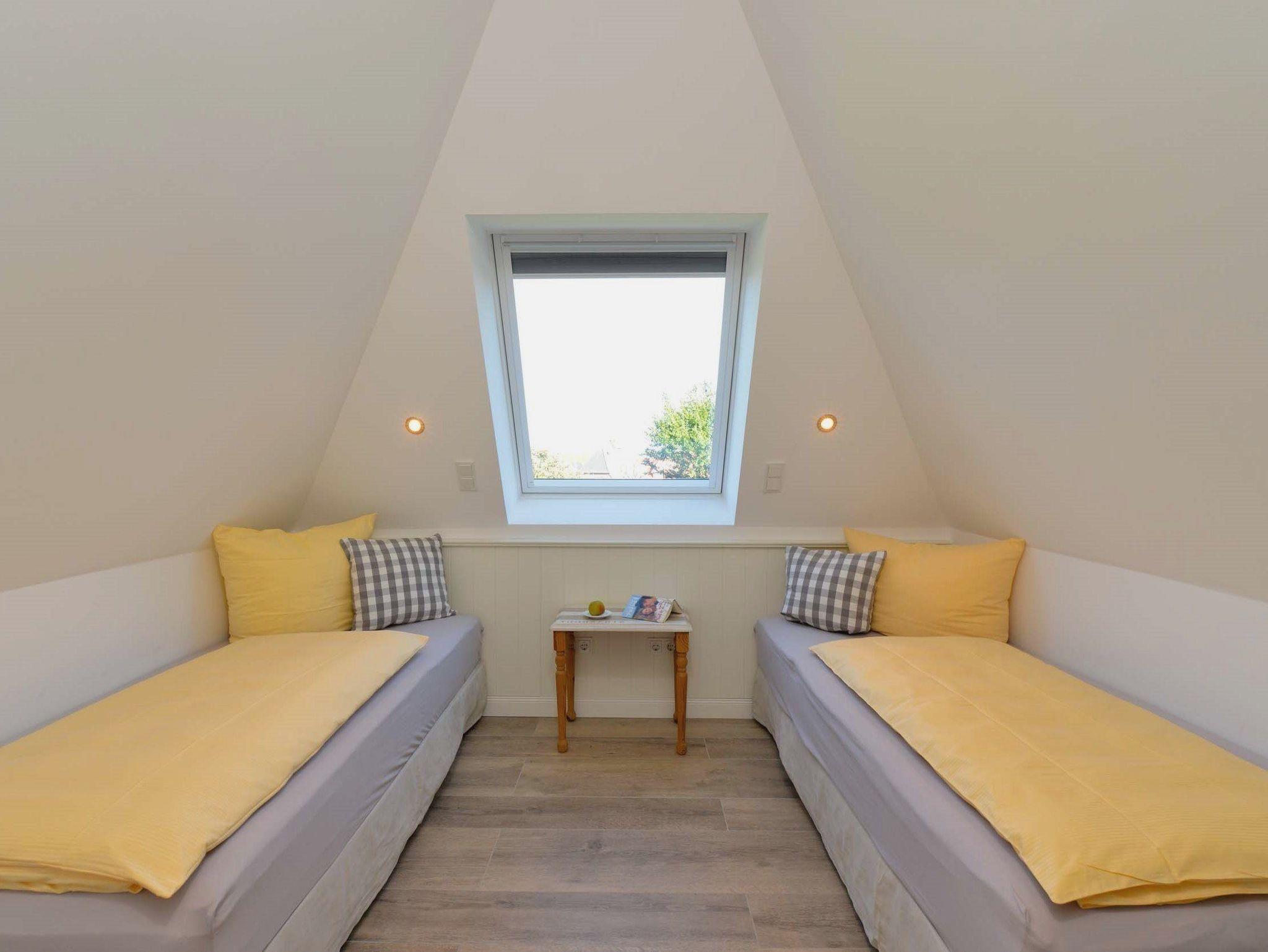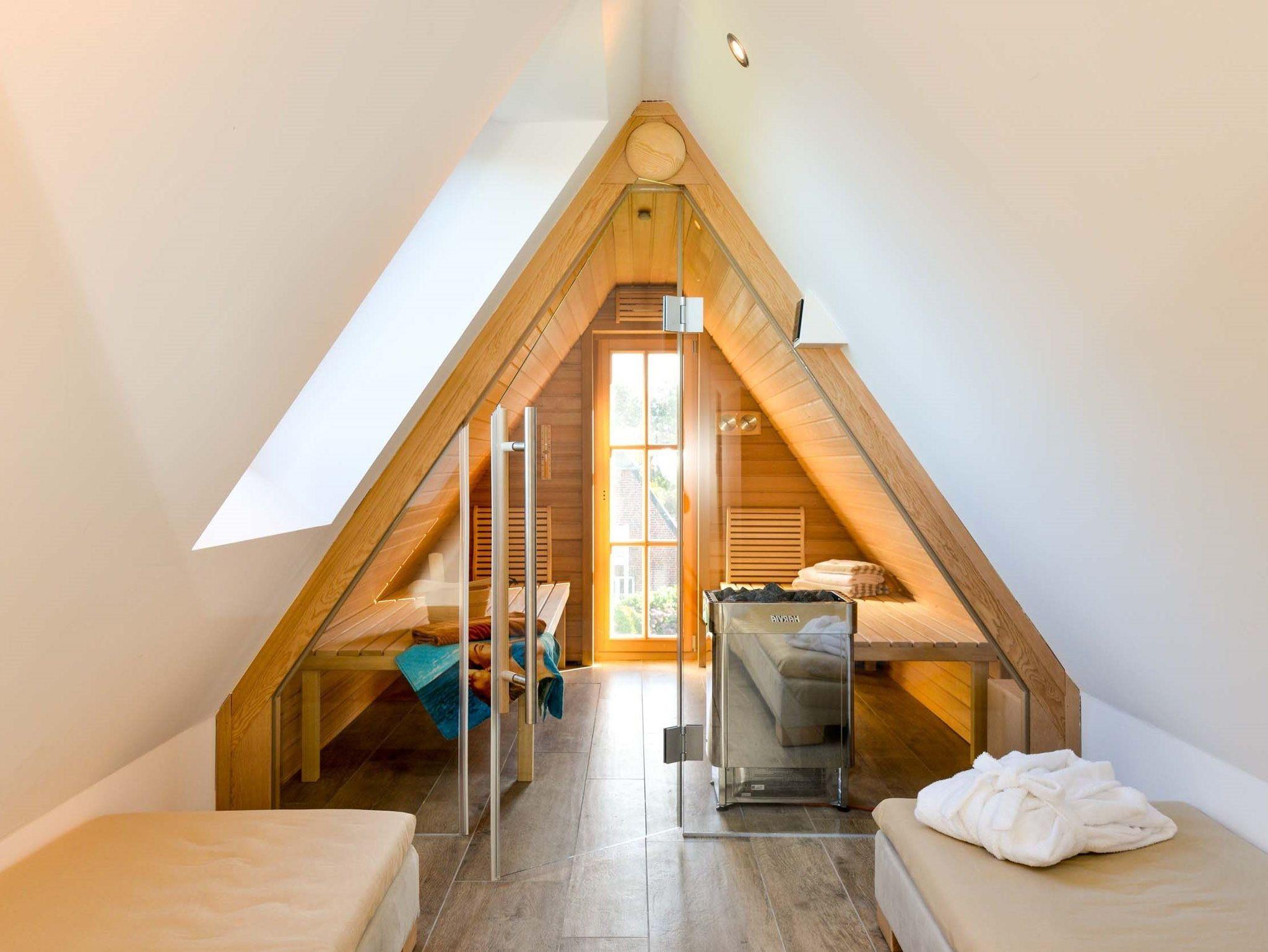 Im Spitzboden gibt es ein weiteres Schlafzimmer mit zwei Einzel-Boxspringbetten, die auf Wunsch zusammengestellt werden können. Auch hier gibt es ein Duschbad sowie eine Sauna.