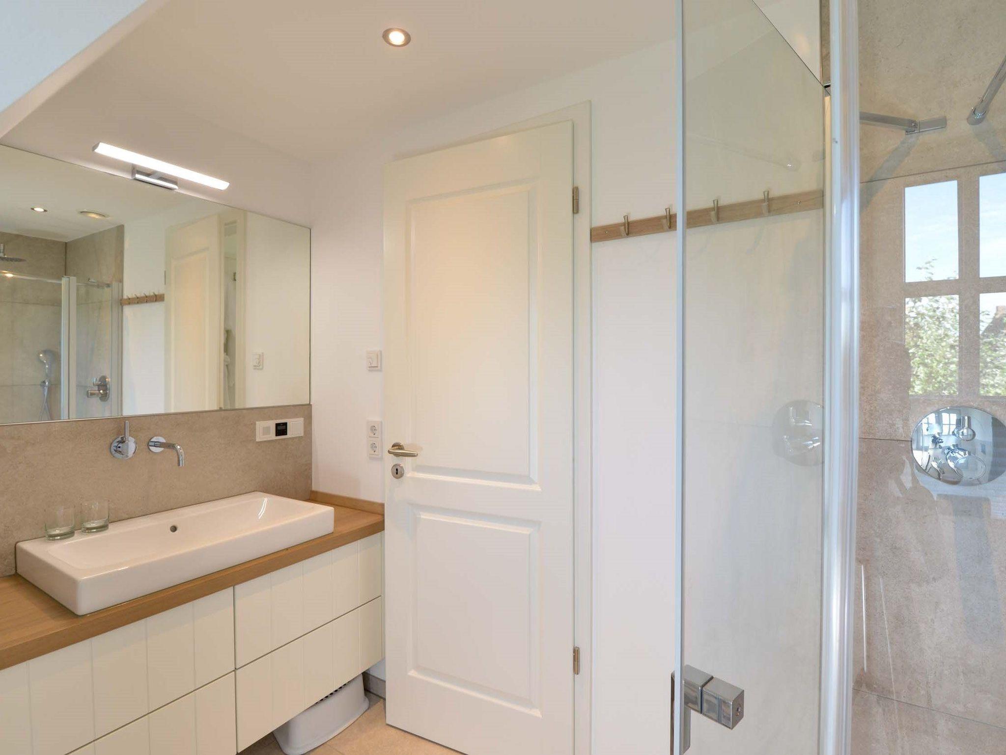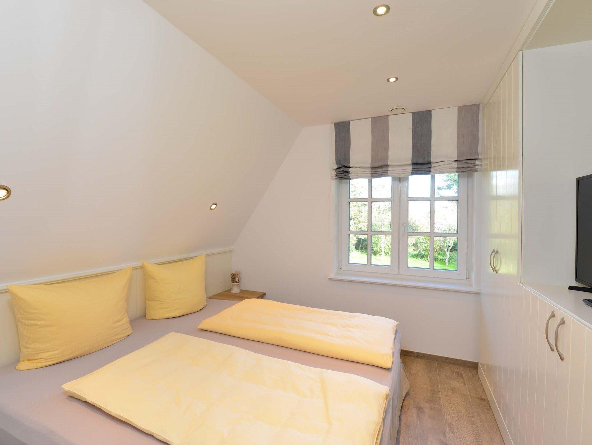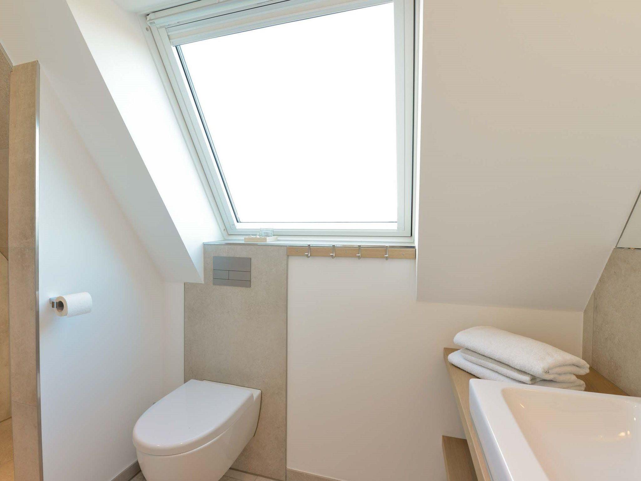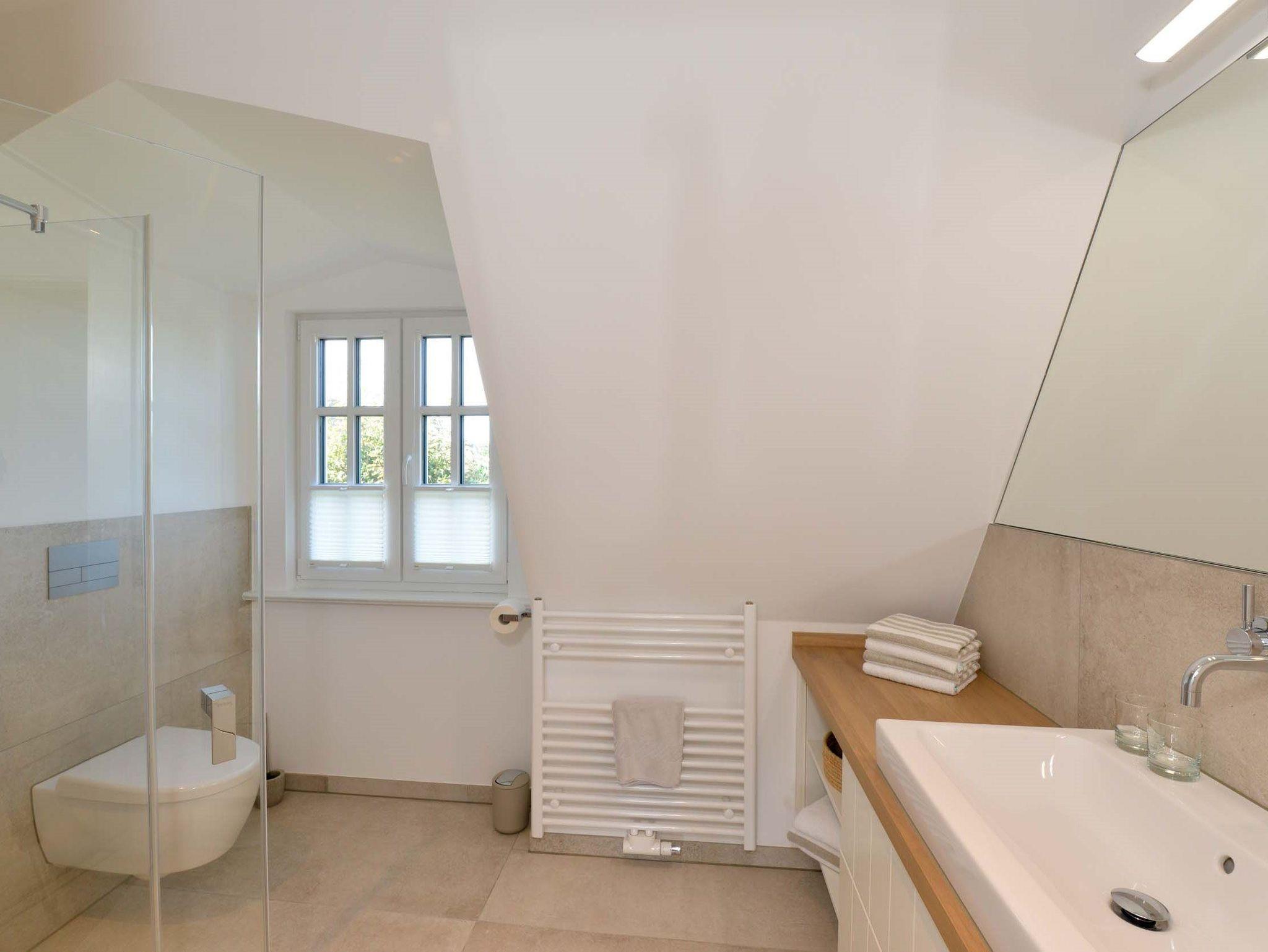 Im Spitzboden gibt es ein weiteres Schlafzimmer mit zwei Einzel-Boxspringbetten, die auf Wunsch zusammengestellt werden können. Auch hier gibt es ein Duschbad sowie eine Sauna.
